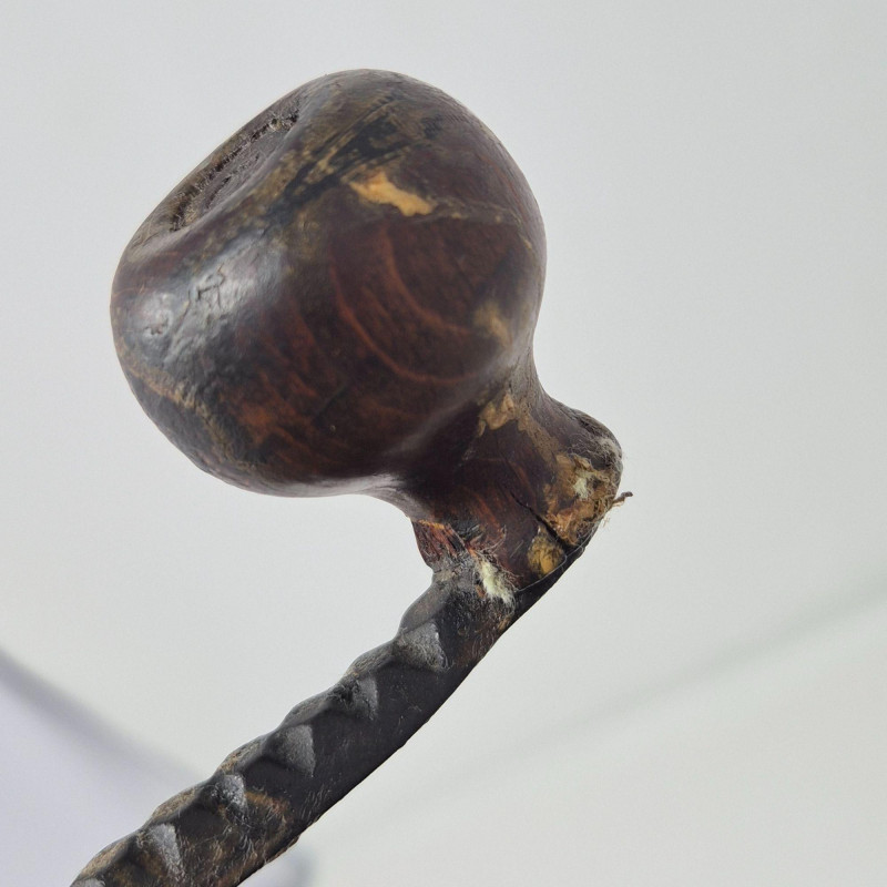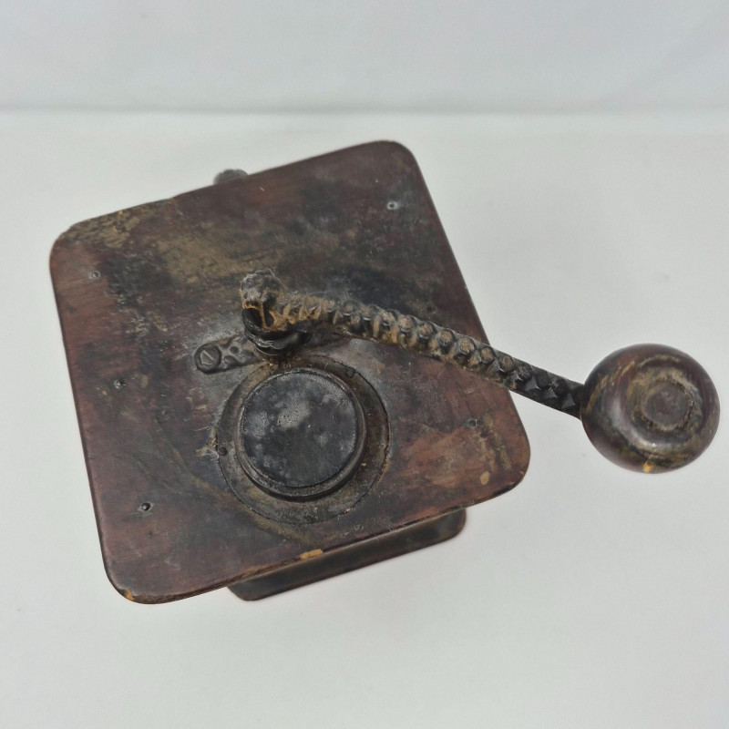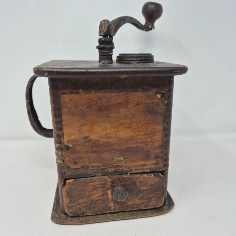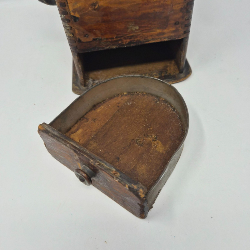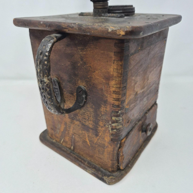 A charming antique wood coffee grinder with a rustic finish and classic hand-crank mechanism. This piece features: