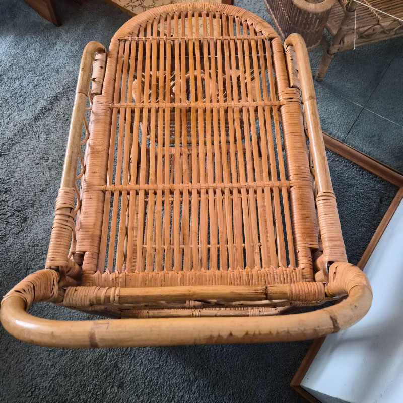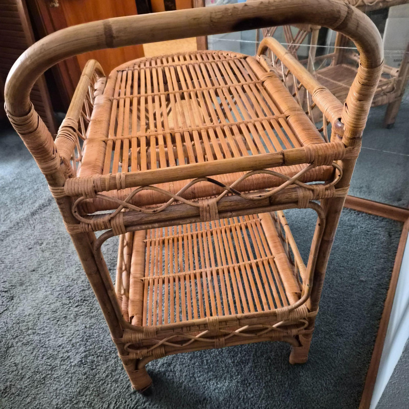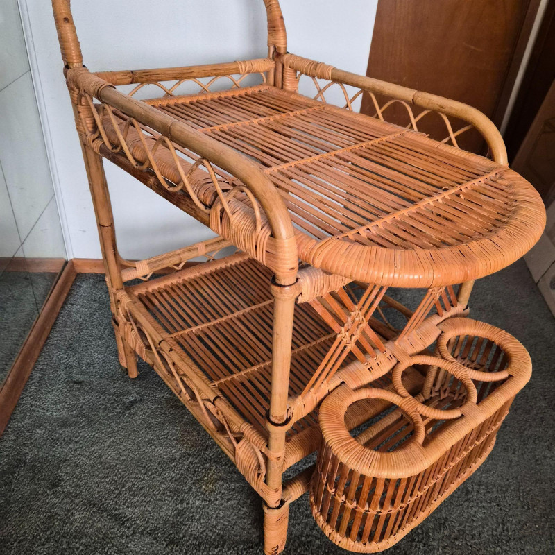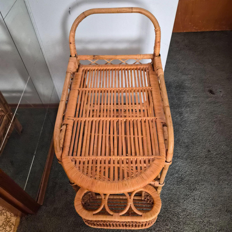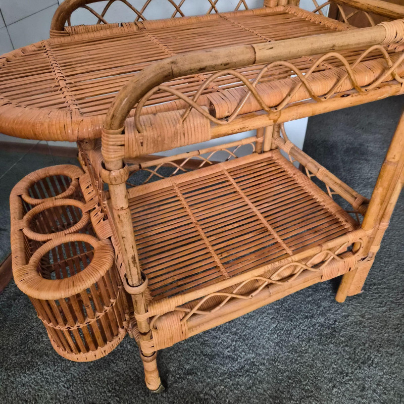 A versatile vintage wicker serving cart with a built-in wine rack, perfect for hosting or stylish storage. This piece features: Ideal for patios, dining rooms, or bar areas, this cart blends function and flair, offering a relaxed yet refined way to serve and store