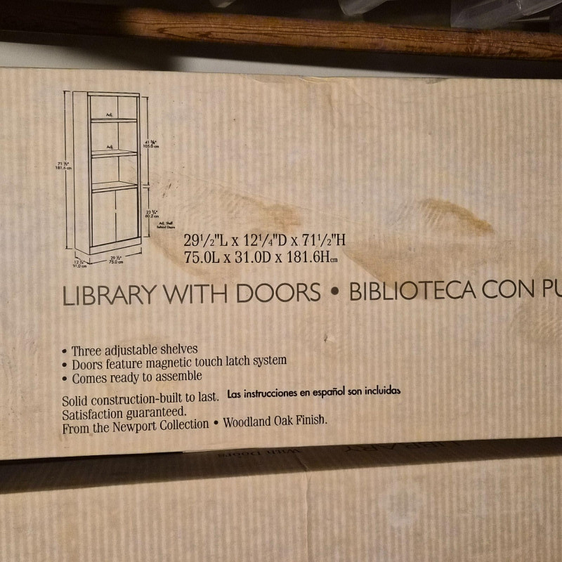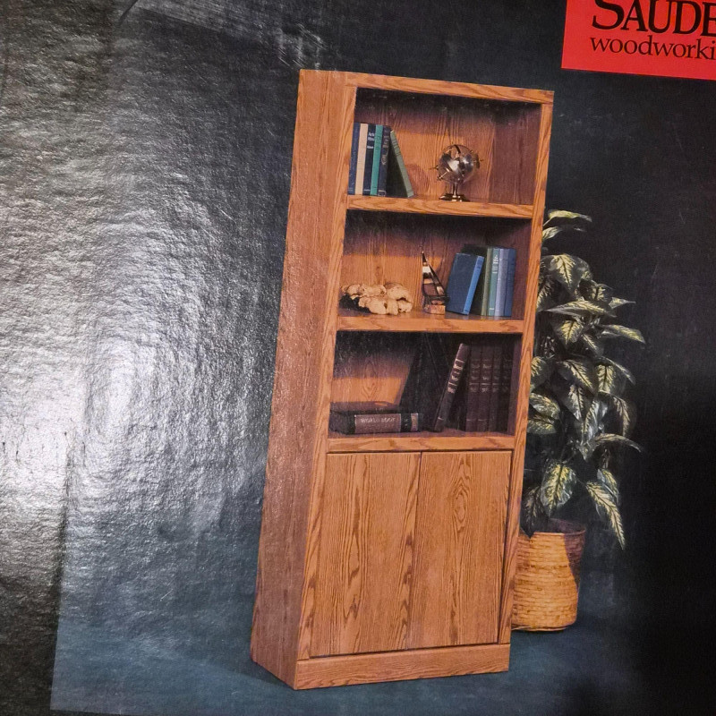 A new-in-box Sauder library cabinet from the Newport Collection, featuring a warm Woodland Oak finish and versatile storage design. This piece offers