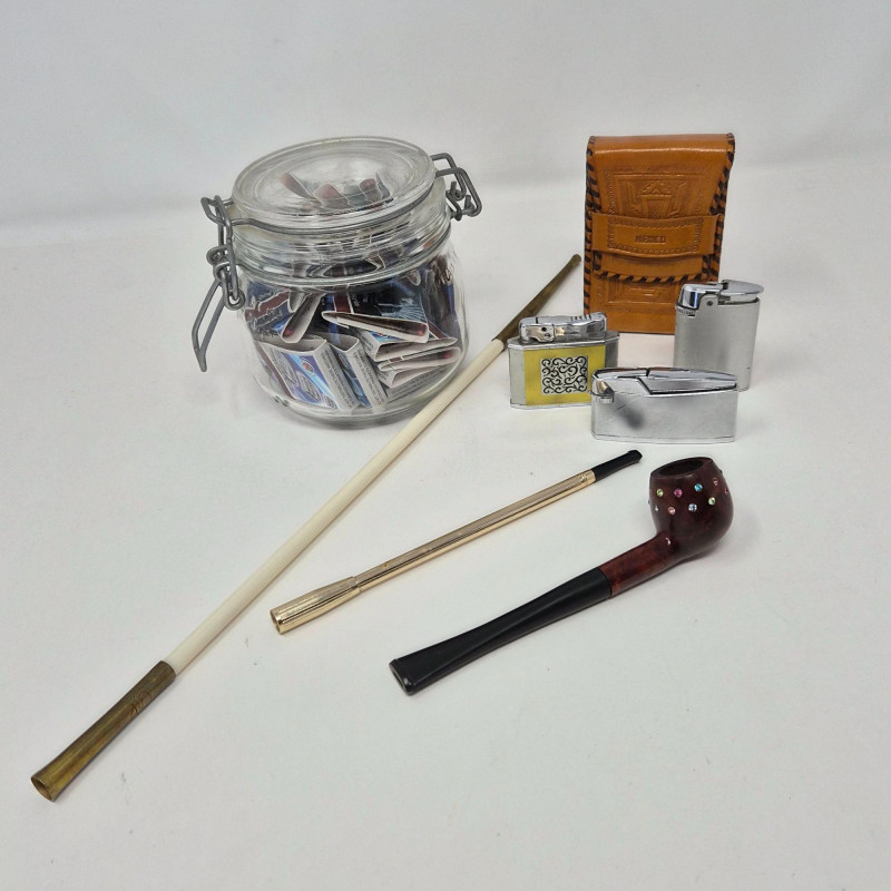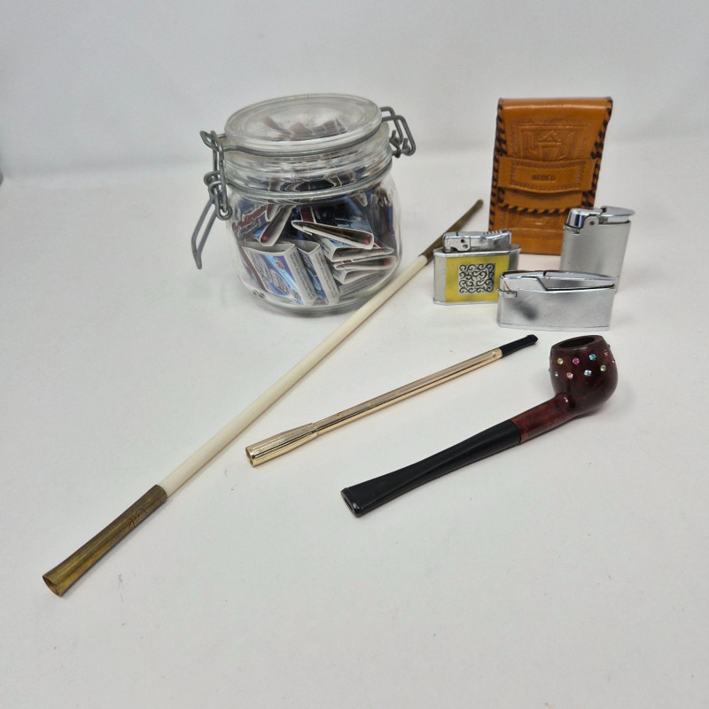 Collection of novelty and vintage smoking accessories, ideal for collectors, stylists, or display. This eclectic lot includes:
