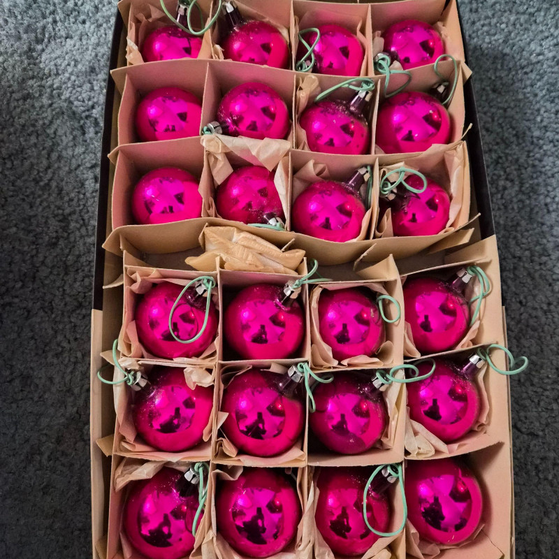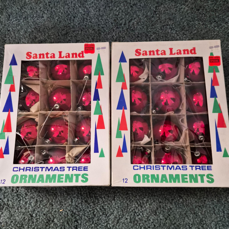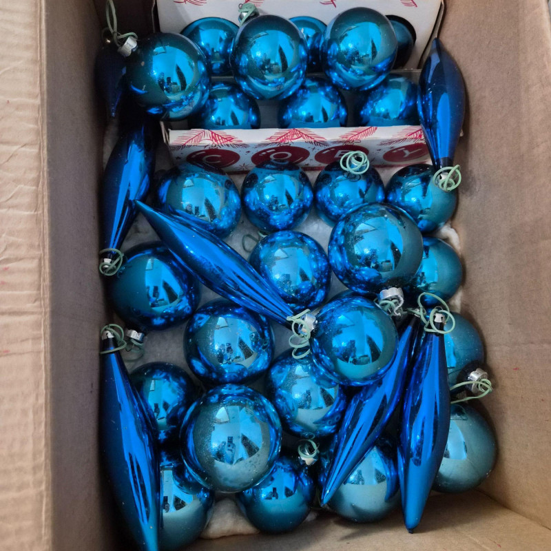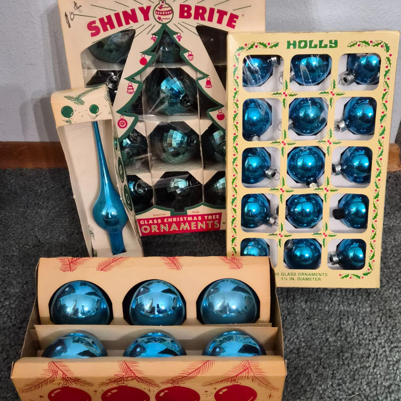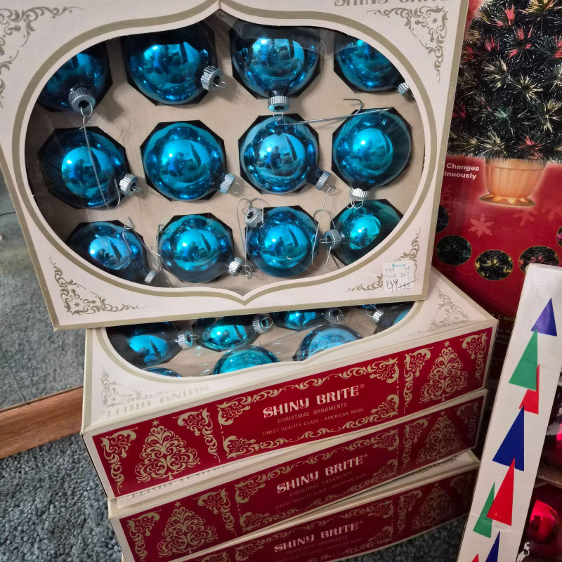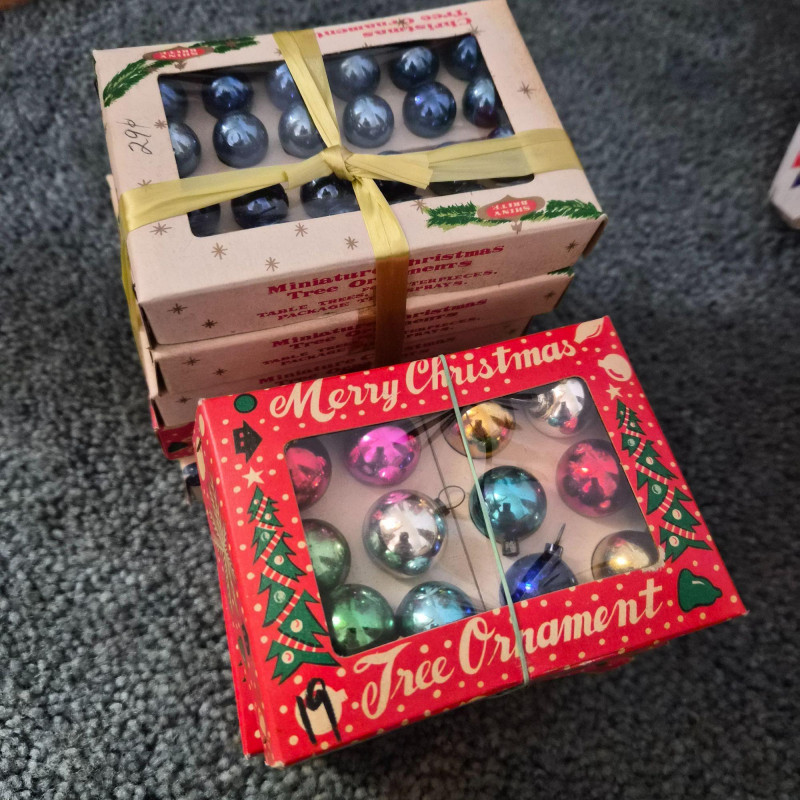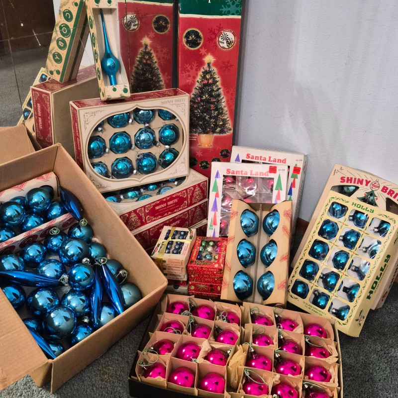 A cheerful holiday bundle featuring: The ornaments offer timeless sparkle: larger balls in reds, blues - and mini glass balls in red, blue, golds, and greens. The fiber optic tree adds a touch of early-tech magic. Ideal for collectors, decorators, or anyone curating a nostalgic holiday scene.