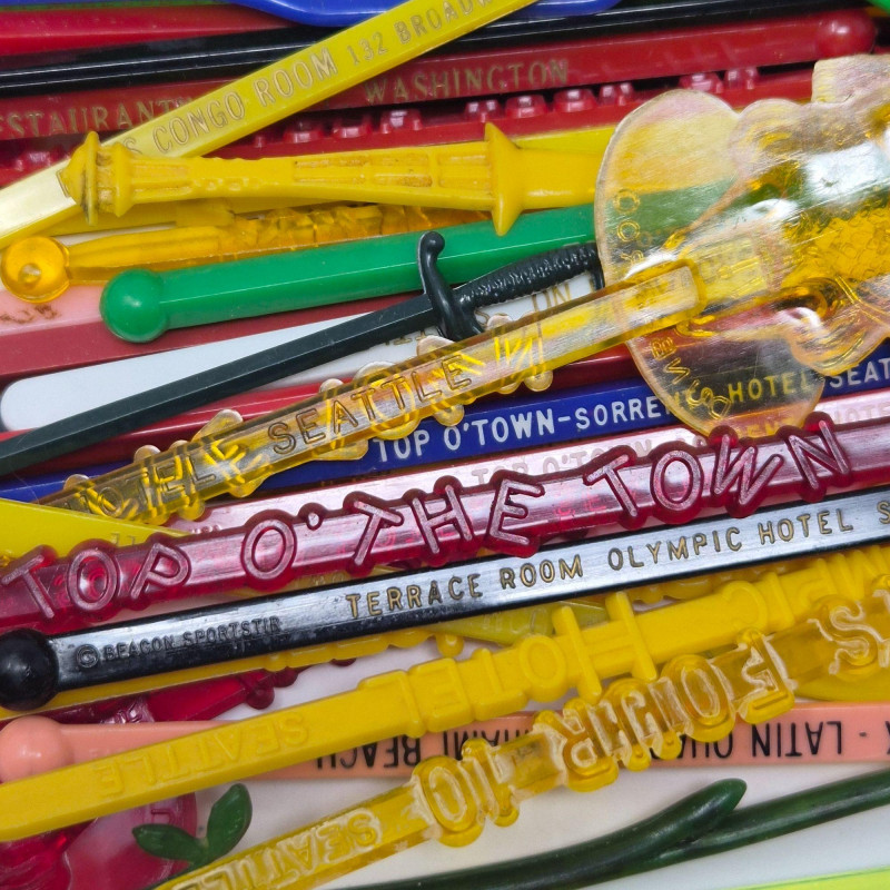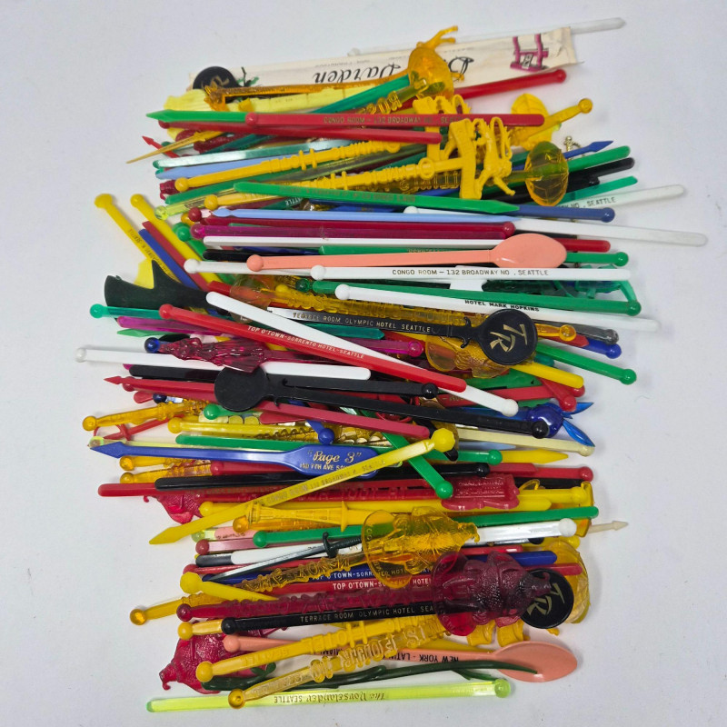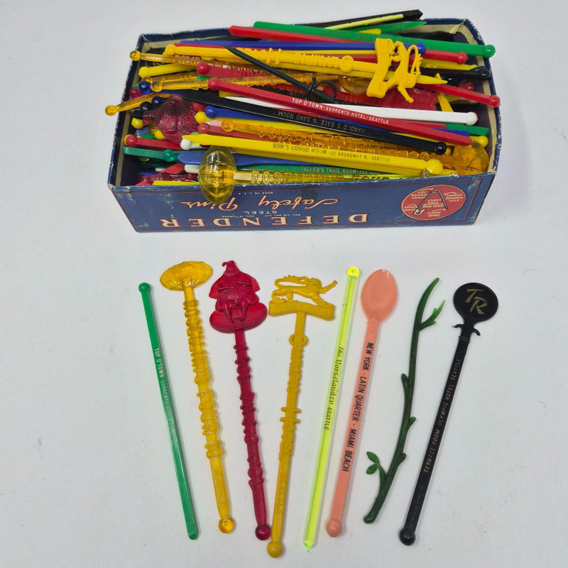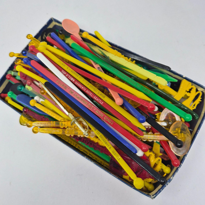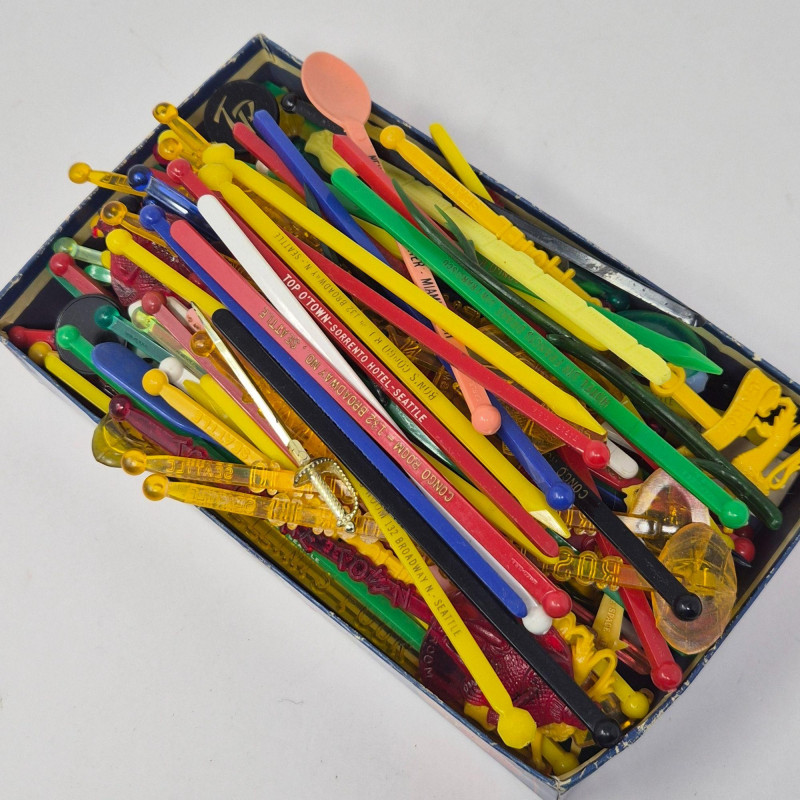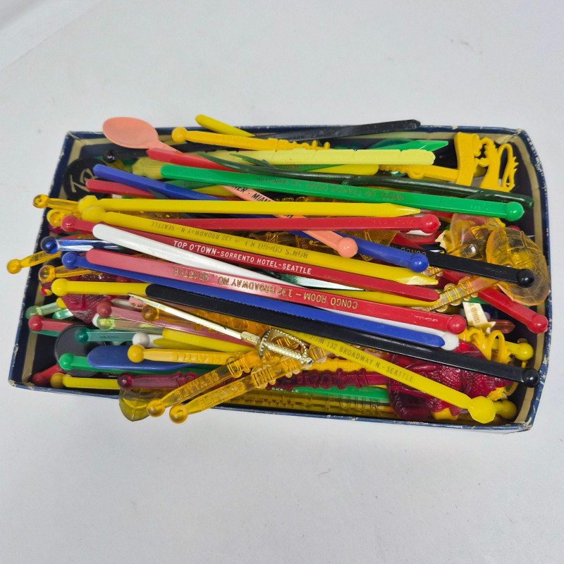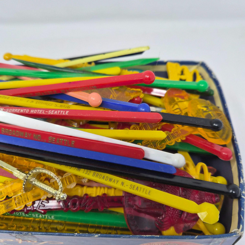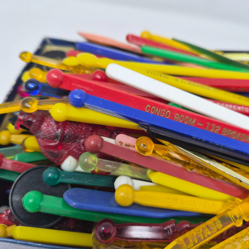 A vibrant bundle of vintage plastic swizzle sticks, each a tiny billboard of bygone glamour. This collection features: Whether you're a tiki enthusiast, a collector of ephemera, or just love a good stir, this lot is a toast to the golden age of hospitality branding.