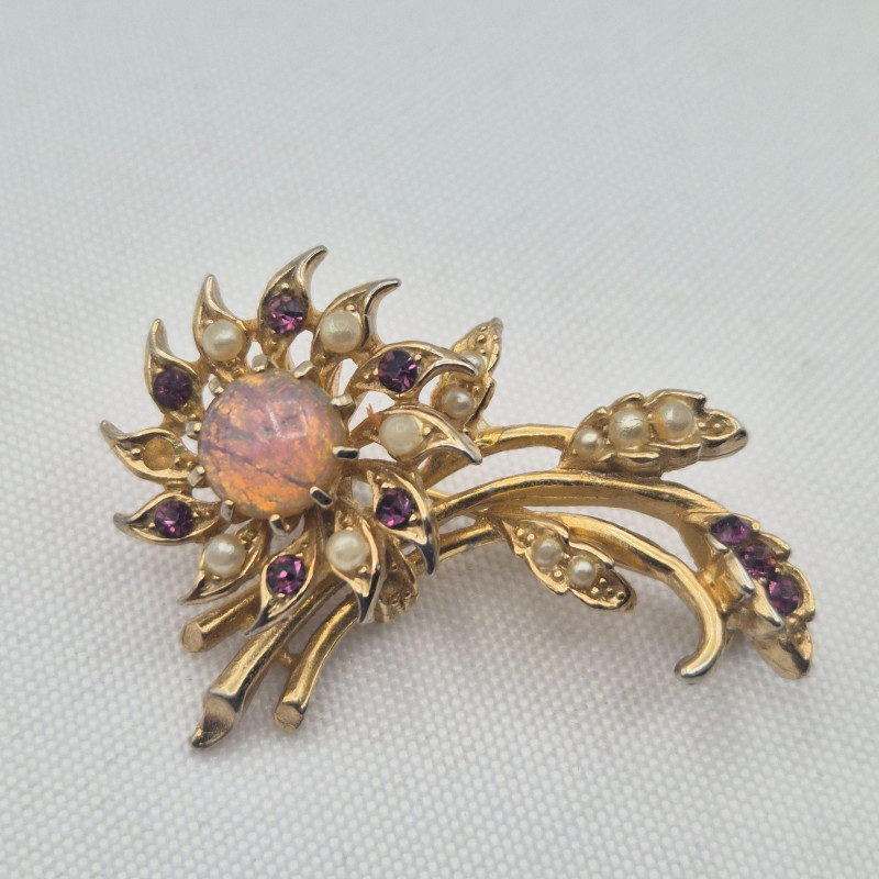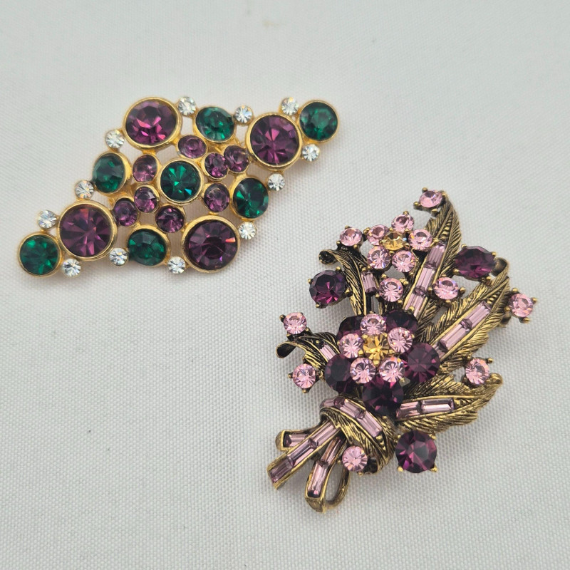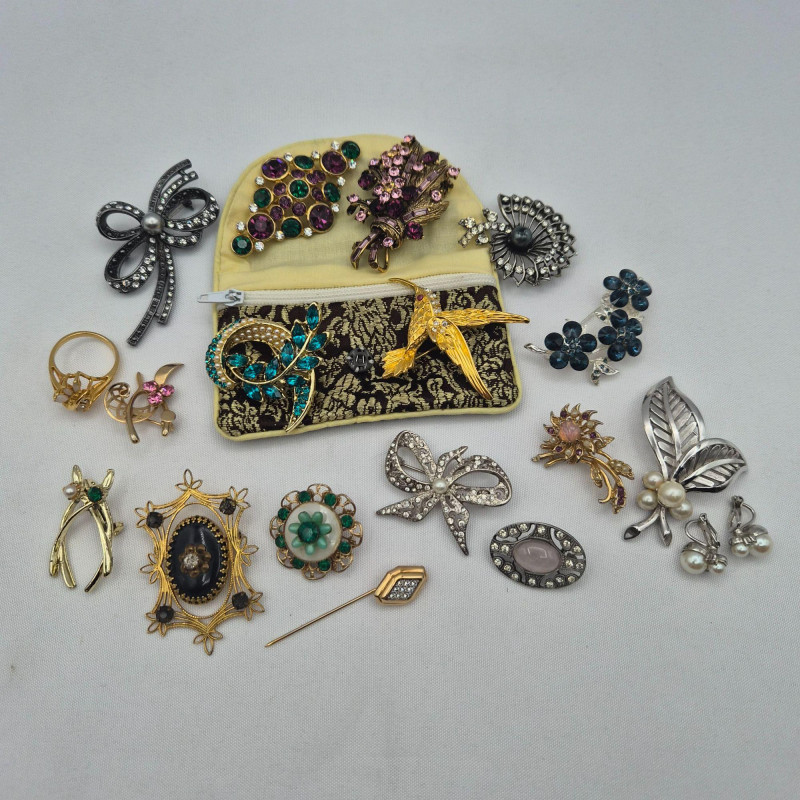A jubilant jubilee of colorful vintage brooches, earrings, and cocktail ring, this lot is a treasure trove of whimsy and wearable nostalgia. Highlights include: Most pieces are mid-century to late 20th century, with a few likely from the 1990s.