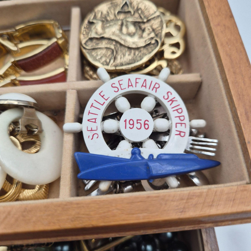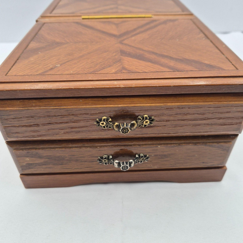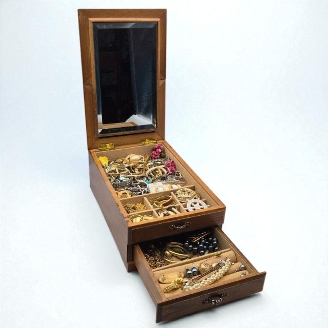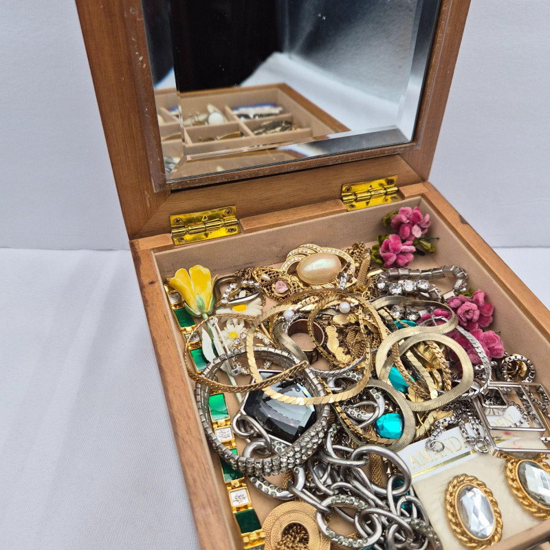 A delightful trove of fashion jewelry, tucked inside a mirrored wood jewelry box measuring 7" wide x 11" deep x 4" tall. This treasure chest includes: