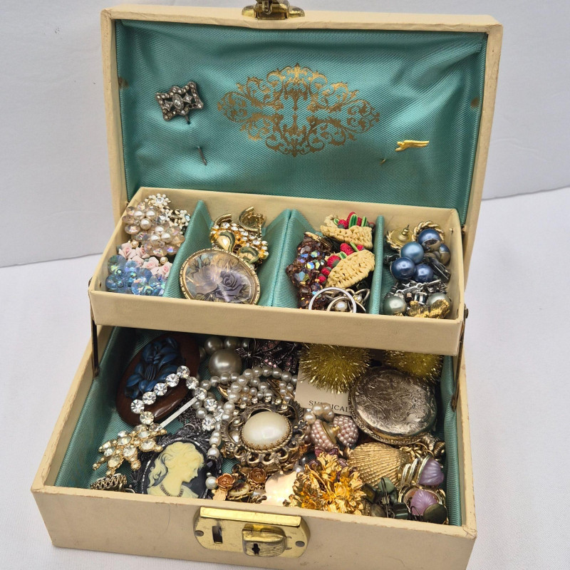 Lot # 119 - Vintage Jewelry Box with Fashion Finds – Brooches, Earrings & More