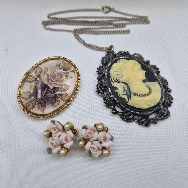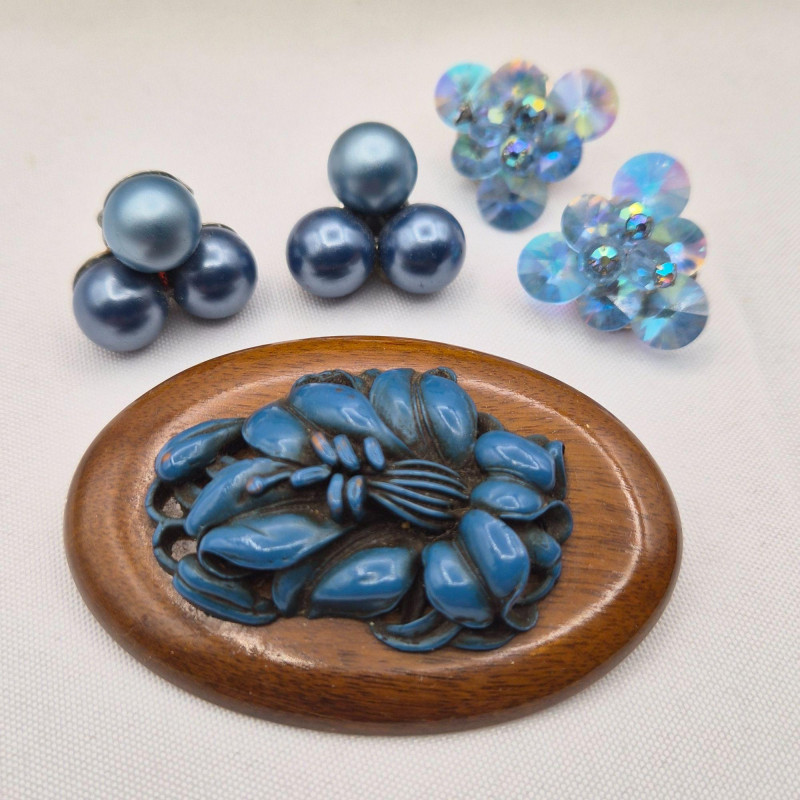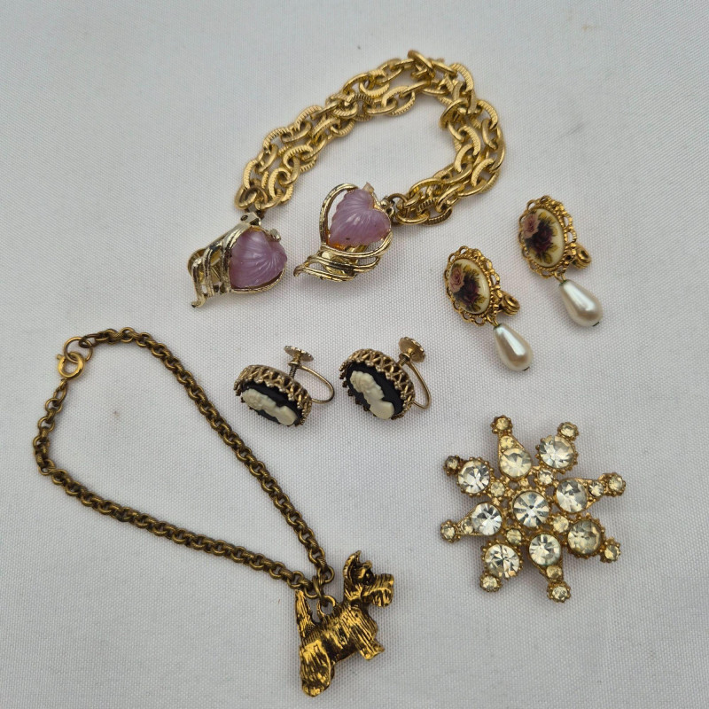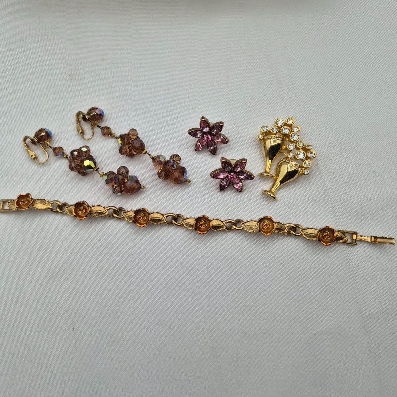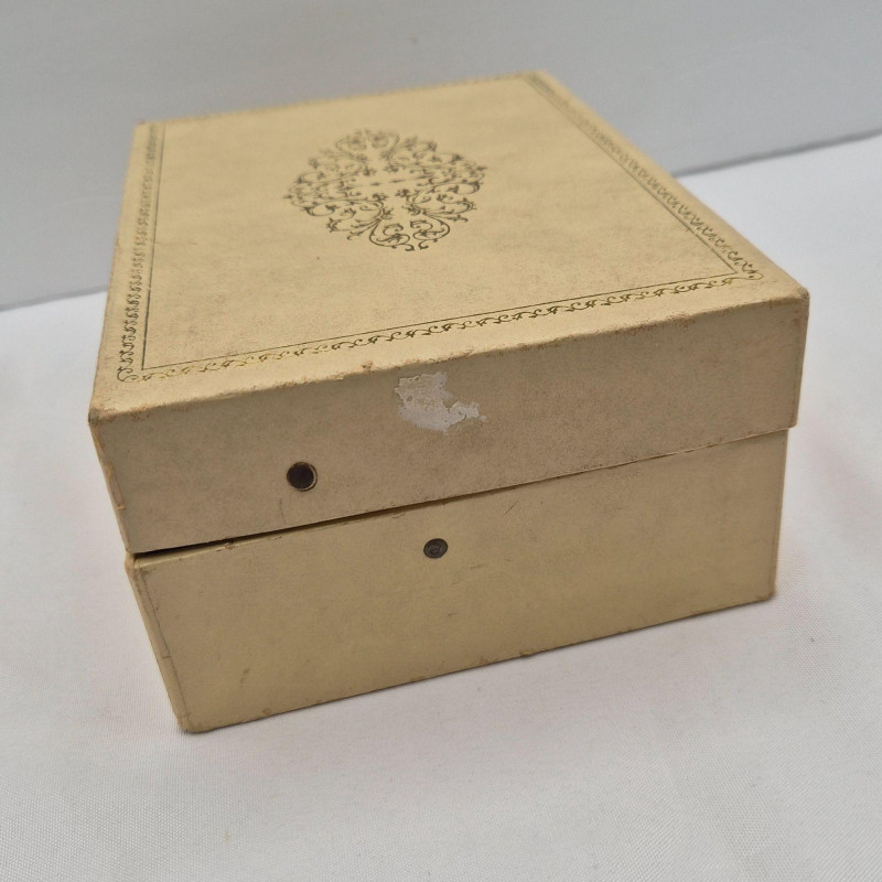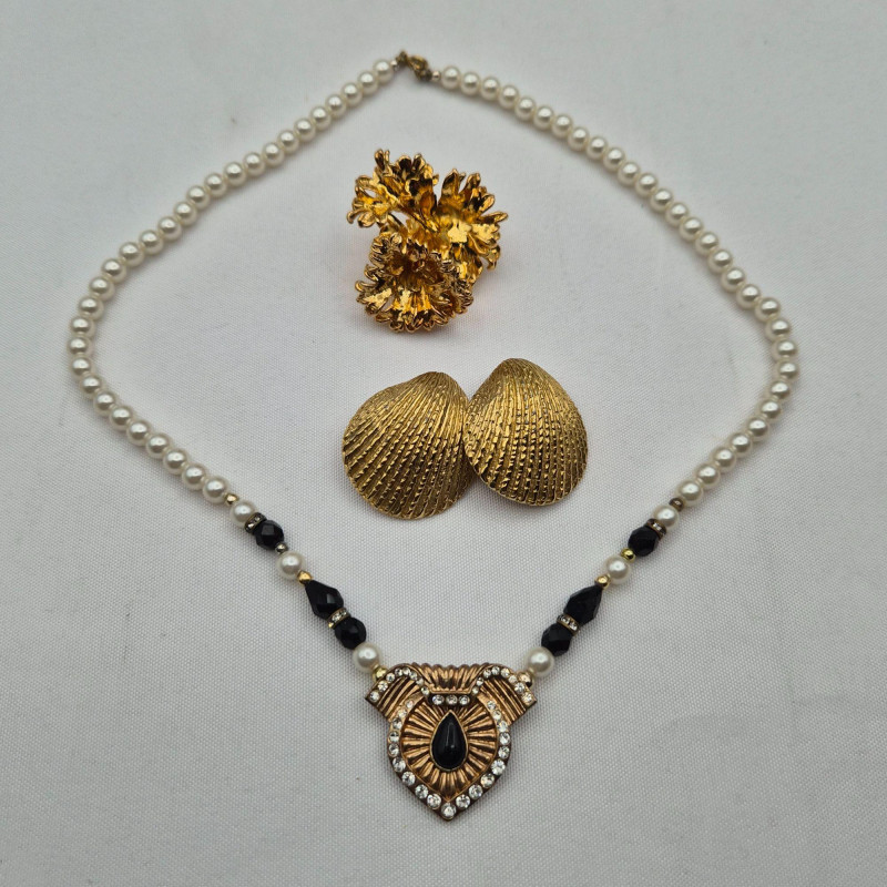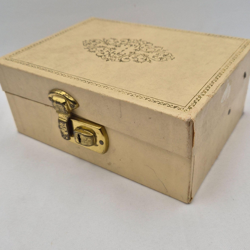 A charming vintage box filled with fashion jewelry treasures, offering a delightful mix of styles and eras. Measuring 7.5" wide x 5.5" deep x 3" high, this collection includes:
