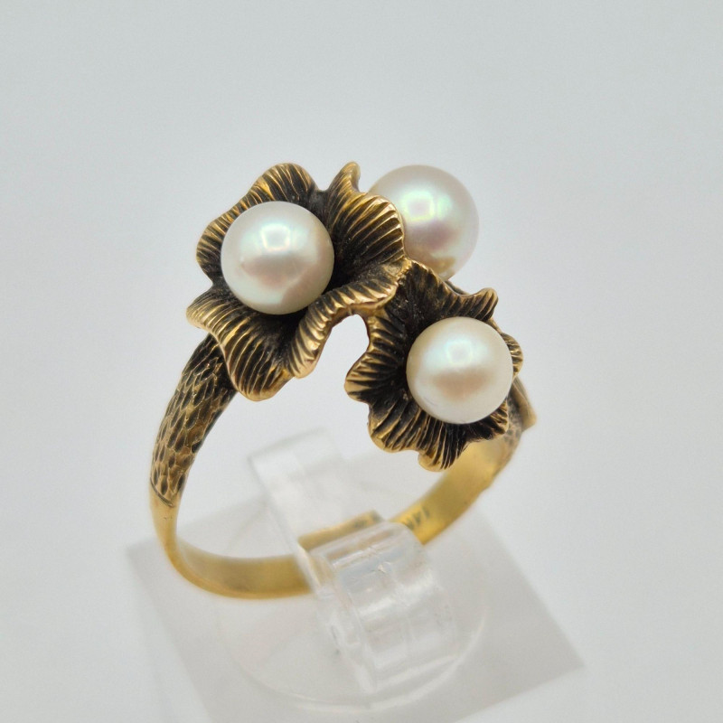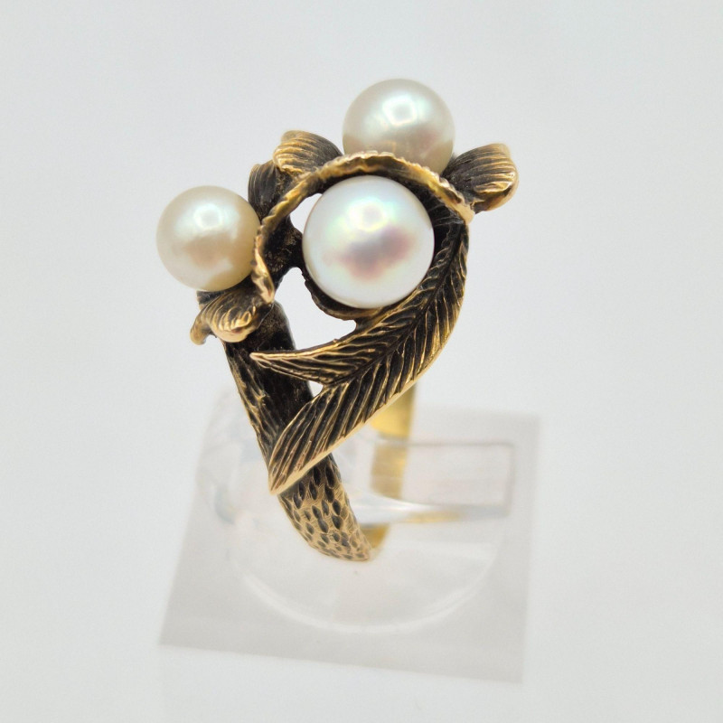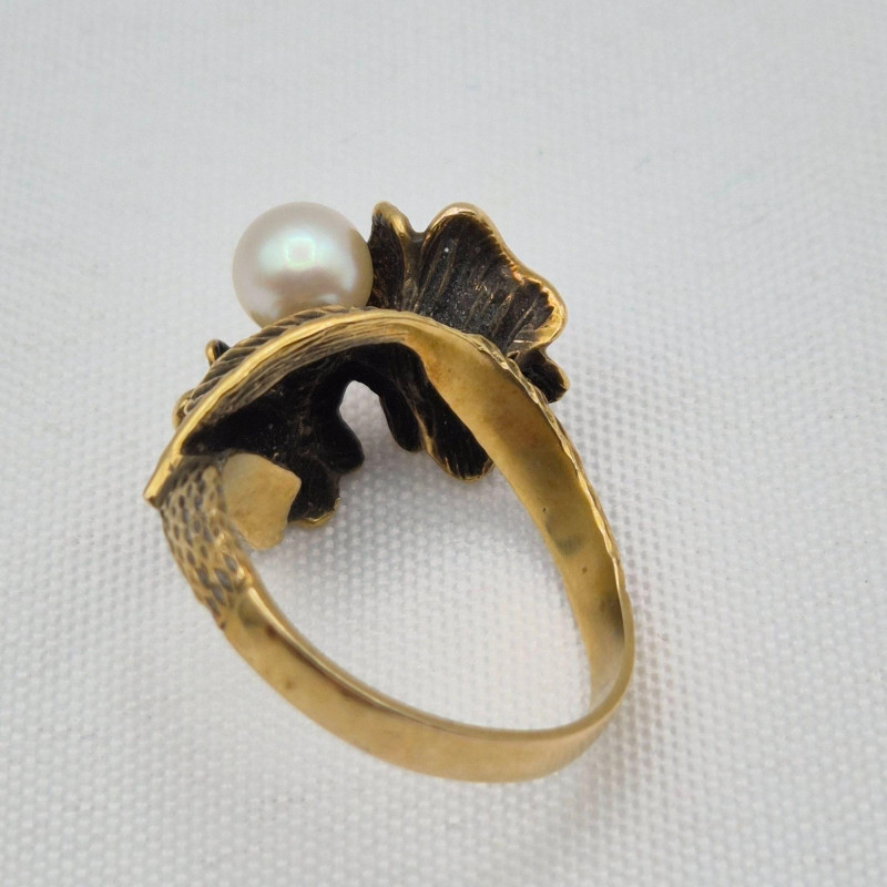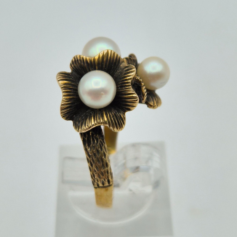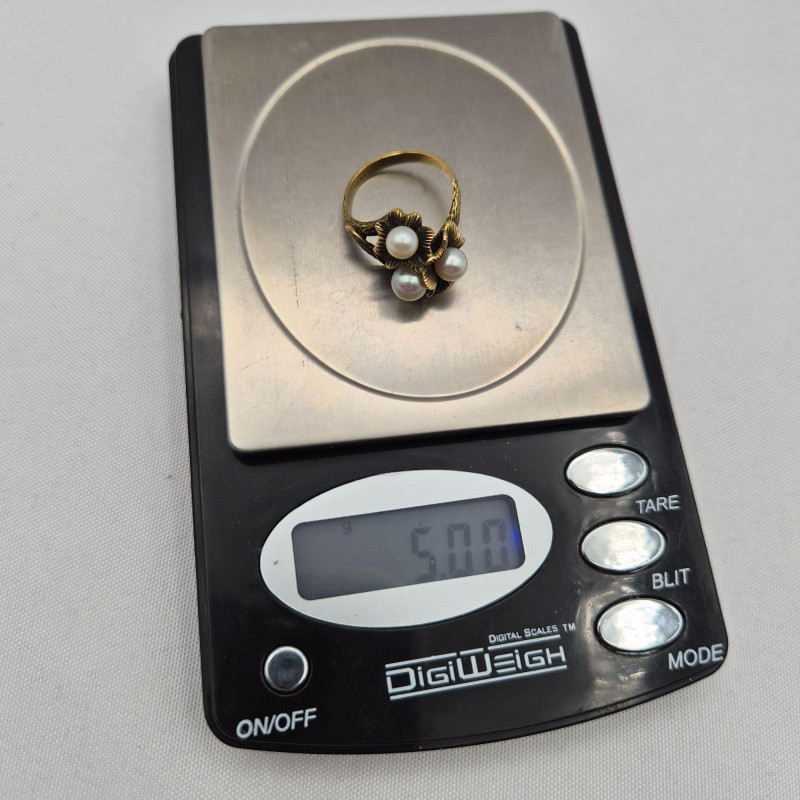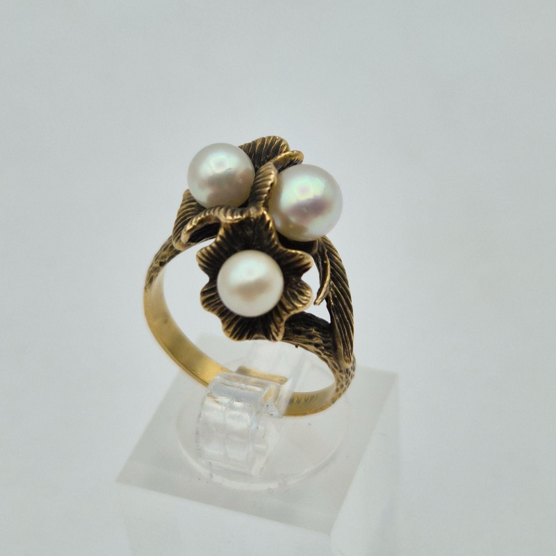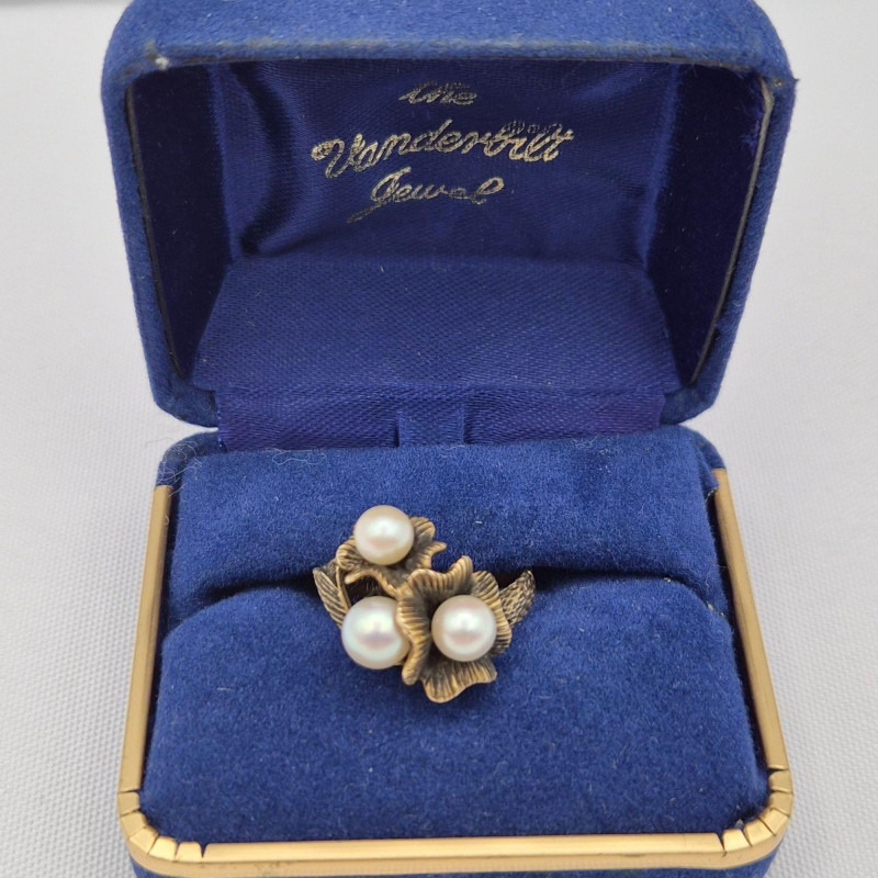 A graceful Art Nouveau-style ring in 14k yellow gold, featuring a floral cluster setting of genuine pearls. This romantic piece evokes turn-of-the-century elegance with its organic curves and a nature-inspired flower design. ($800+ value) Ideal for collectors, stylists, or anyone drawn to antique-inspired jewelry with emotional resonance. A timeless treasure that blends craftsmanship and sentiment.
