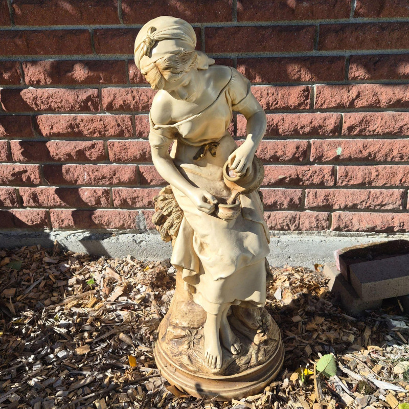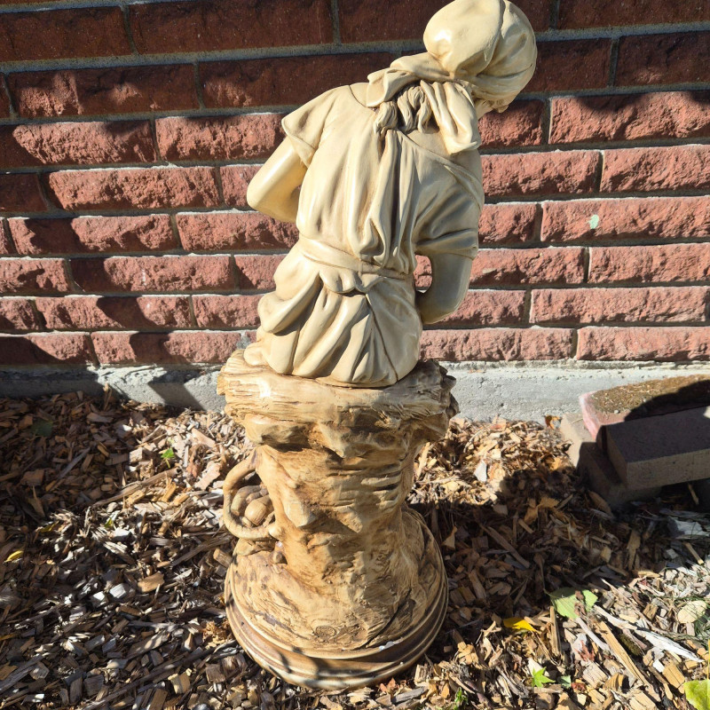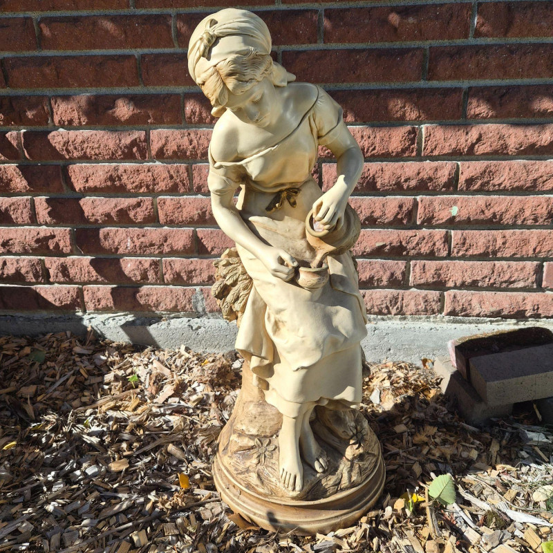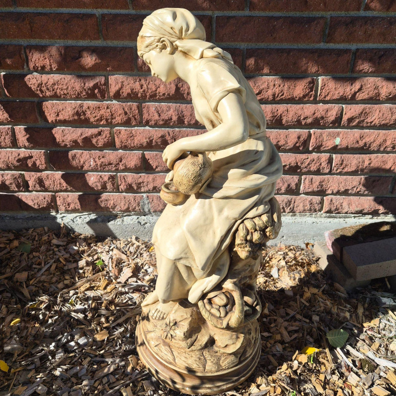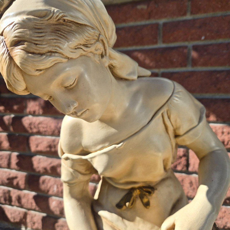 A nostalgic Marwal chalkware statue of a milkmaid, radiating pastoral grace and mid-century charm. Though it shows a couple of chips near the base, the wear adds character to its textured surface and vintage appeal. Whether you're curating a vintage vignette or adding personality to your patio, this milkmaid brings warmth, story, and sculptural charm.