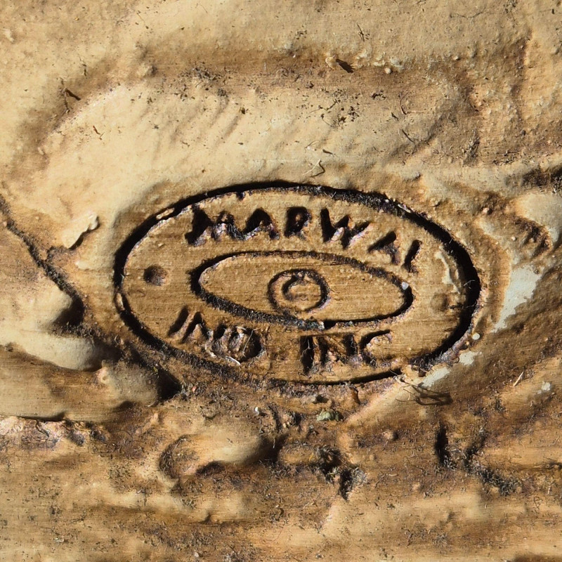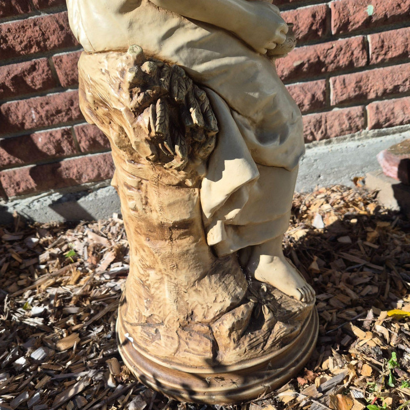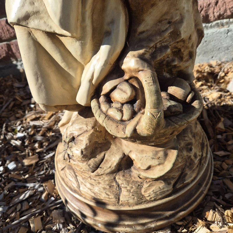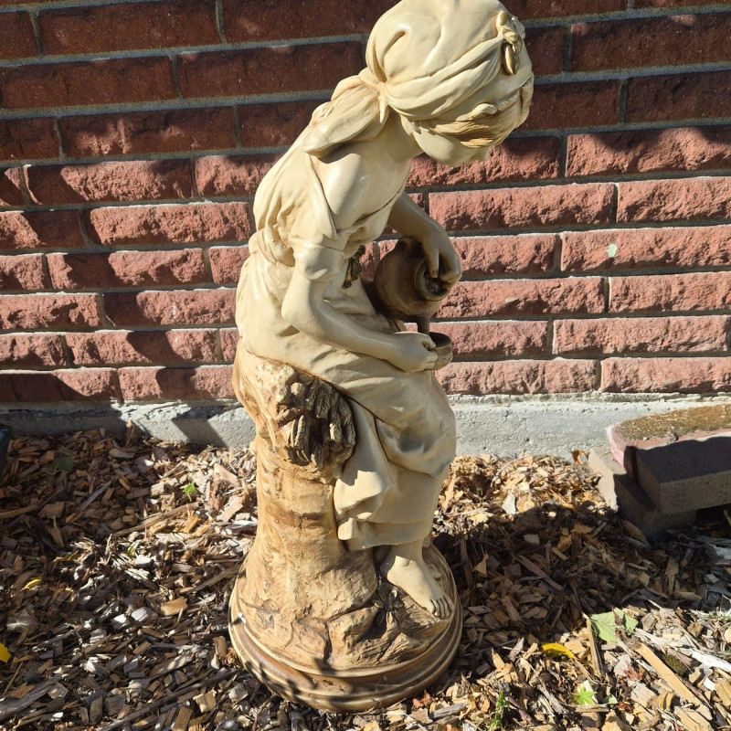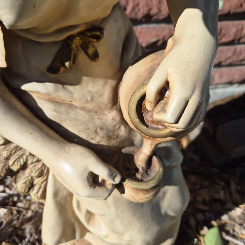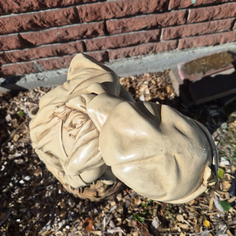 A nostalgic Marwal chalkware statue of a milkmaid, radiating pastoral grace and mid-century charm. Though it shows a couple of chips near the base, the wear adds character to its textured surface and vintage appeal. Whether you're curating a vintage vignette or adding personality to your patio, this milkmaid brings warmth, story, and sculptural charm.