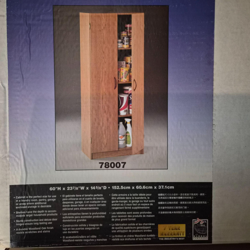 A brand-new-in-box Room Additions storage cabinet, featuring a clean-lined two-door design in a warm Woodland Oak finish (Style #78007). Measuring 60" tall x 24" wide x 15" deep, it offers versatile storage for any room—perfect for organizing linens, pantry goods, craft supplies, or office essentials. Due to its size and weight, bidding on this lot confirms agreement to bring at least two or more able-bodied individuals, an appropriate sized moving vehicle (NOTE MEASUREMENTS) and appropriate equipment (e.g., dollie, hand truck) for safe removal. Failure to comply may result in forfeiture without refund. No staff on site to assist with moving this item.