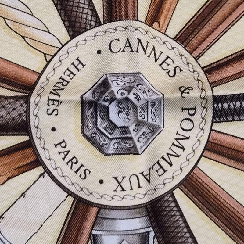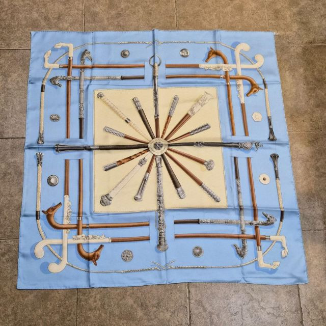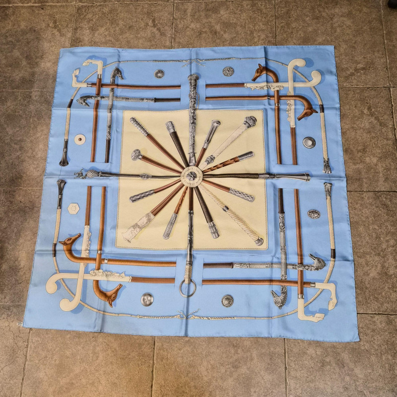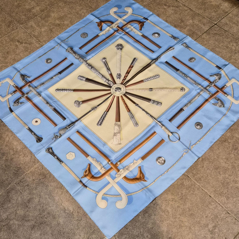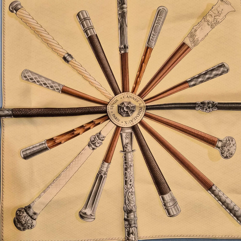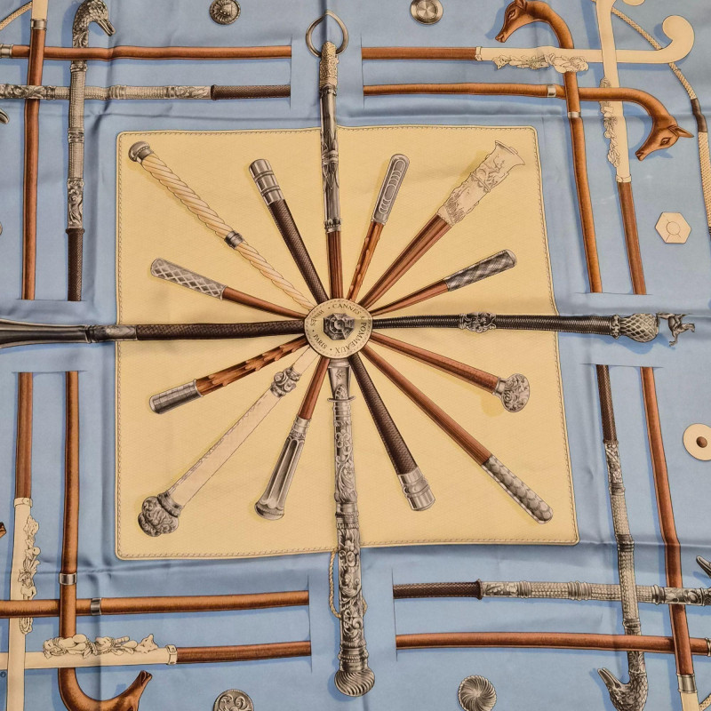 A timeless piece of French fashion heritage, this Hermès silk scarf measures a generous 34" x 34", ideal for dramatic neckwear, elegant head wraps, or handbag flair. Features a whimsical and elegant motif: a circular arrangement of ornate walking canes, radiating from a cream-colored center and framed by a sky-blue border. Each cane is rendered with exquisite detail.