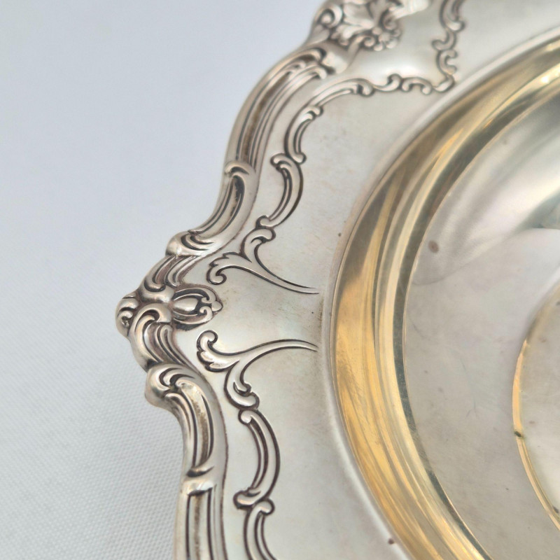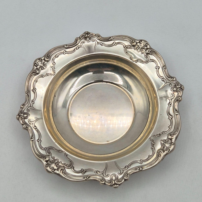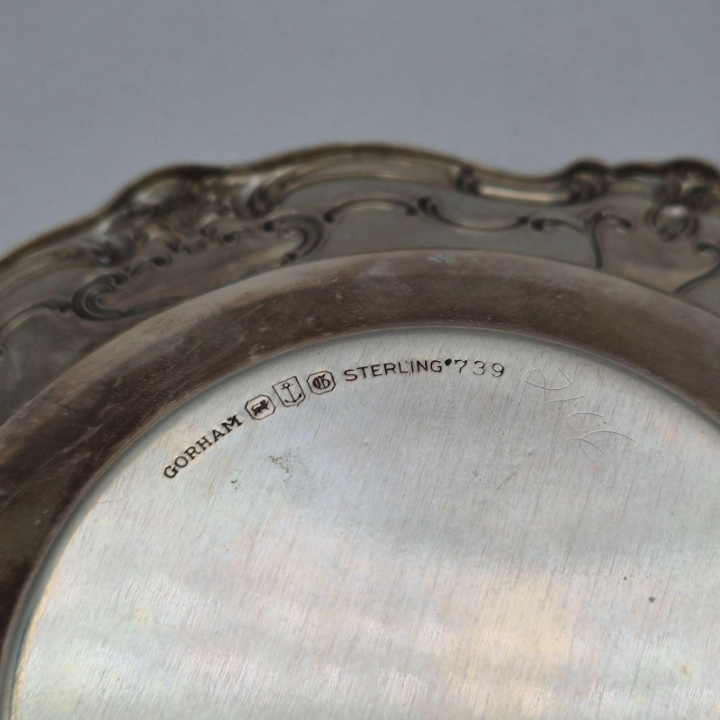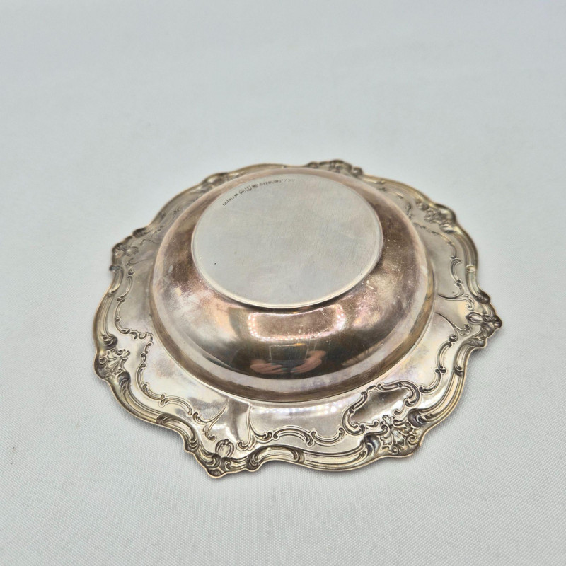 A charming pair of small sterling silver serving dishes, each ideal for nuts, trinkets, or small sweets. One is clearly hallmarked by Gorham, a name synonymous with American silver excellence. The other, though from an unknown maker, bears a sterling hallmark and complements the set with its own distinct form.