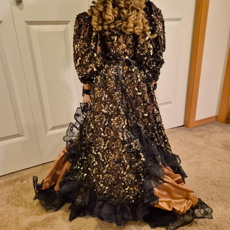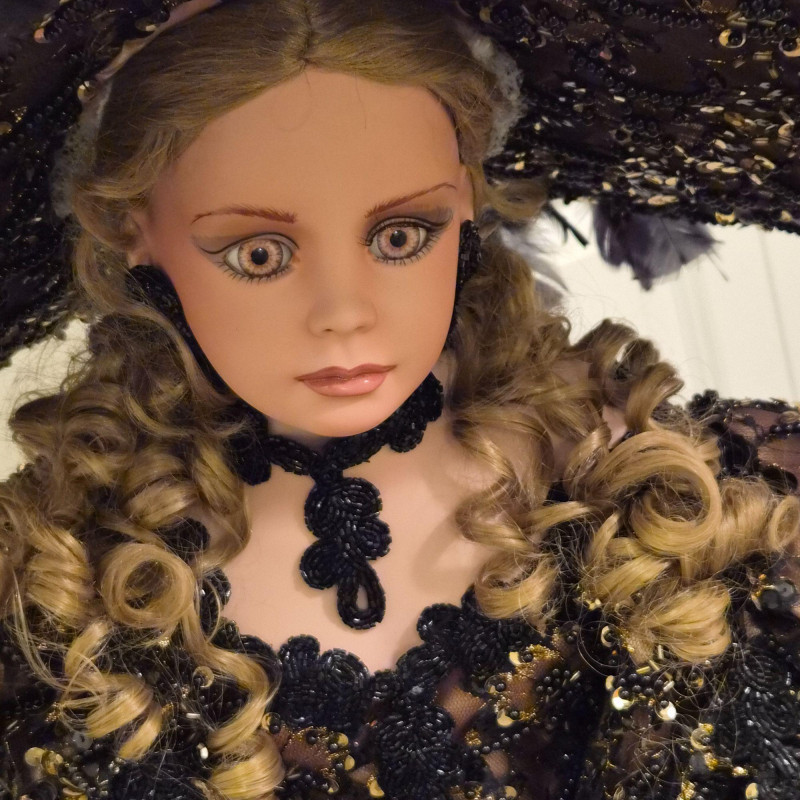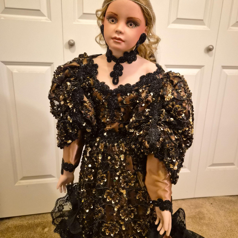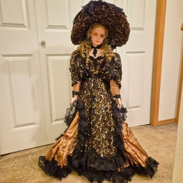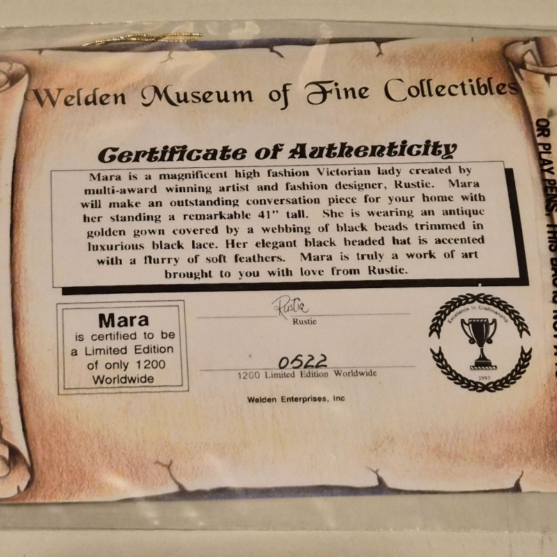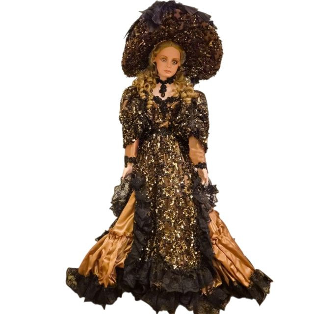 A dramatic and elegant presence, Mara is a limited edition Victorian fashion doll created by award-winning artist Rustie for the Welden Museum of Fine Collectibles. Standing an impressive 41 inches tall, she wears an antique-style golden gown adorned with black beads, lace, and a feathered hat — all intact and richly detailed. Mara is a striking display piece for collectors who appreciate limited editions, Victorian elegance, and the artistry of high fashion dolls.