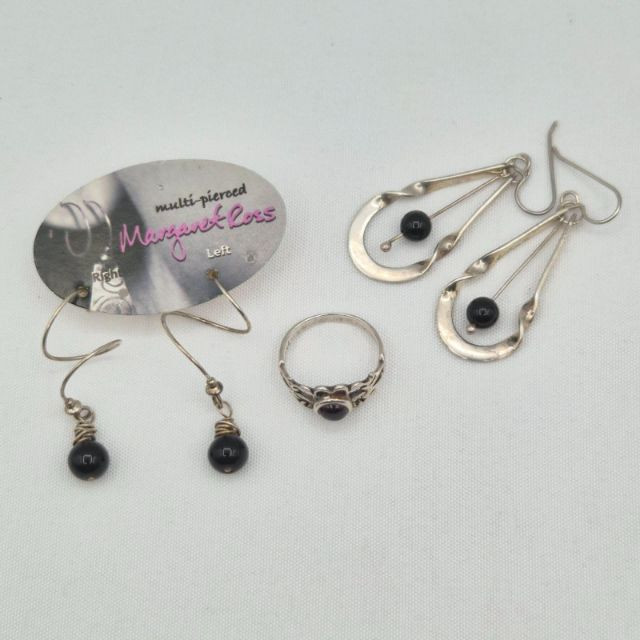Elegant trio of 925 sterling silver jewelry pieces featuring genuine onyx stones and international craftsmanship: Total weight: 12.8 grams.