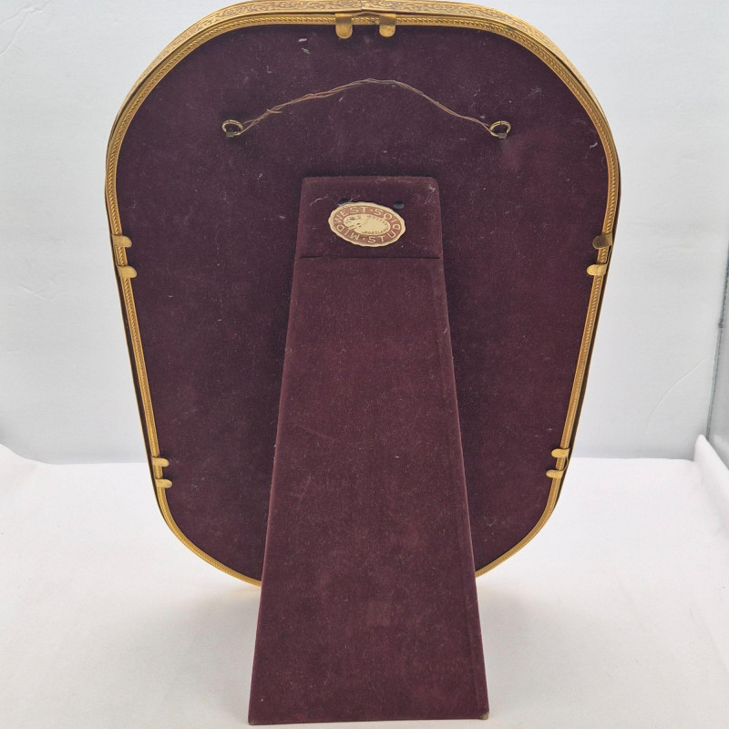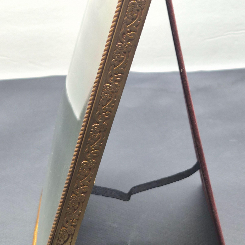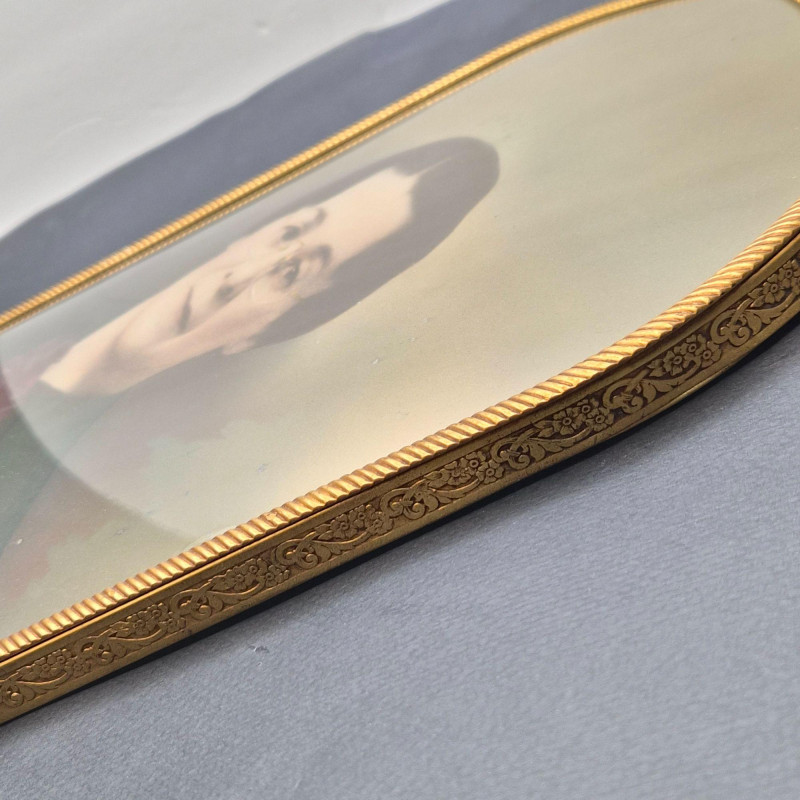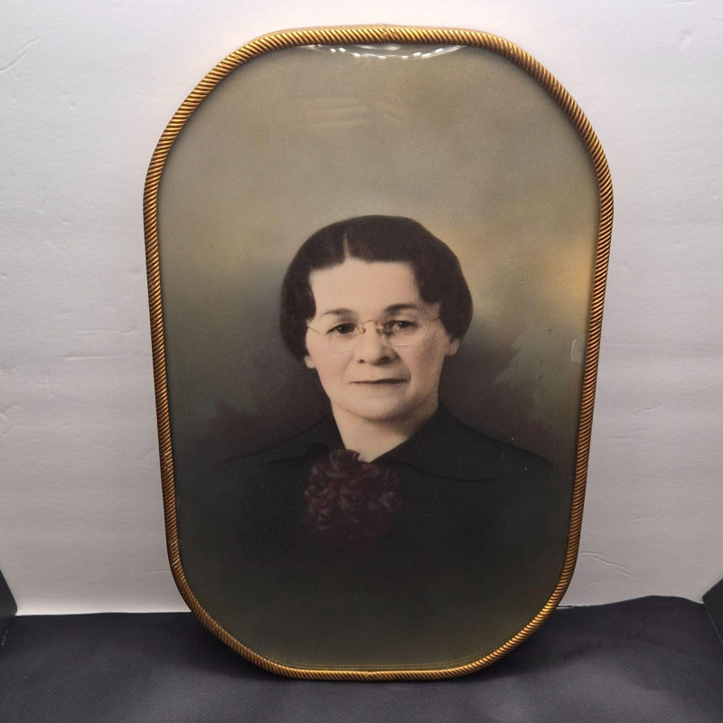 A nostalgic and elegant antique portrait of a woman, housed in a slightly convex glass with ornate gold-tone metal or brass frame. The frame’s sculptural flourishes evoke early 20th-century craftsmanship, and the convex glass adds subtle depth and vintage charm.