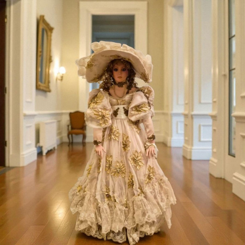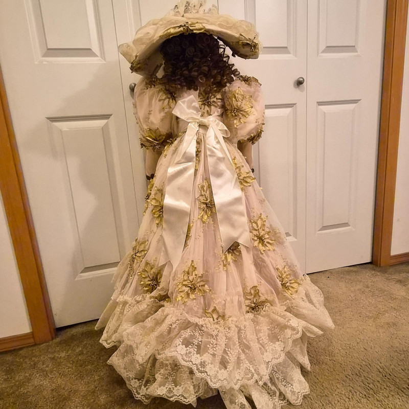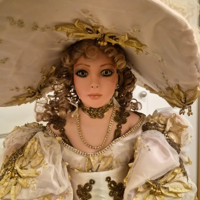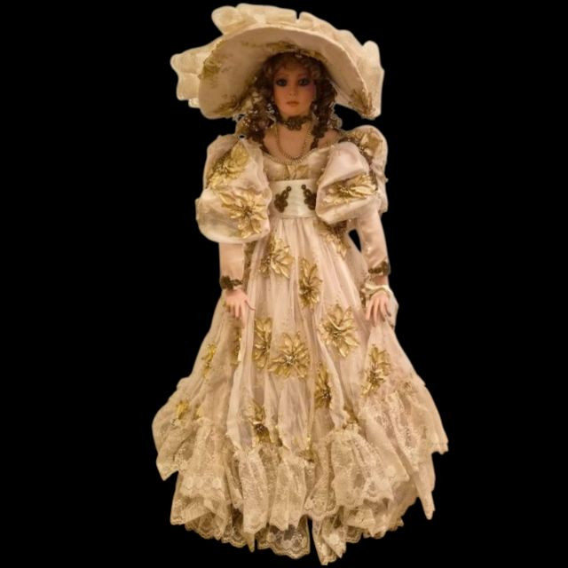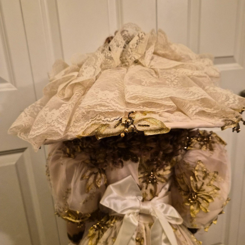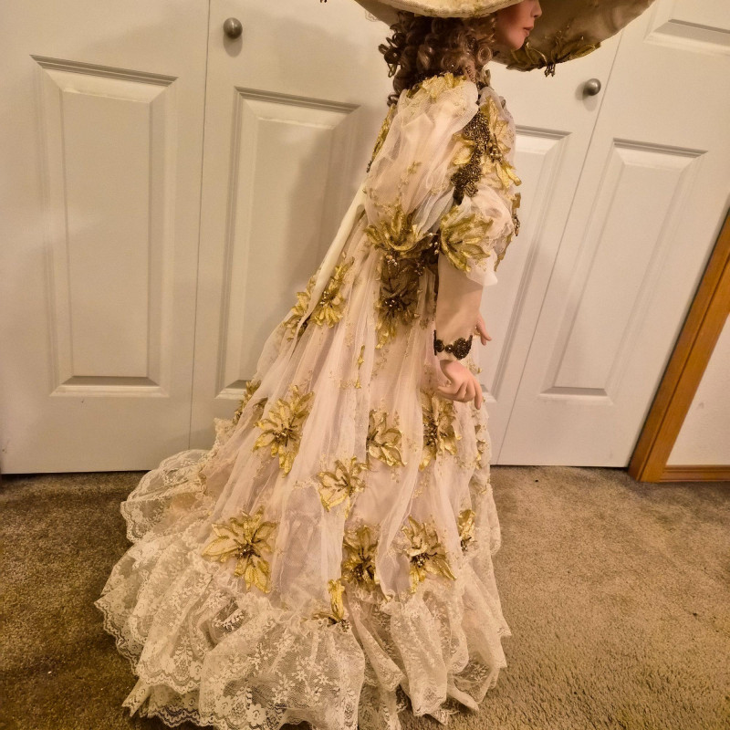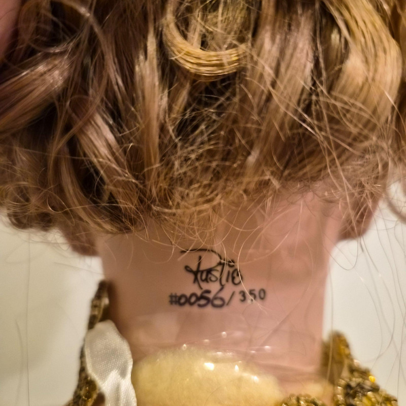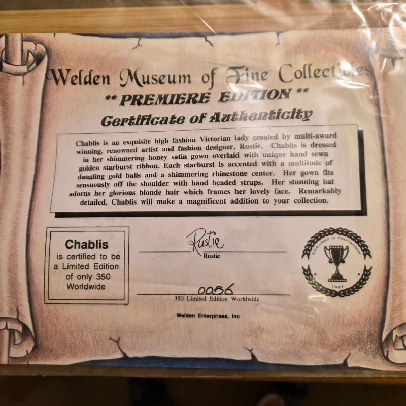 An opulent and rare creation from the Welden Museum of Fine Collectibles, Chablis is part of the Premiere Edition series by award-winning designer Rustie. Standing a regal 41 inches tall, she wears a shimmering honey satin gown adorned with hand-sewn golden starburst ribbon, rhinestones, and dangling gold accents. Her off-the-shoulder silhouette and beaded straps evoke high fashion Victorian elegance. A true statement piece for collectors who value limited editions, artistic craftsmanship, and Victorian glamour.