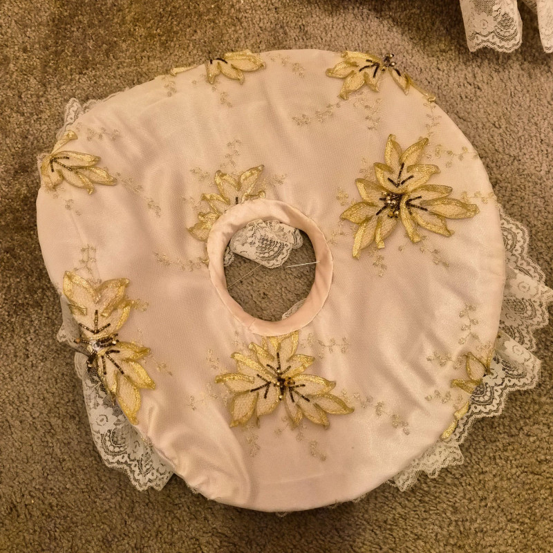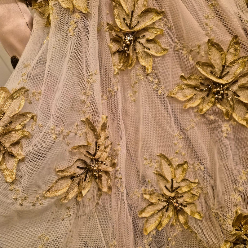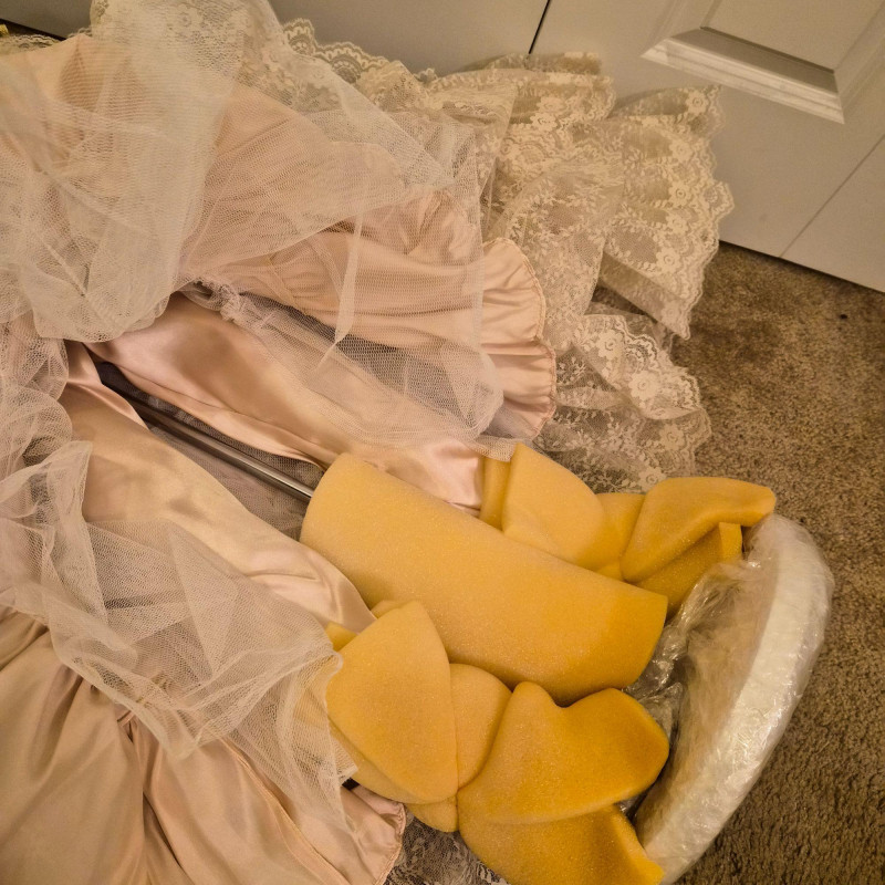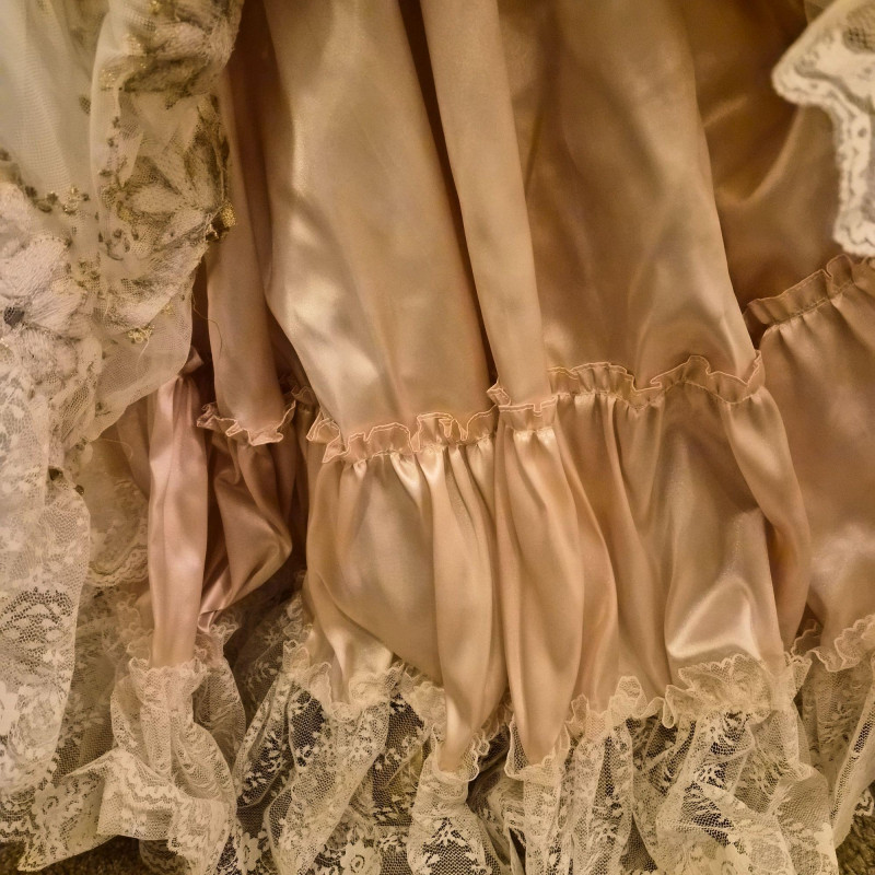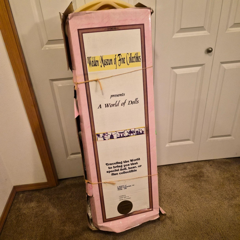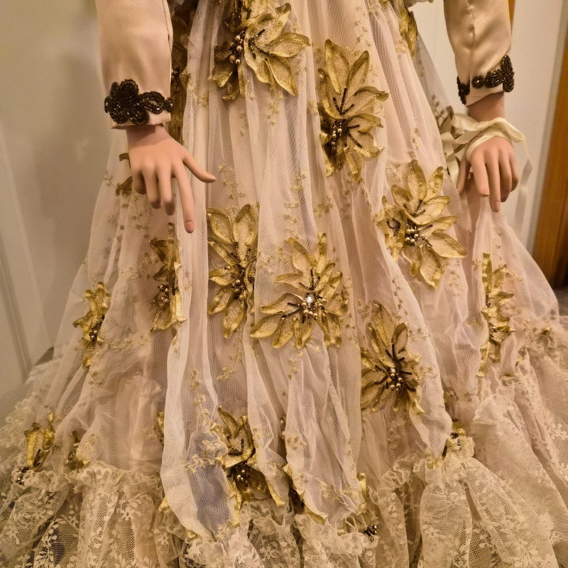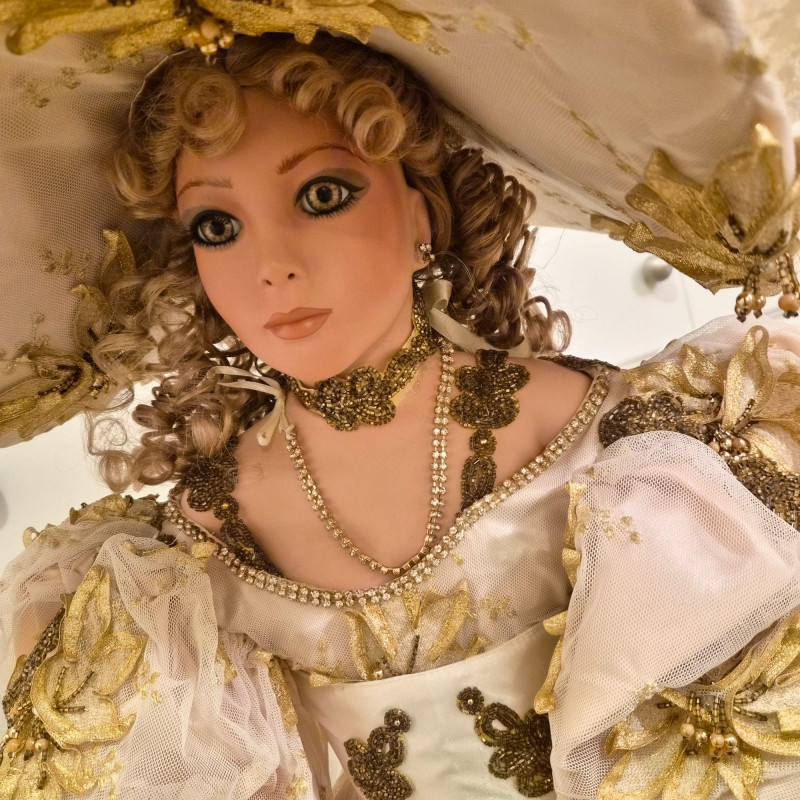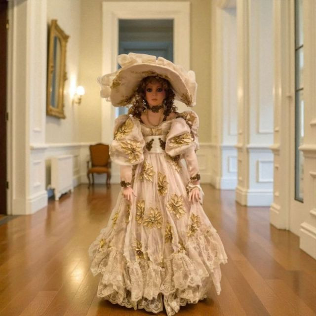 An opulent and rare creation from the Welden Museum of Fine Collectibles, Chablis is part of the Premiere Edition series by award-winning designer Rustie. Standing a regal 41 inches tall, she wears a shimmering honey satin gown adorned with hand-sewn golden starburst ribbon, rhinestones, and dangling gold accents. Her off-the-shoulder silhouette and beaded straps evoke high fashion Victorian elegance. A true statement piece for collectors who value limited editions, artistic craftsmanship, and Victorian glamour.