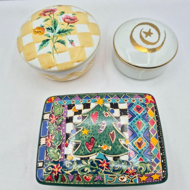 A charming trio of porcelain trinket boxes, each with its own distinctive style and collectible appeal: