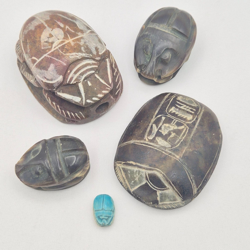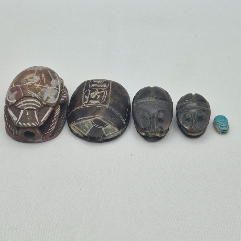 A captivating assortment of hand-carved scarabs, each echoing the mystique of ancient Egypt and the artistry of natural materials: This lot offers a tactile and visual journey through symbolic art—perfect for collectors of global artifacts, metaphysical décor, or vintage curiosities.