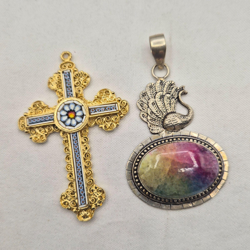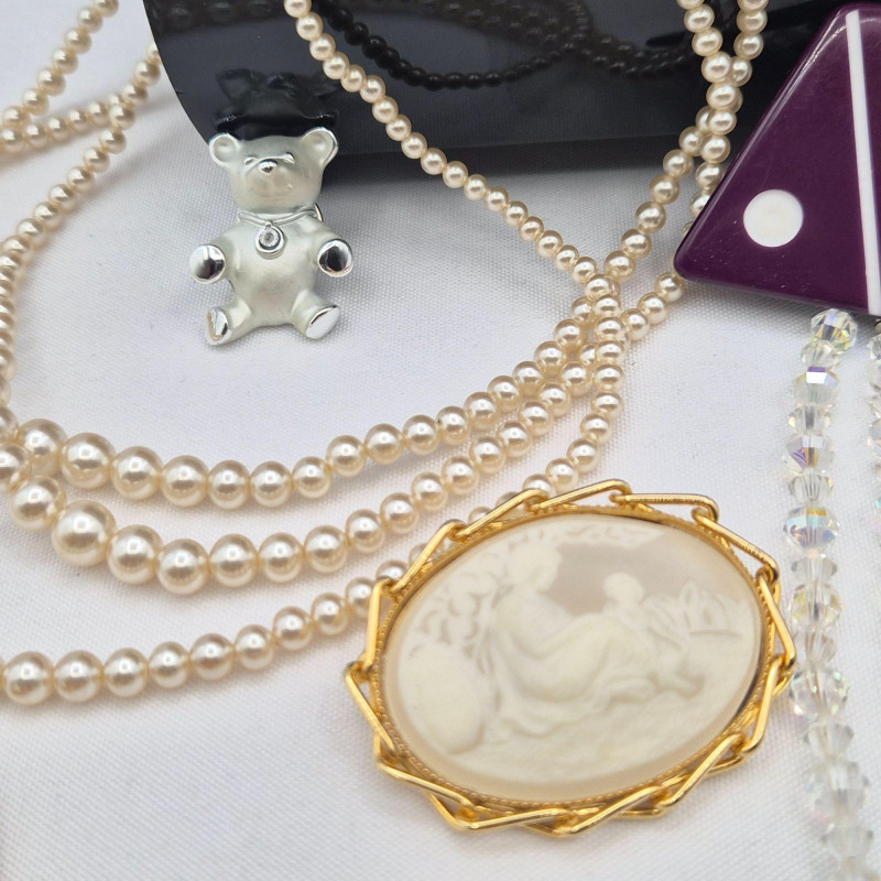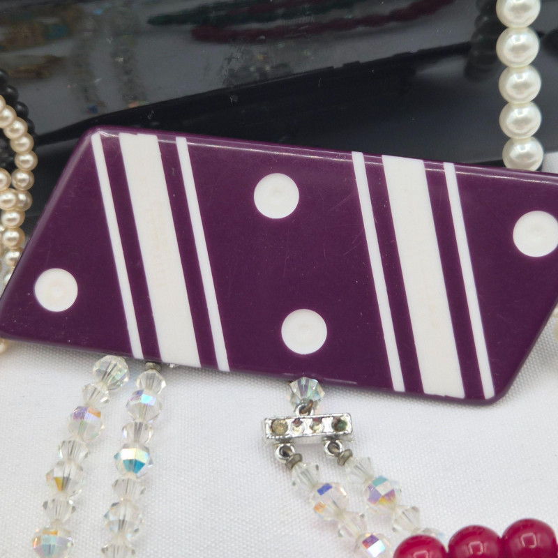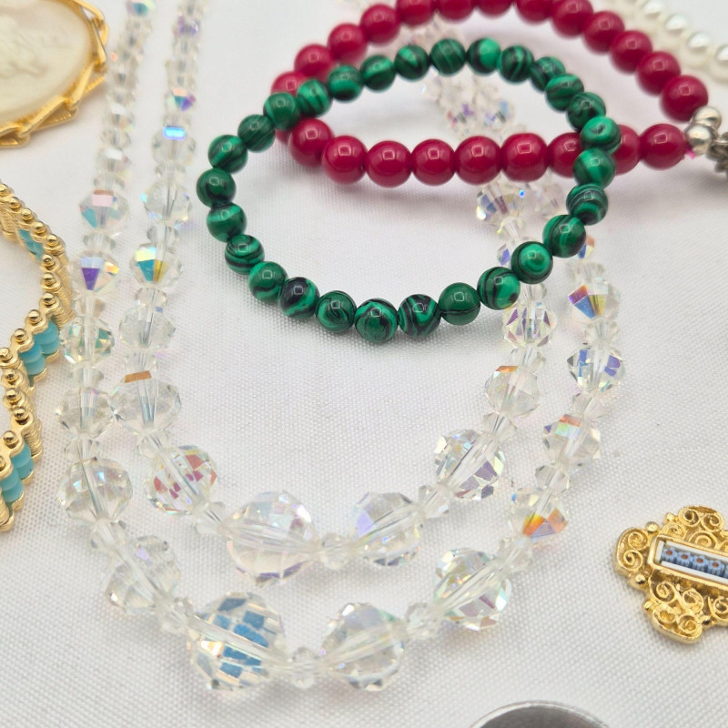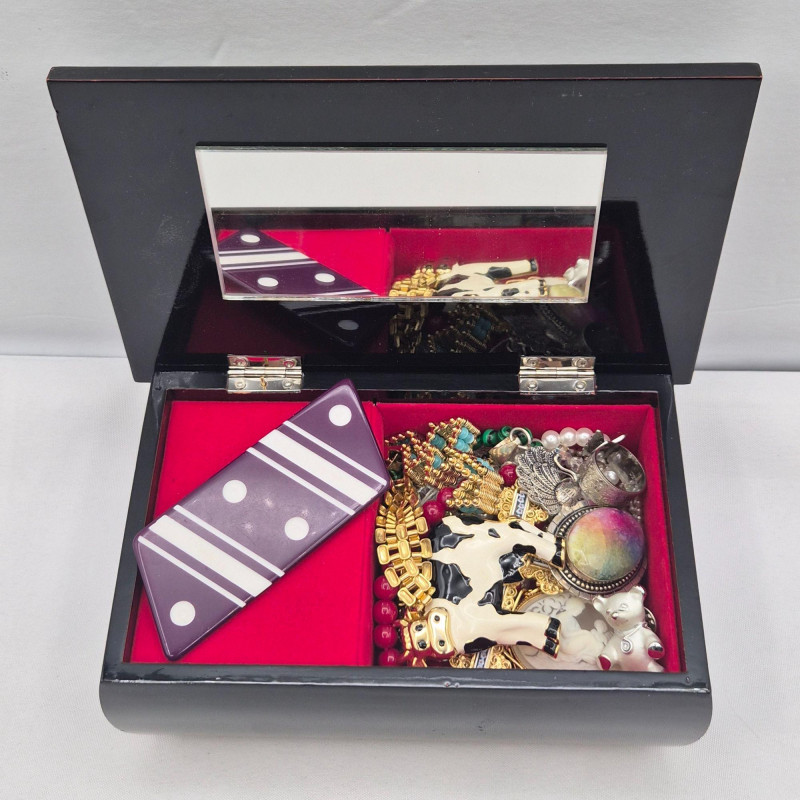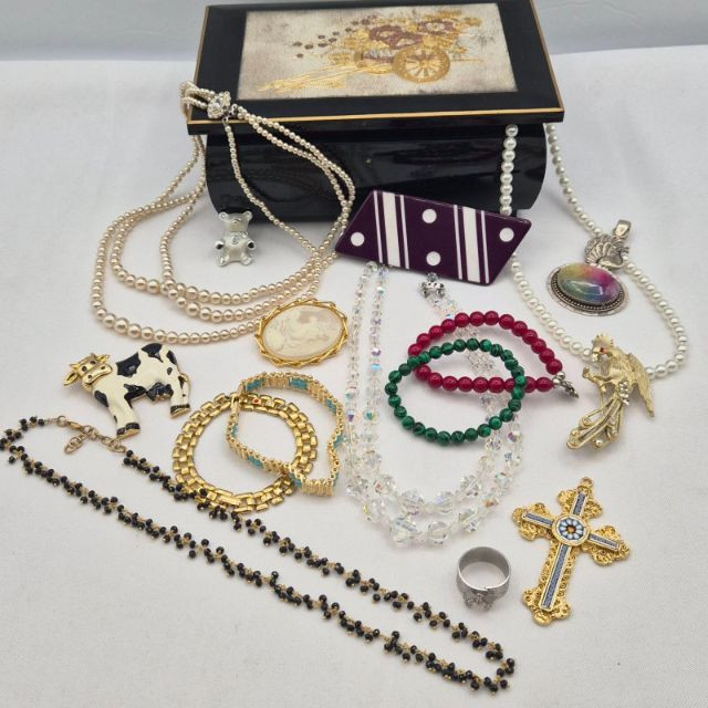 Nice selection of vintage jewelry, and a few modern pieces with natural stones. Butterfly ring stamped Vogue. Superb micro mosaic cross pendant. All wearable pieces: brooches, necklaces, bracelets andvring. All tucked in a vintage Westland chokin top lacquered music jewelry box, Japan, plays - Anniversary Waltz.