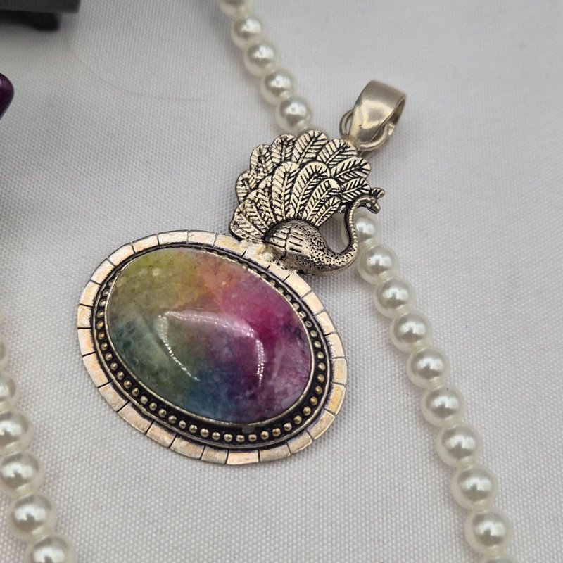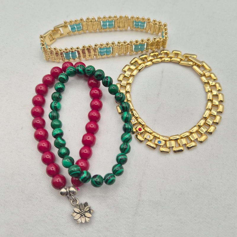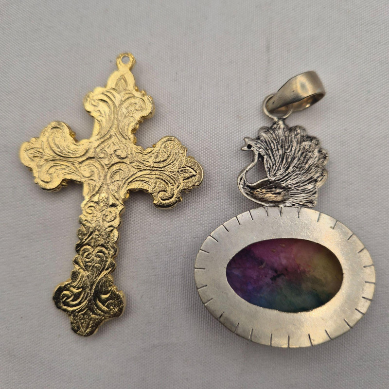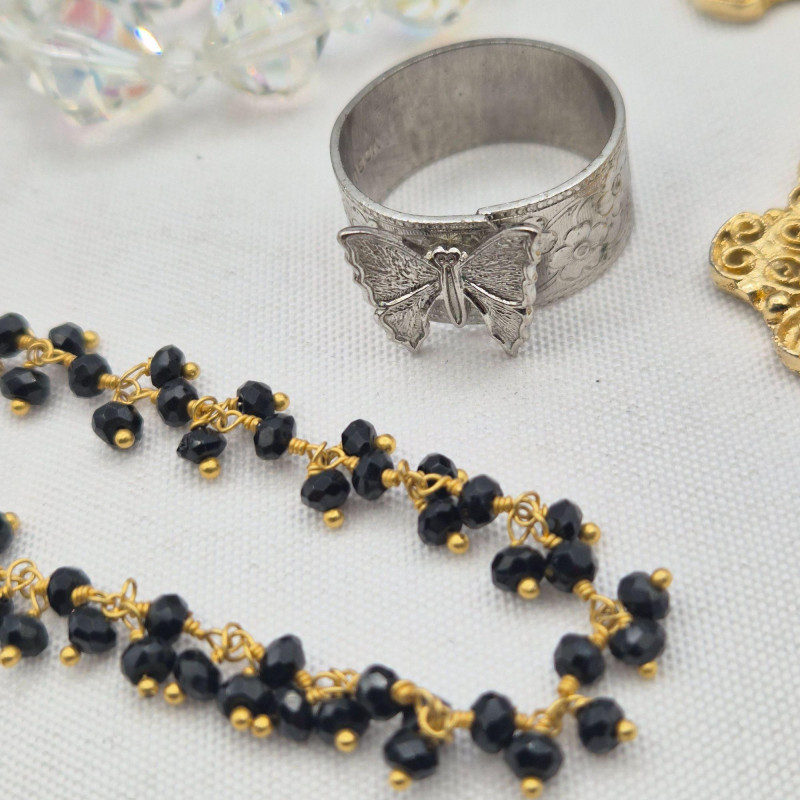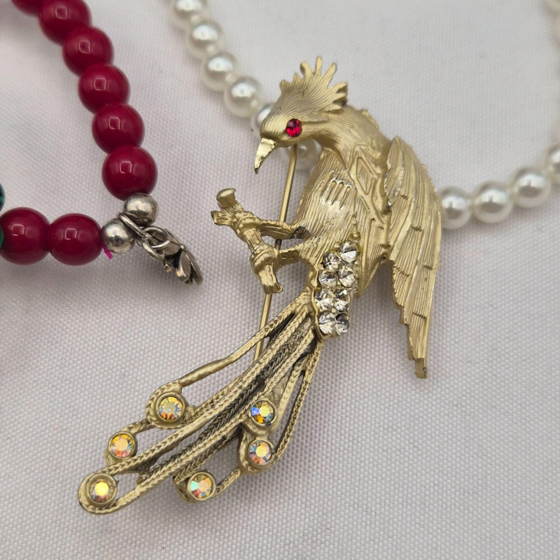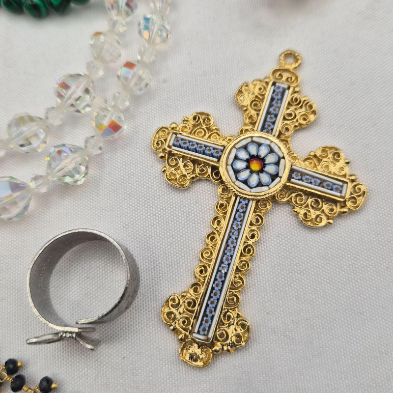 Nice selection of vintage jewelry, and a few modern pieces with natural stones. Butterfly ring stamped Vogue. Superb micro mosaic cross pendant. All wearable pieces: brooches, necklaces, bracelets andvring. All tucked in a vintage Westland chokin top lacquered music jewelry box, Japan, plays - Anniversary Waltz.