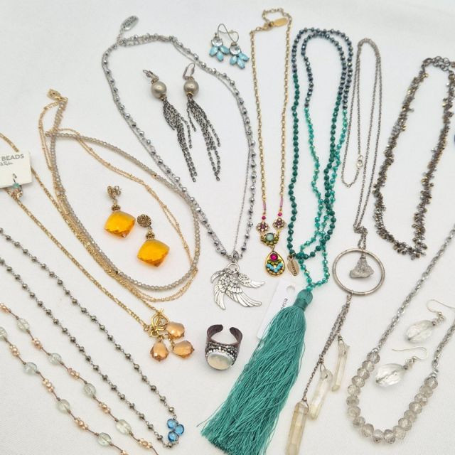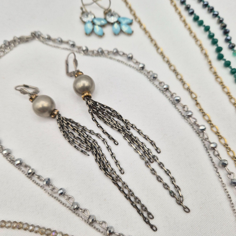 A dazzling assortment of fashion jewelry featuring sparkling crystals in a variety of styles, tones, and lengths. This lot includes: