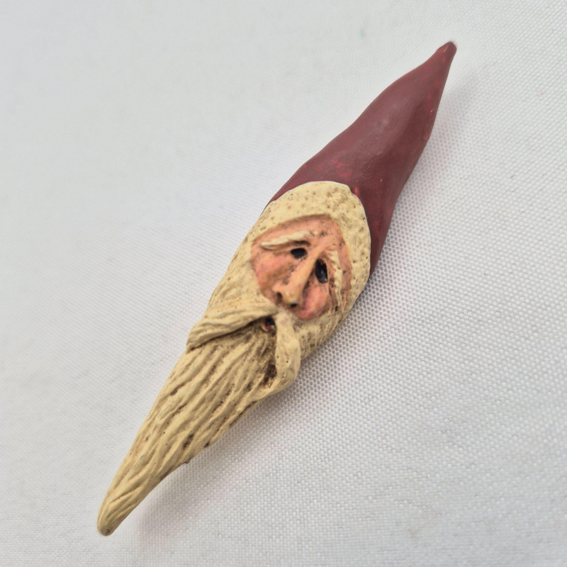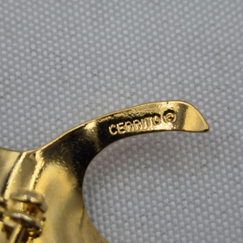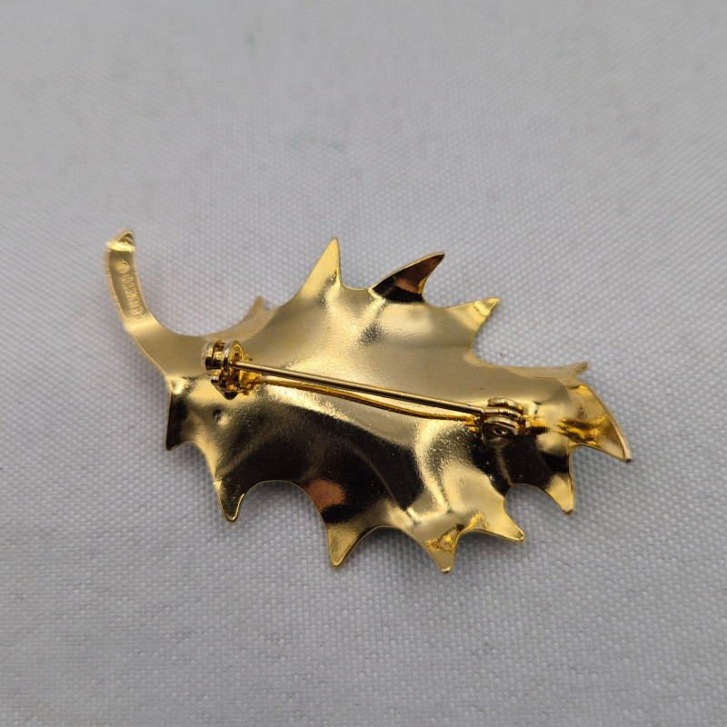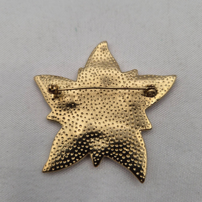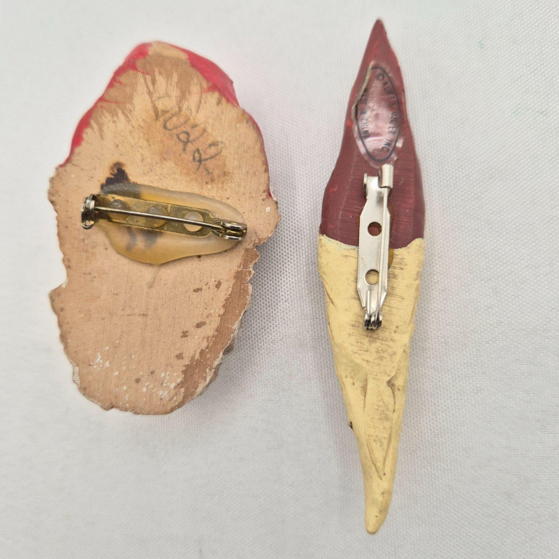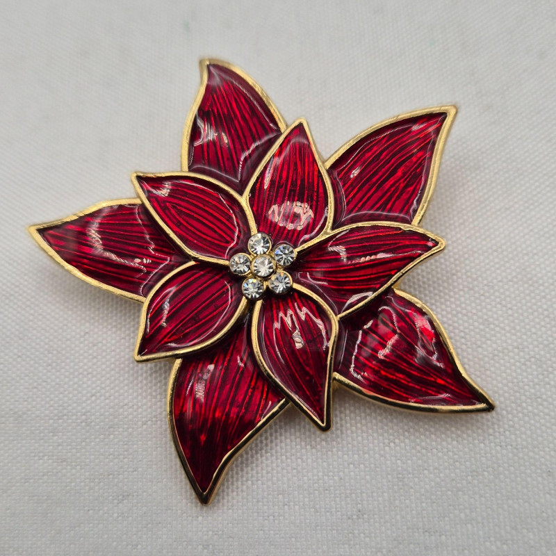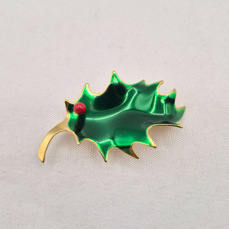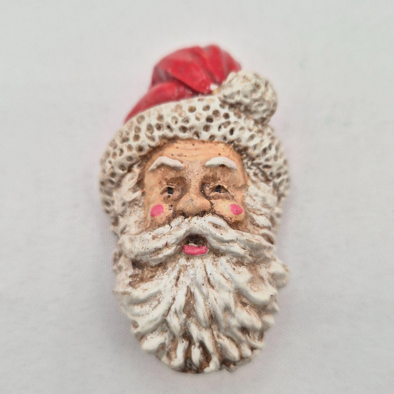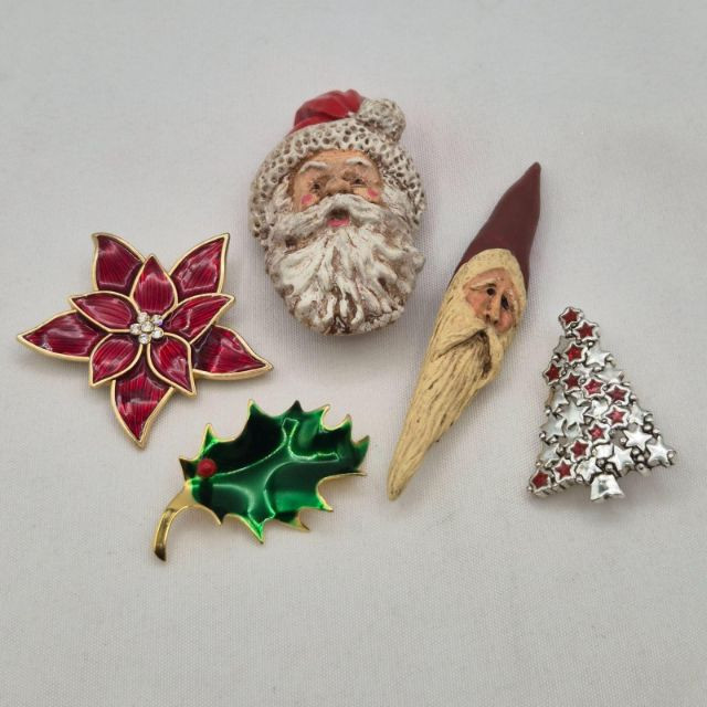 Five various Christmas holiday themed fashion jewelry: Two resin carved detailed Santa brooches. Red glittery enameled star & silvertone tree pin/pendant. Signed Cerrito, green Holly leaf gold tone pin. Enameled Poinsettia brooch, gold tone.