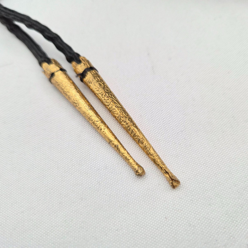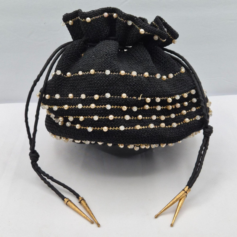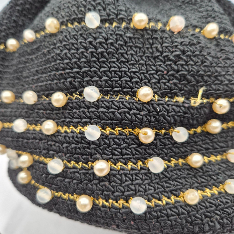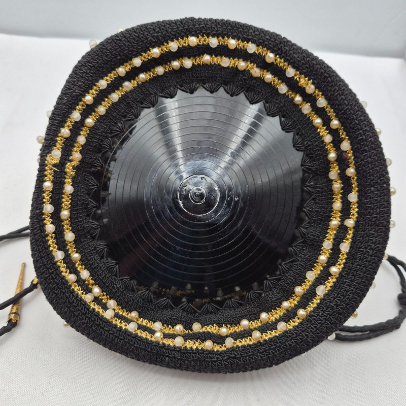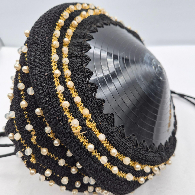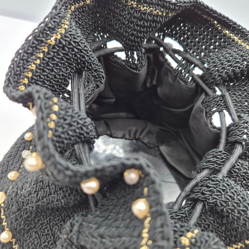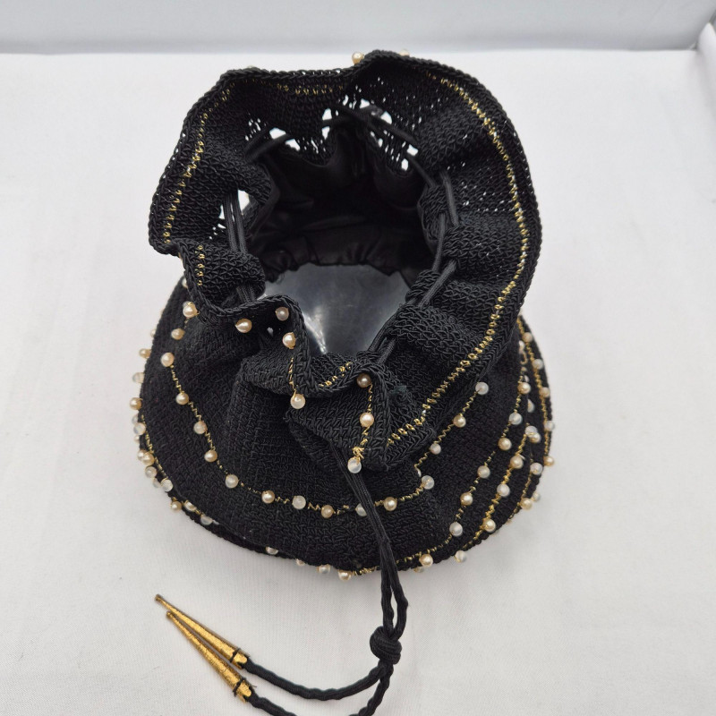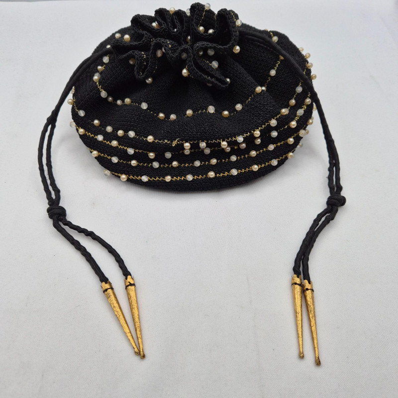 A charming vintage drawstring bag with intricate black crochet work, accented by gold thread and a mix of pearl-luster and frosted white glass beads. The base is a unique plastic saucer/cone shape, giving it structure and flair. Only one bead appears to be missing, but the overall presentation is elegant and intact. A lovely piece for collectors, vintage stylists, or anyone who appreciates handcrafted detail.