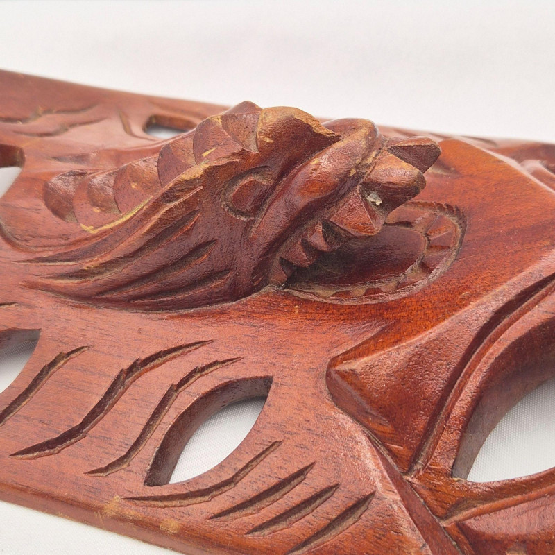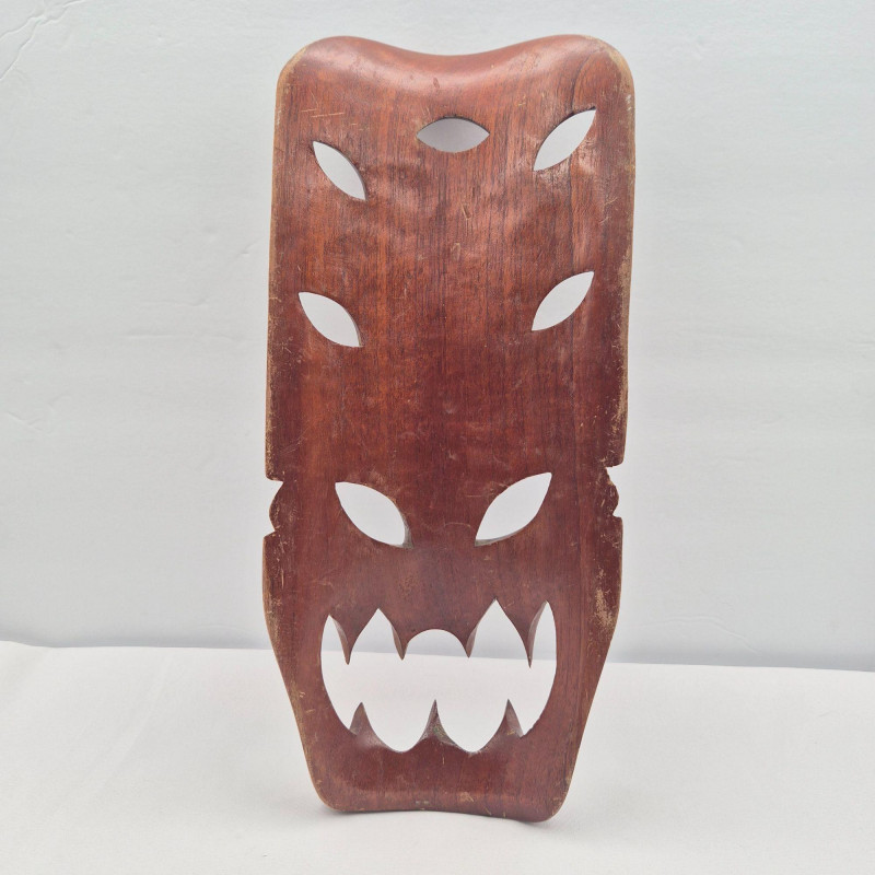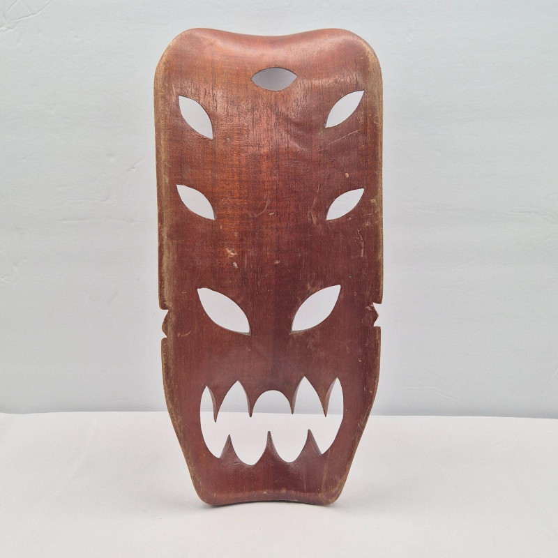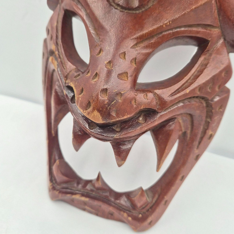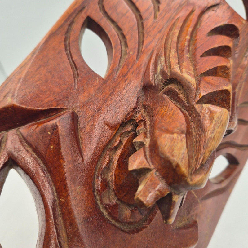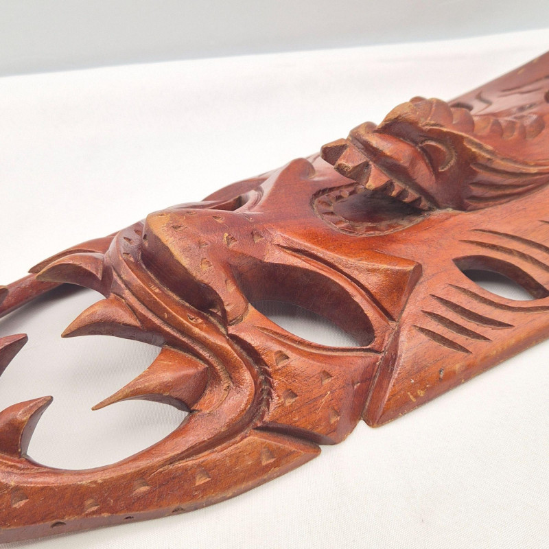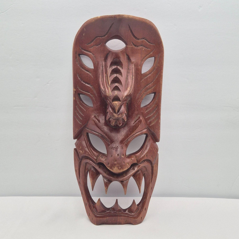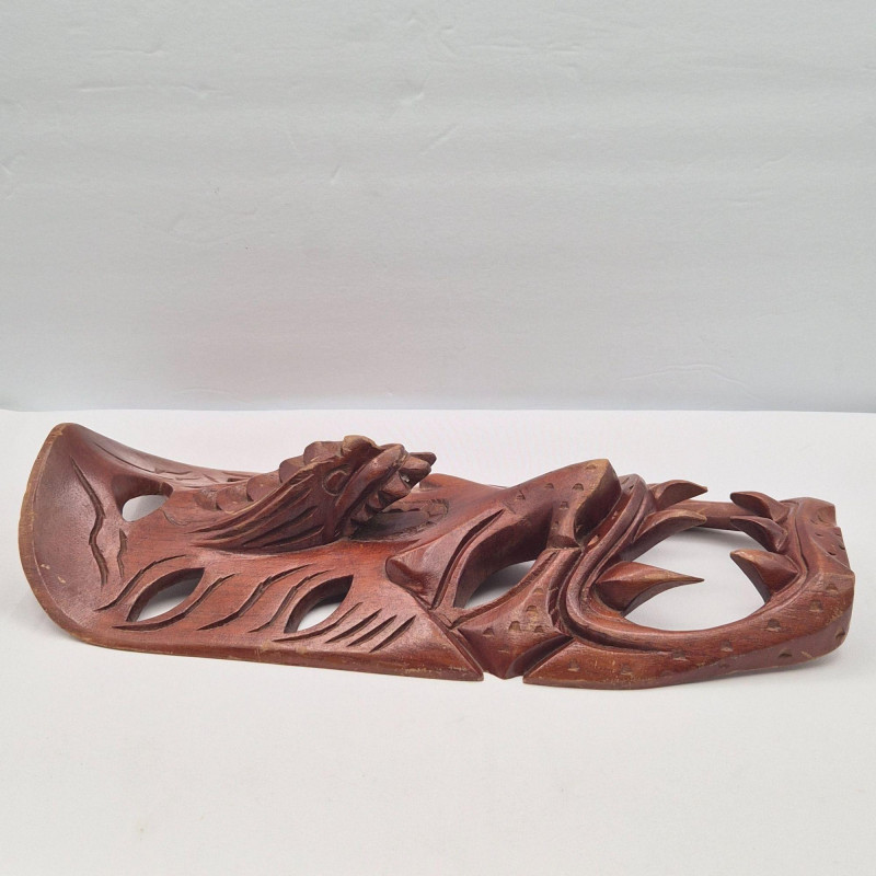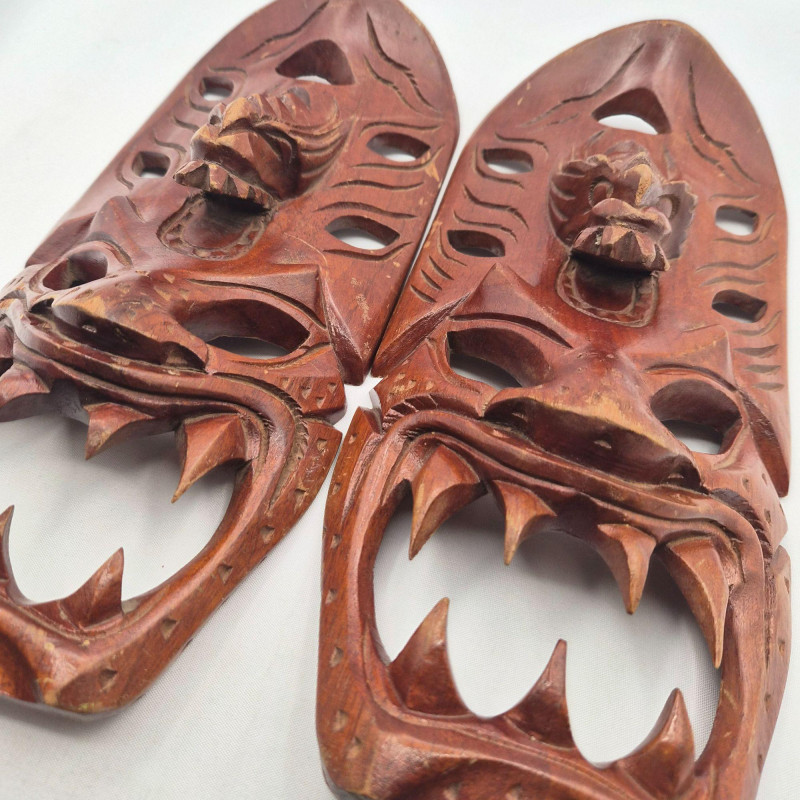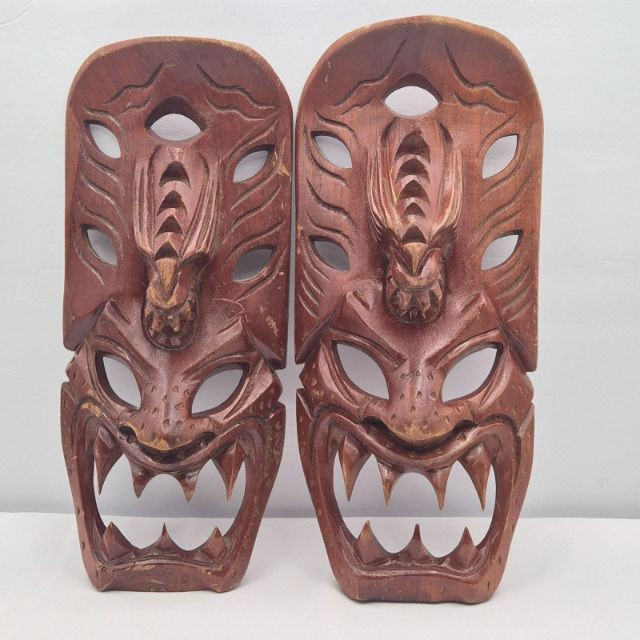 A bold and expressive pair of hand-carved decorative Tiki masks, crafted from lightweight wood and rich with character. Each mask features a fierce dragon-like face, complete with sharp teeth, flared nostrils, and intense grins—a mirrored duo radiating tribal energy and ceremonial flair. Measuring 14.25" x 6" and 14.5" x 6.25", both show finish wear consistent with age, adding to their vintage mystique. Perfect for tropical-themed decor, collectors of Polynesian-inspired art, or anyone seeking dramatic wall accents with a mythic edge.