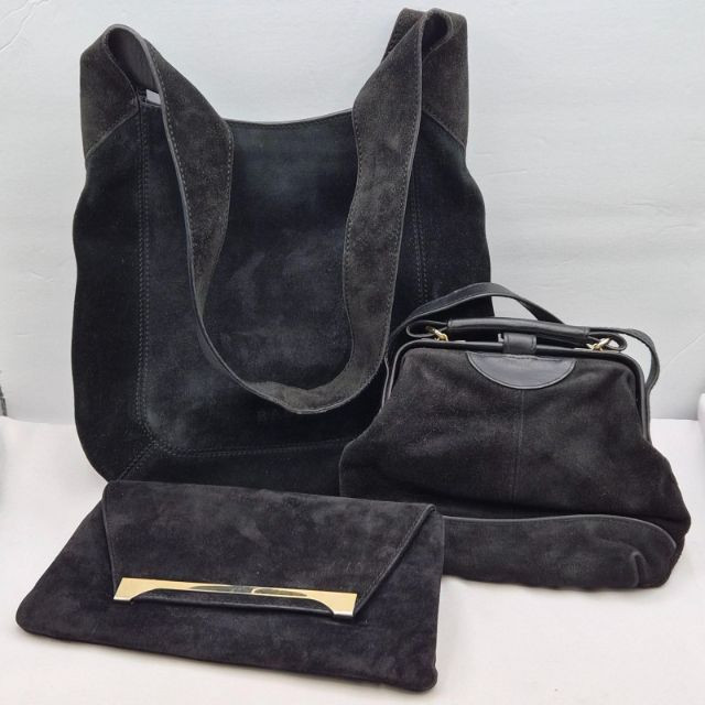 A chic trio of vintage black suede handbags, each offering timeless texture and distinctive silhouettes: All pieces show normal age and use, with suede texture and silhouettes that remain effortlessly stylish.