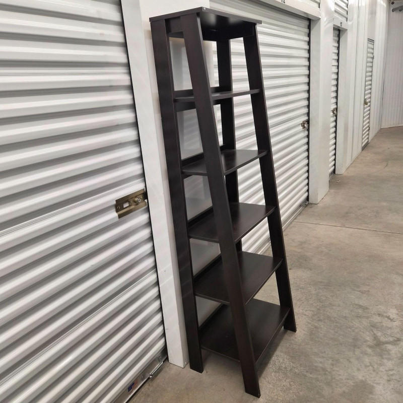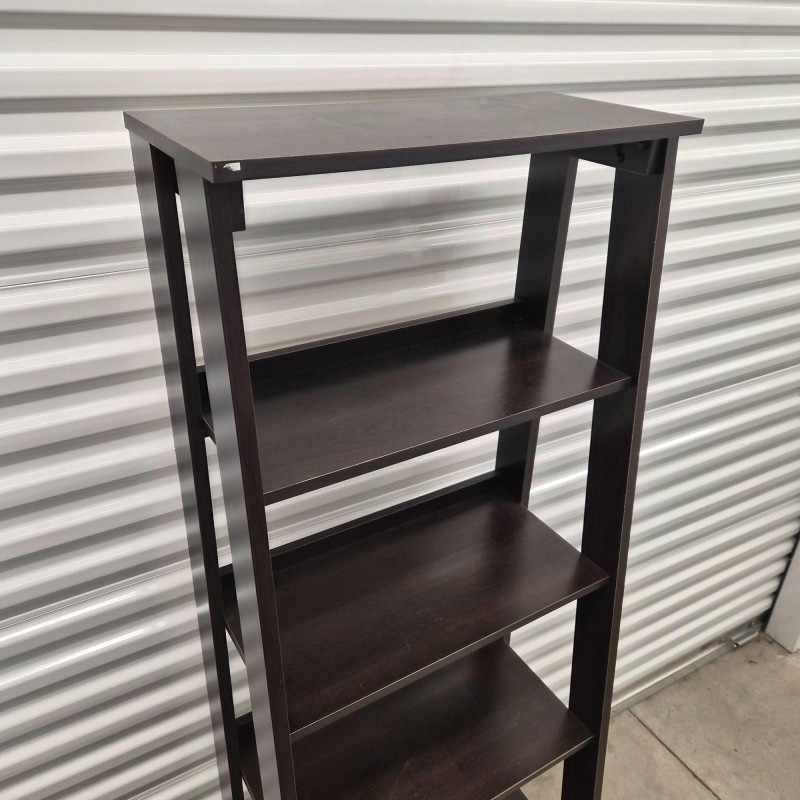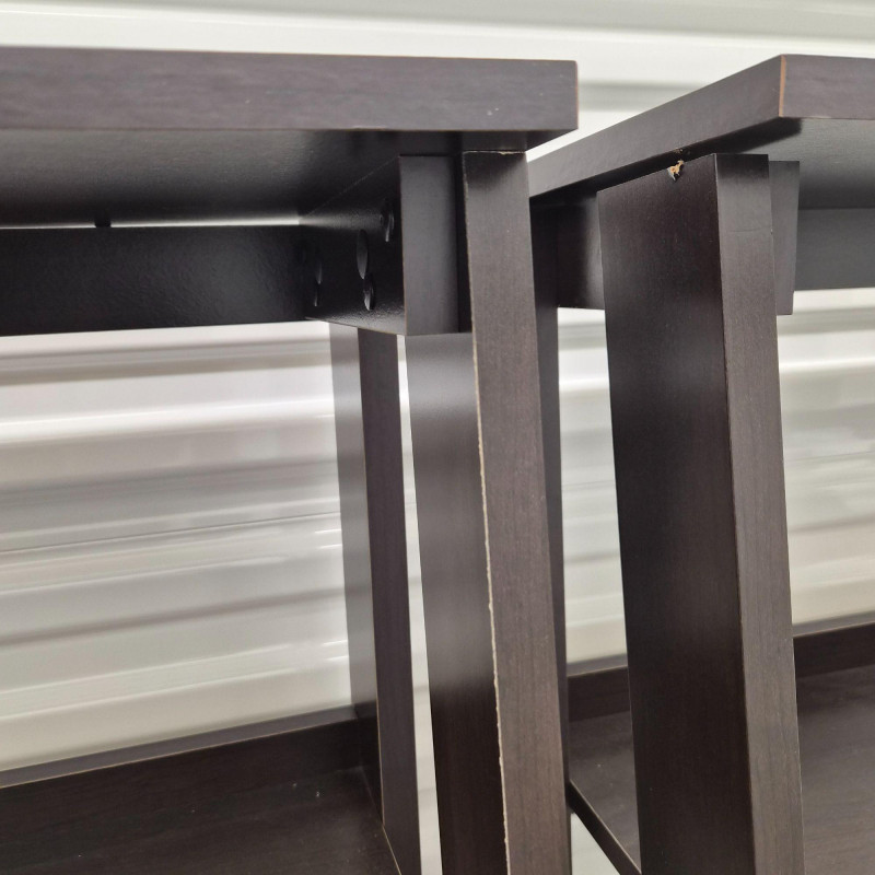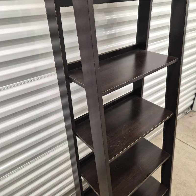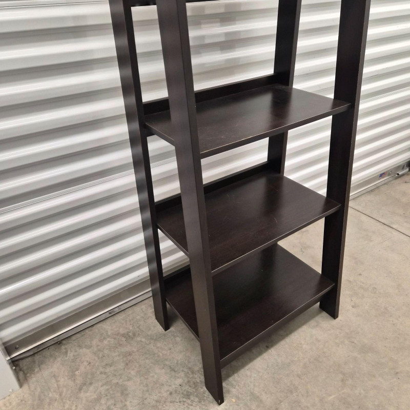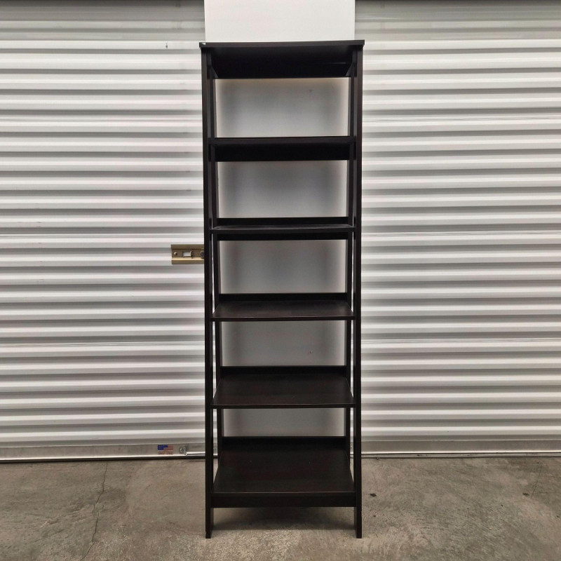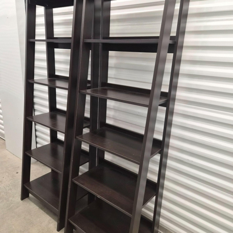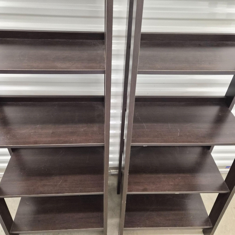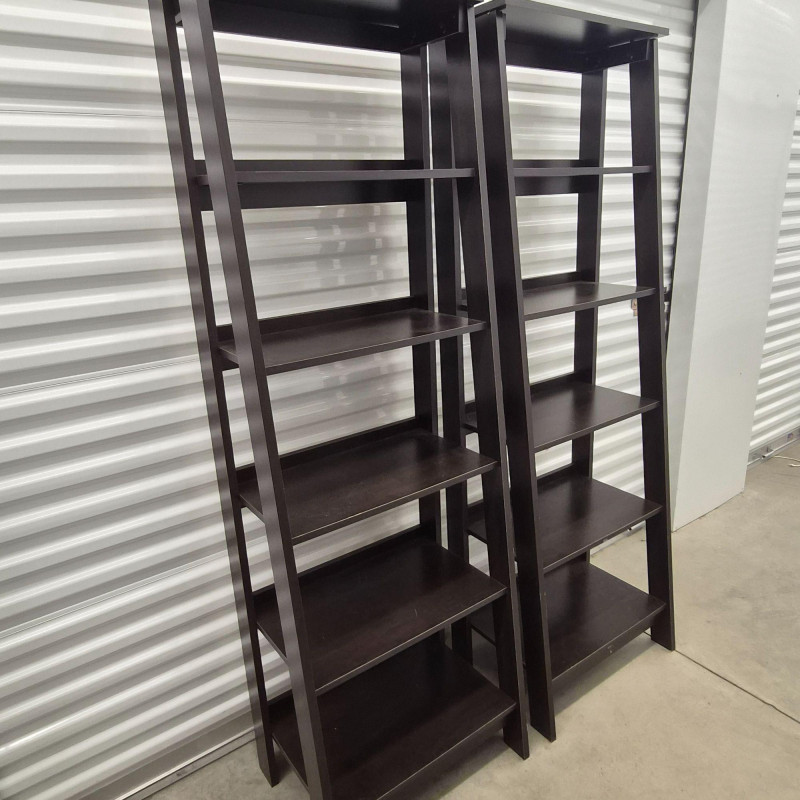 A matching set of two black tiered shelving units, each featuring: Perfect for smaller spaces, these shelves offer vertical storage with a modern edge—ideal for books, decor, pantry goods, or studio supplies. Use them side-by-side or split across rooms for cohesive organization. ***Note*** This item is at a different pick-up location (Bothell).