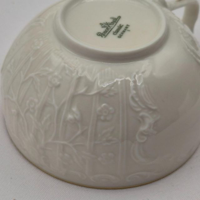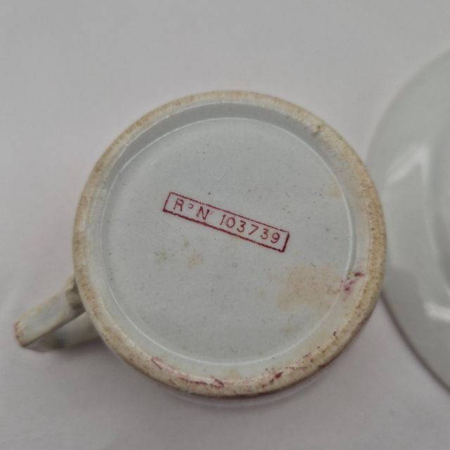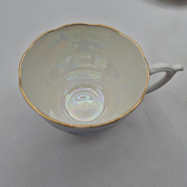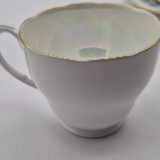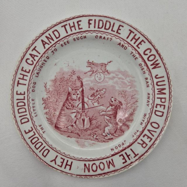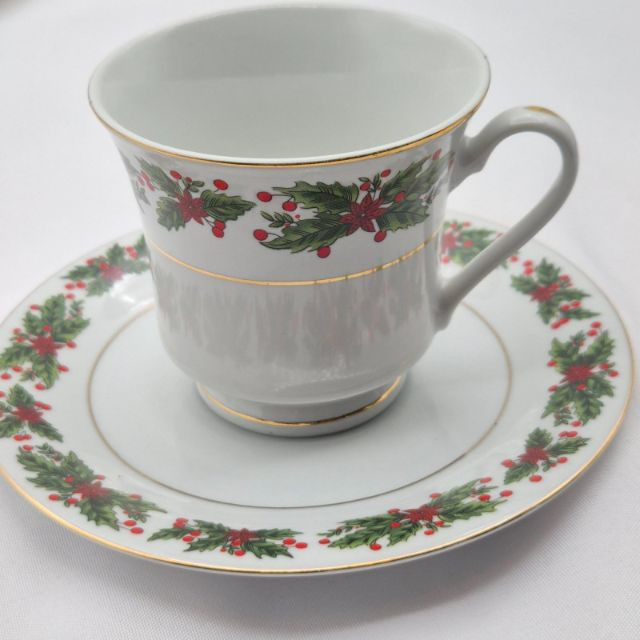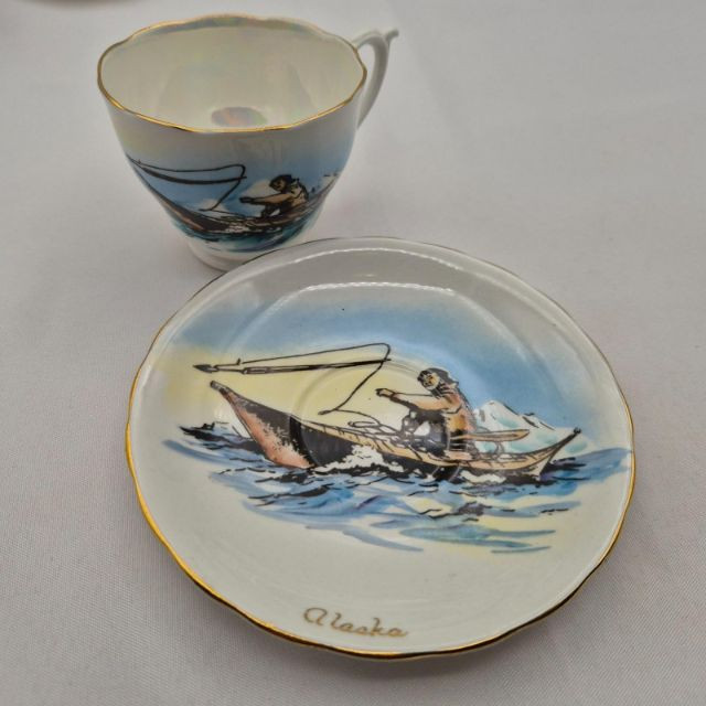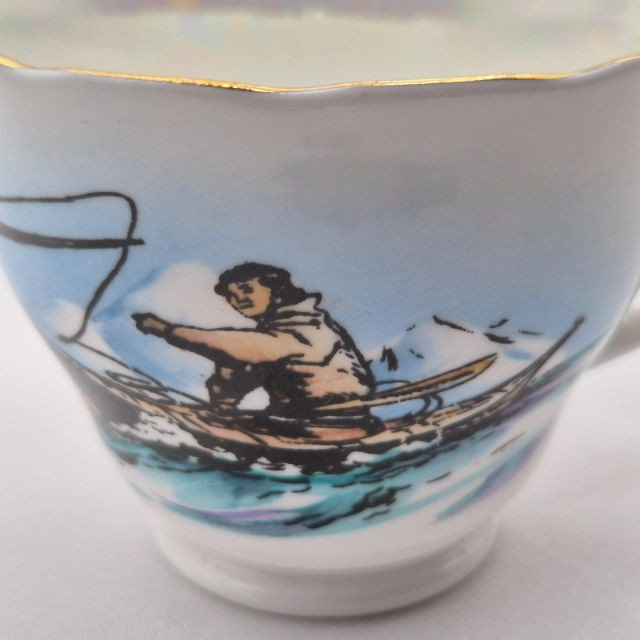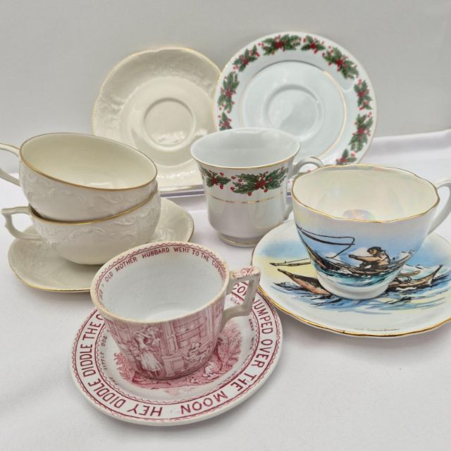 Ensemble of vintage teacups and saucers, each with distinct charm and collectible appeal. This seven-piece set includes: Old Mother Hubbard & Hey Diddle Diddle: A whimsical nursery rhyme duo with red illustrations and text, full of nostalgic storytelling. Truly Tasteful Holly Pattern: A festive white cup with holly and berry motif, accented by a gold rim—perfect for winter gatherings. (2) Rosenthal Porcelain Cups: Elegant ivory-colored porcelain with refined gold trim, showcasing Rosenthal’s signature craftsmanship. Hand-Painted Fisherman Scene: A pearlescent cup featuring a serene nautical illustration of a fisherman, marked Clarence England—an evocative piece of folk artistry