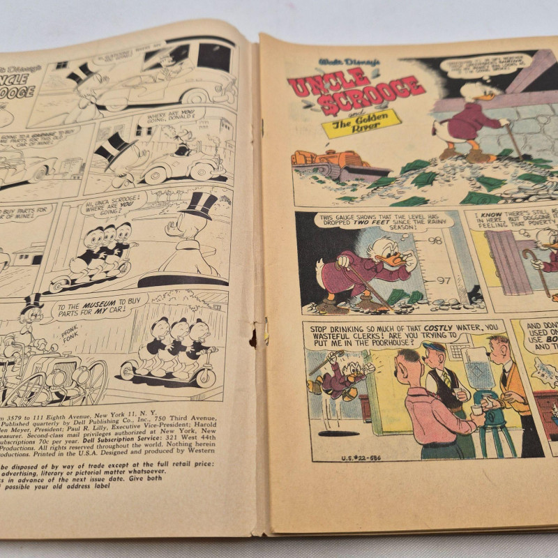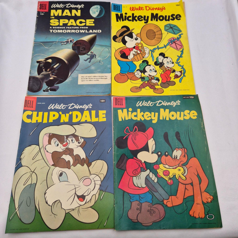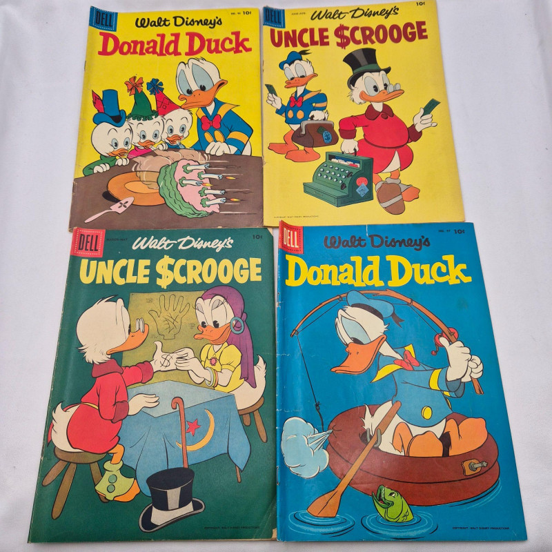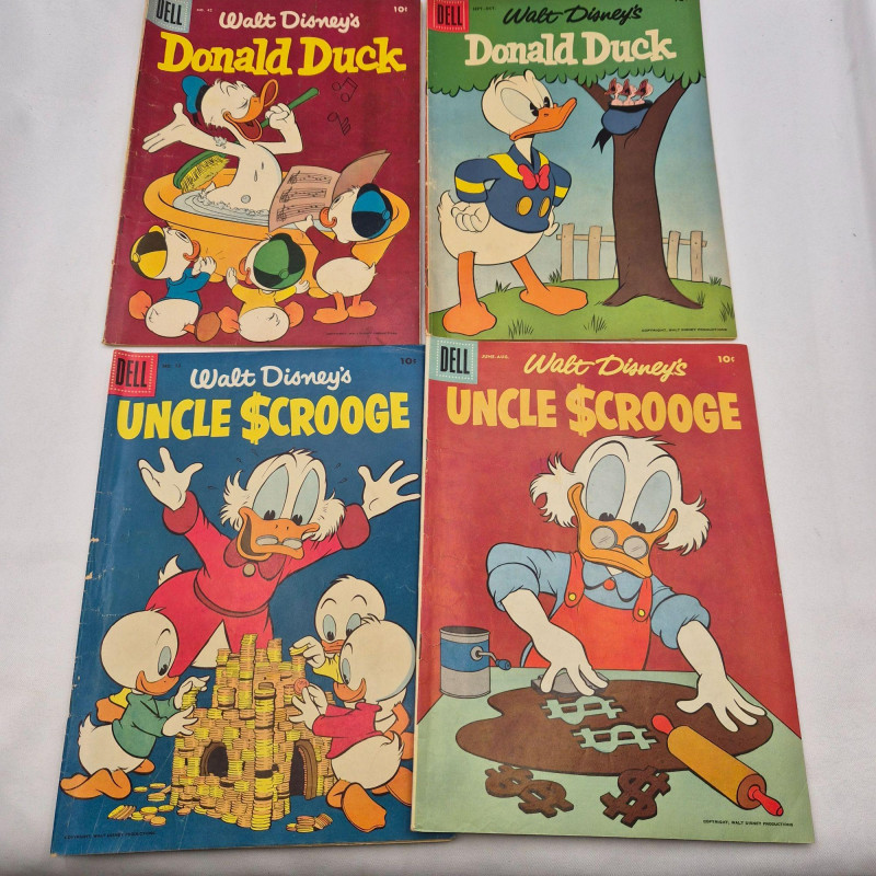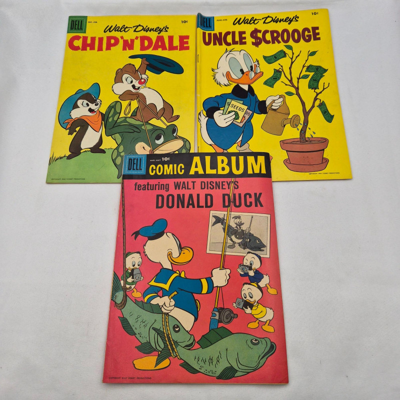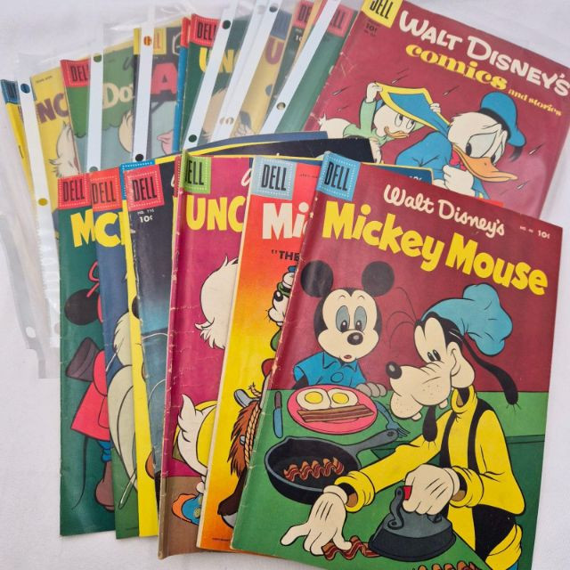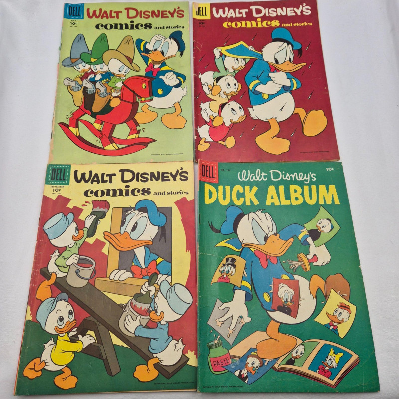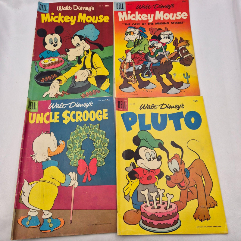 A delightful selection of vintage Walt Disney comic books from the mid-1950s, published by Dell Comics, featuring beloved characters and whimsical adventures: These comics capture the golden age of Disney humor and hand-drawn charm, ideal for collectors, nostalgic readers, or fans of retro pop culture.
