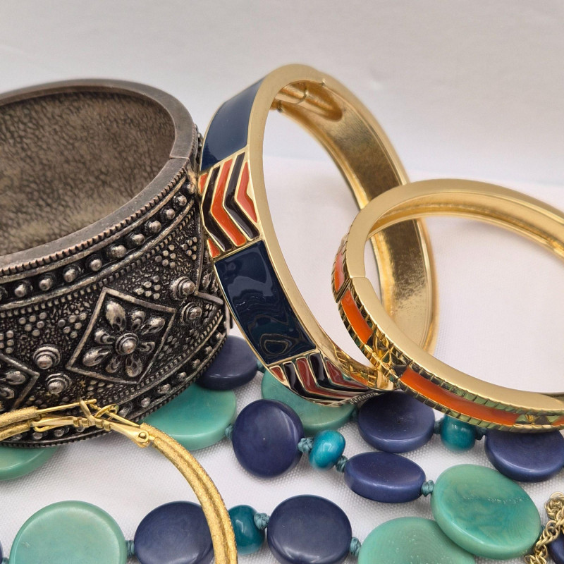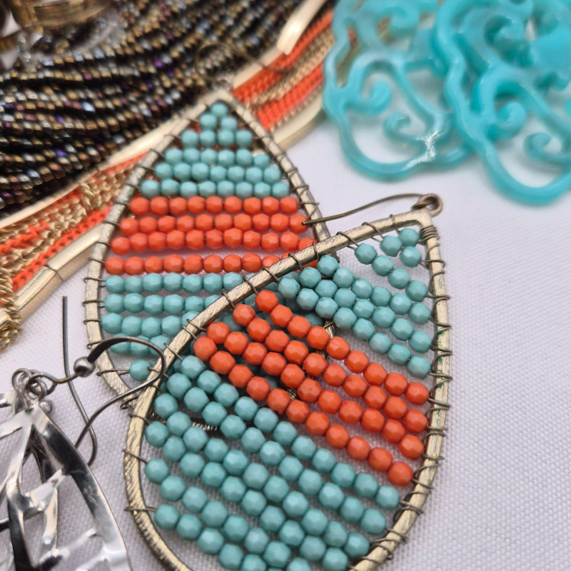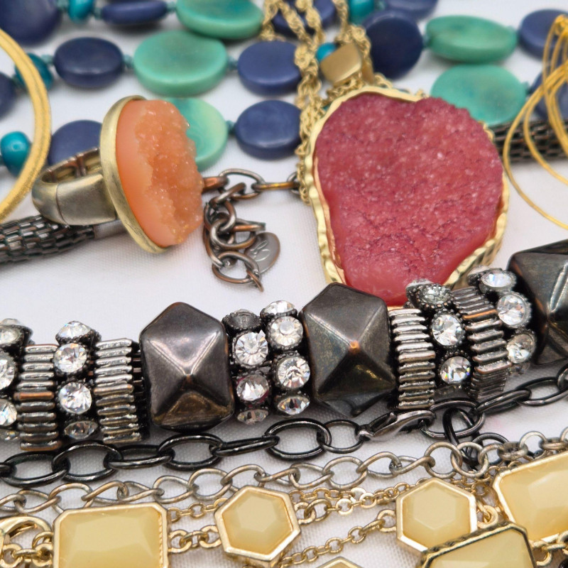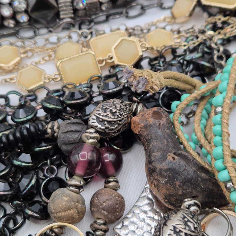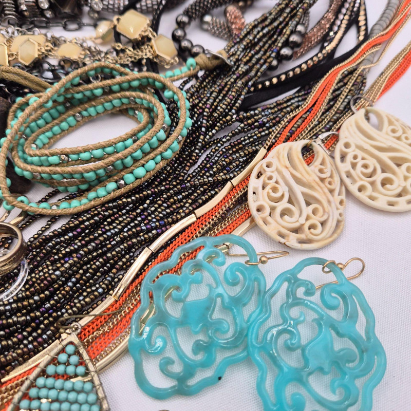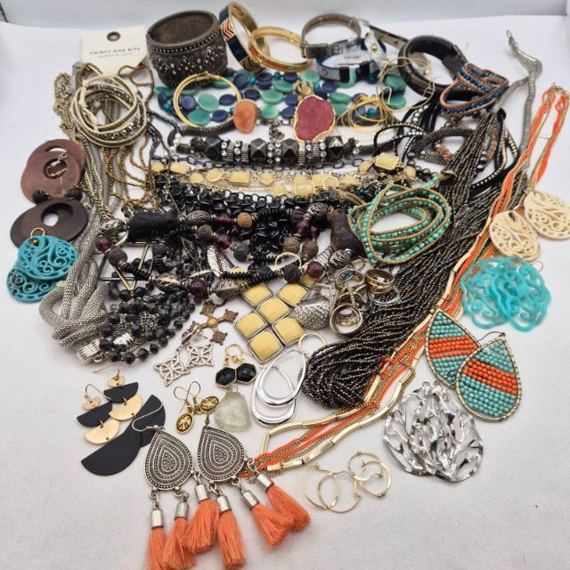 Mixed materials, styles and colors. All appear to be wearable, some show more wear than others but nothing nroken - or harvest the stones and beads to create your own DIY style. Necklaces, bracelets, earrings and more.