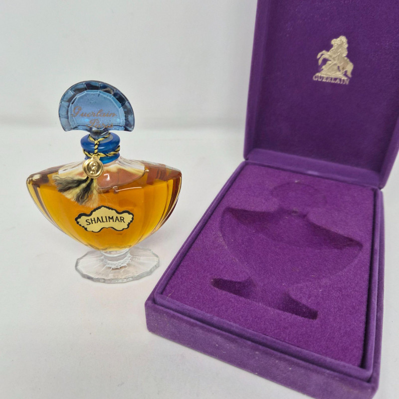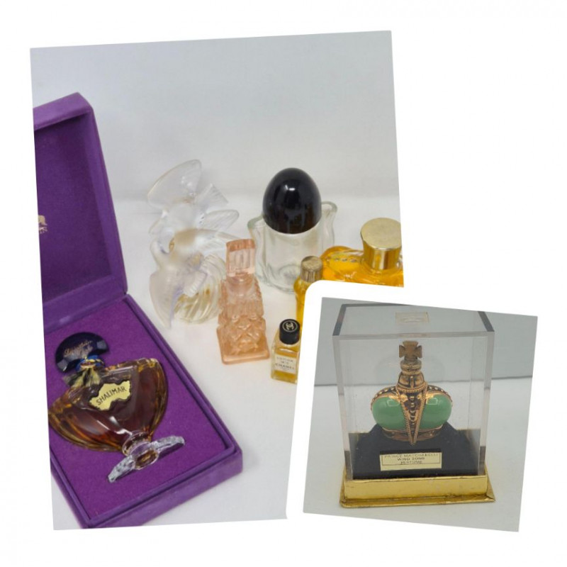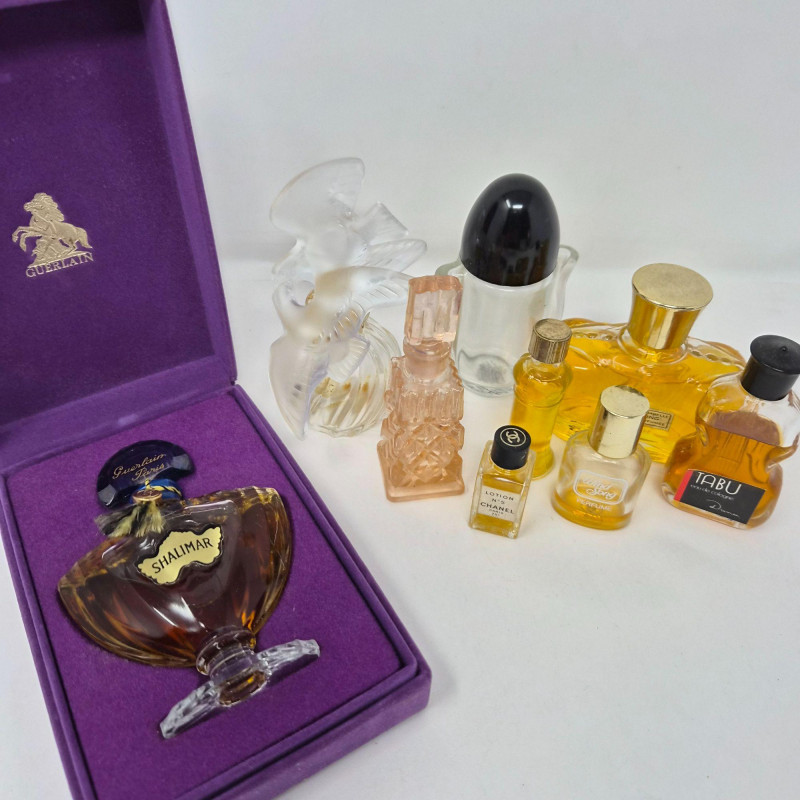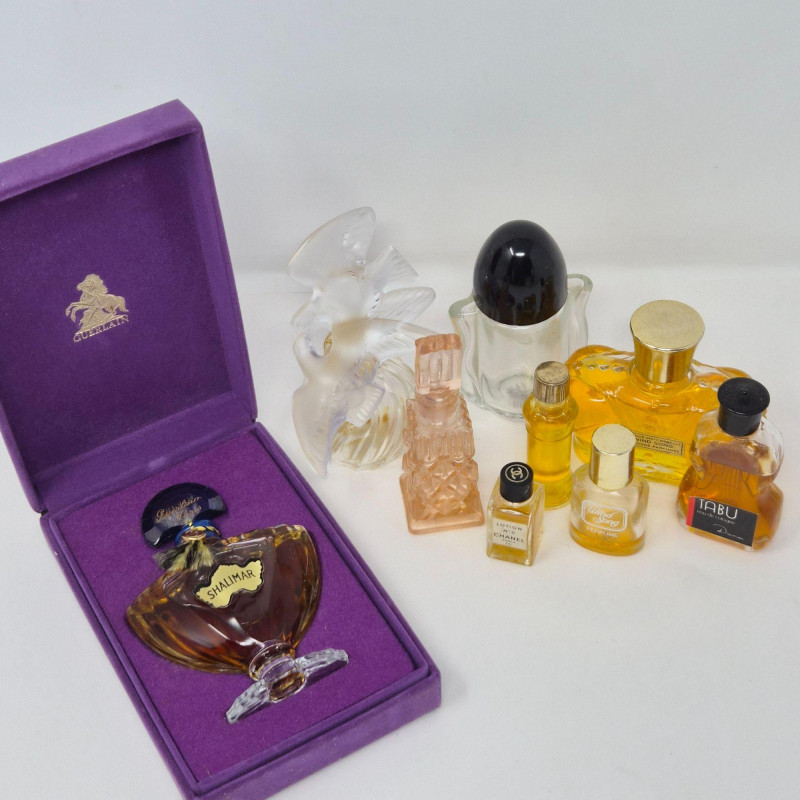 A graceful ensemble of collectible perfume bottles, anchored by a collectible, boxed Shalimar perfume glass bottle—a timeless symbol of elegance and allure. This lot includes: