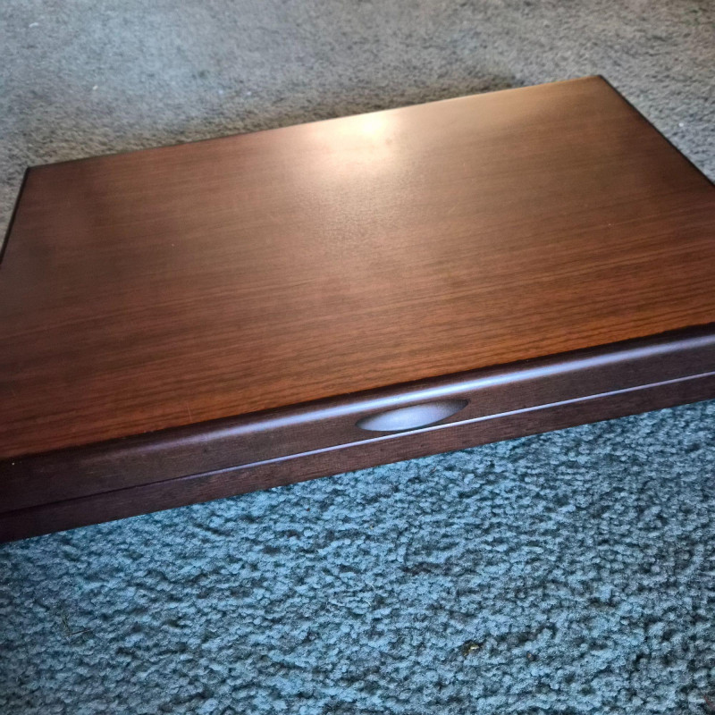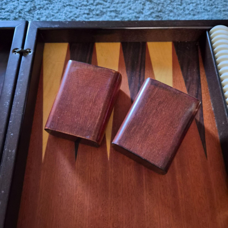 A beautifully crafted complete backgammon set housed in a sleek wood case, made in Italy. The board features traditional triangular points in alternating wood tones, with all components neatly stored inside: Elegant and ready for play, this set blends timeless strategy with Italian craftsmanship.