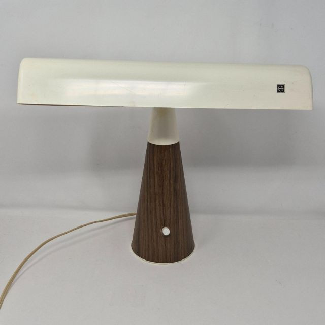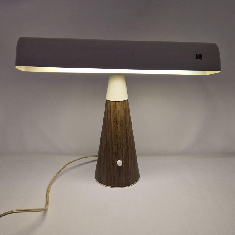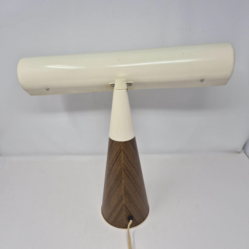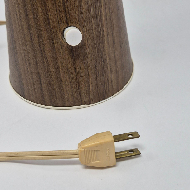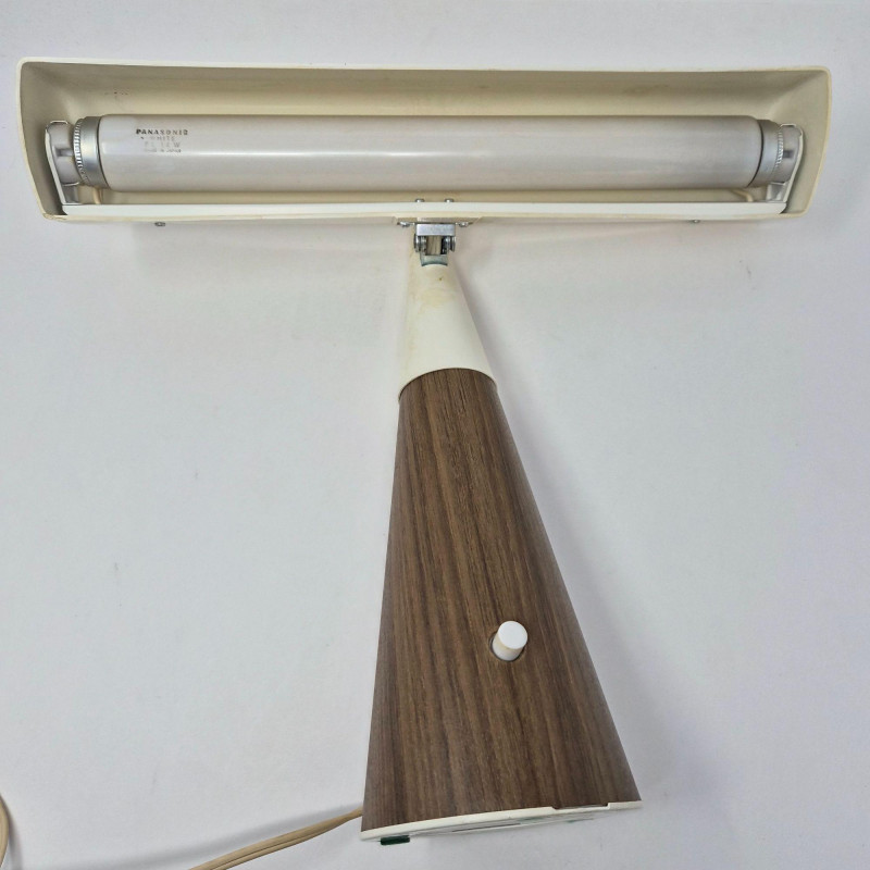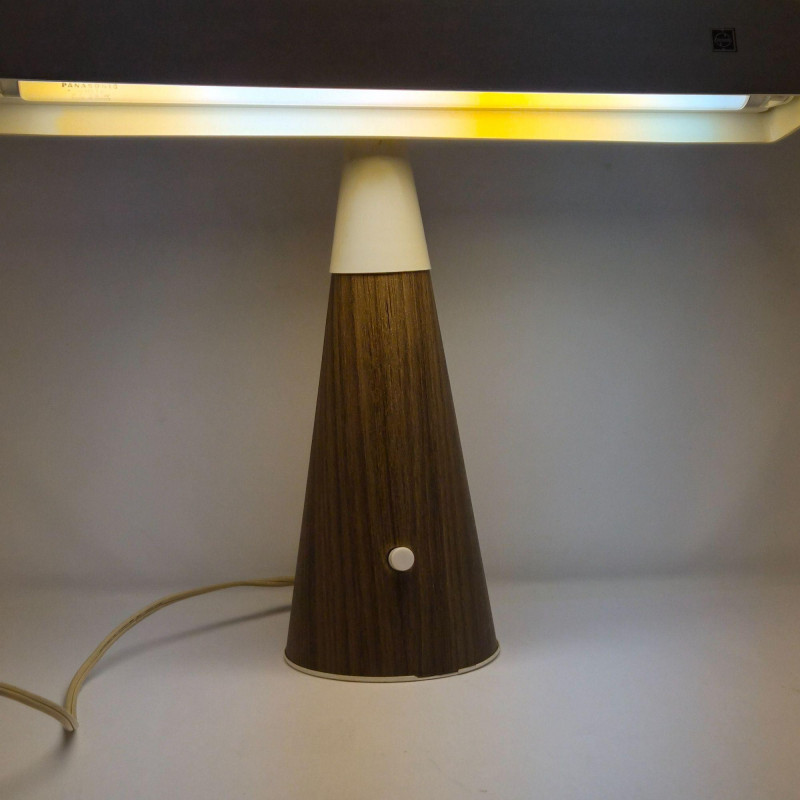 A sleek and sculptural vintage Panasonic desk lamp, featuring a distinctive cone-shaped design with metal base and arm finished in a wood-look. The plastic light housing adds contrast and mid-century charm.
