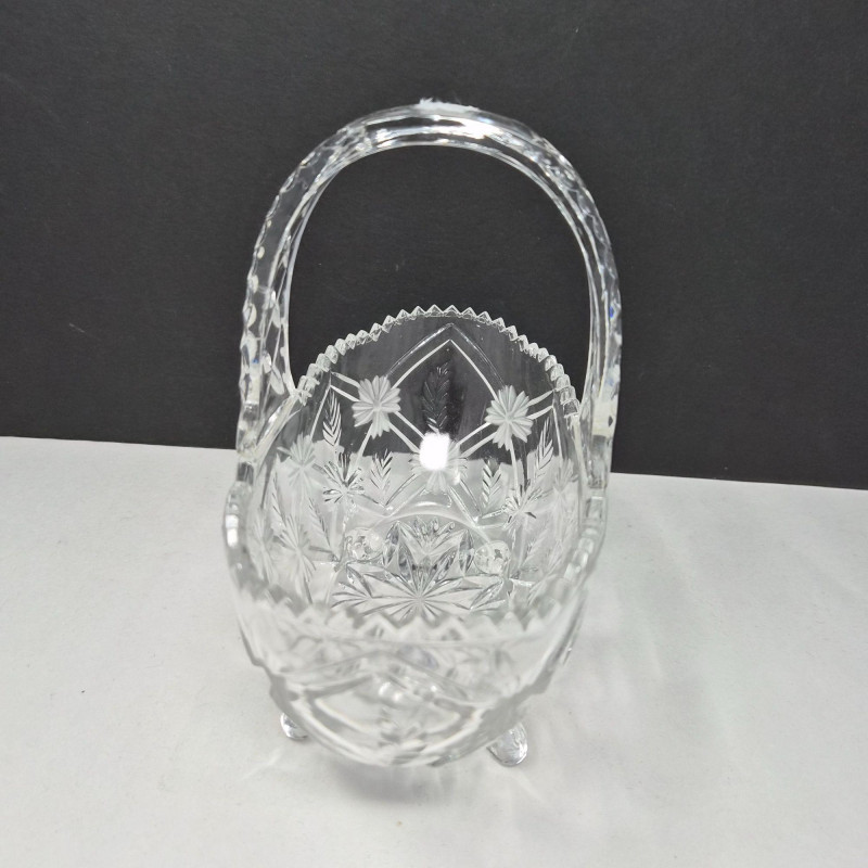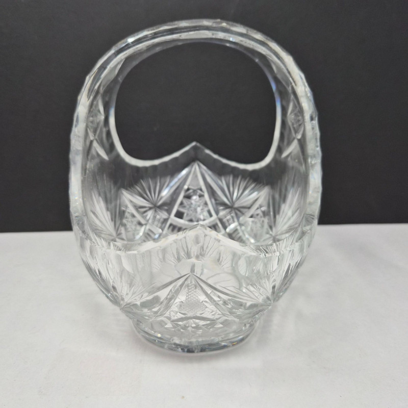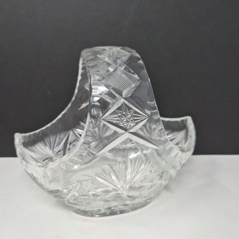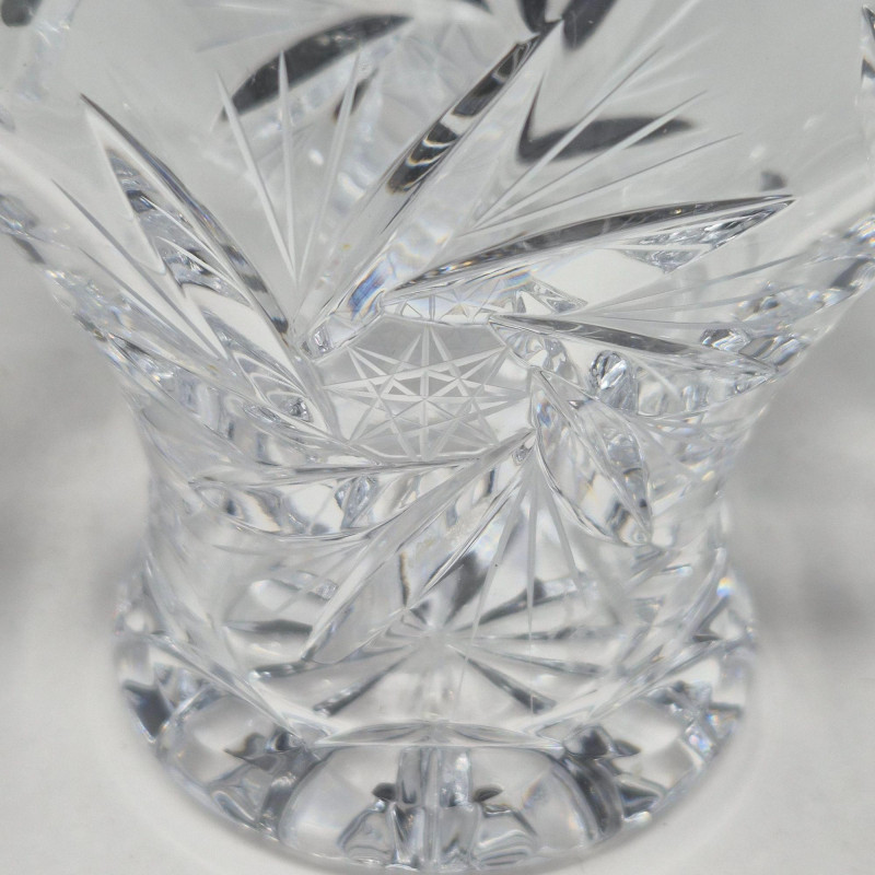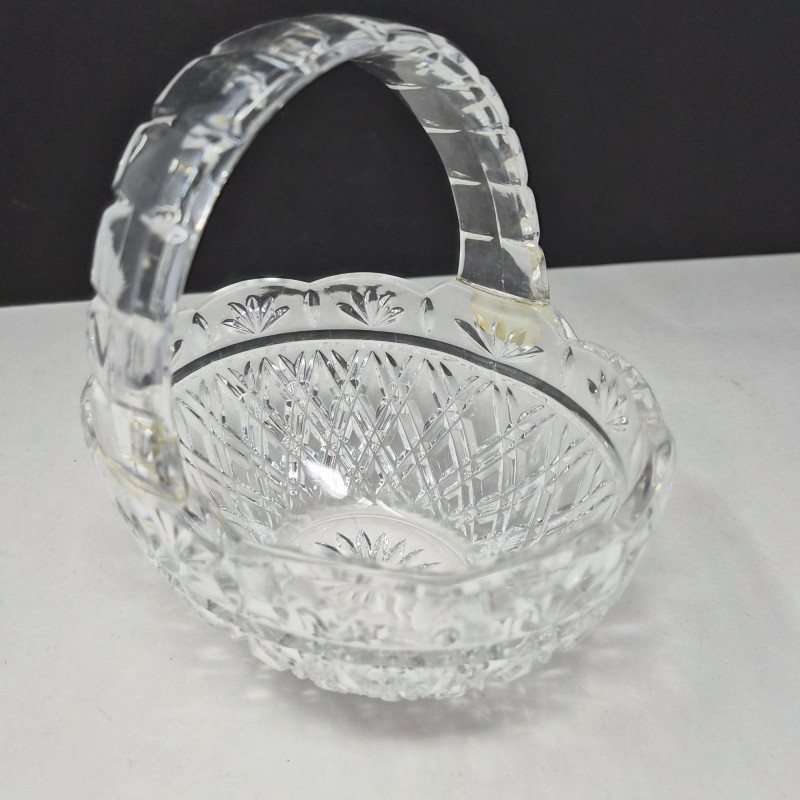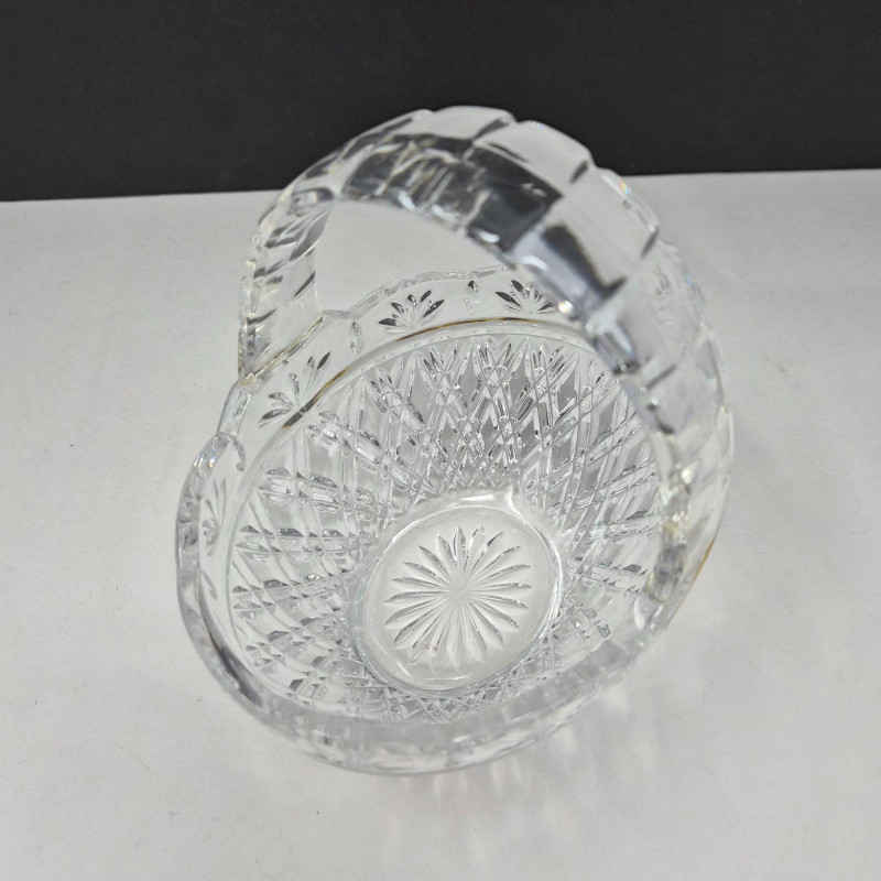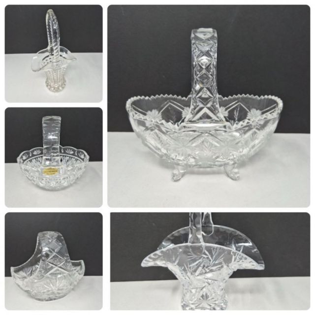 Set of five decorative crystal and cut glass baskets, each offering unique charm and craftsmanship: These baskets shimmer with light-catching facets and elegant silhouettes, ideal for display, gifting, or adding a touch of vintage sparkle to any space. A lovely mix for collectors of fine glassware or those curating a refined tabletop or curio cabinet.