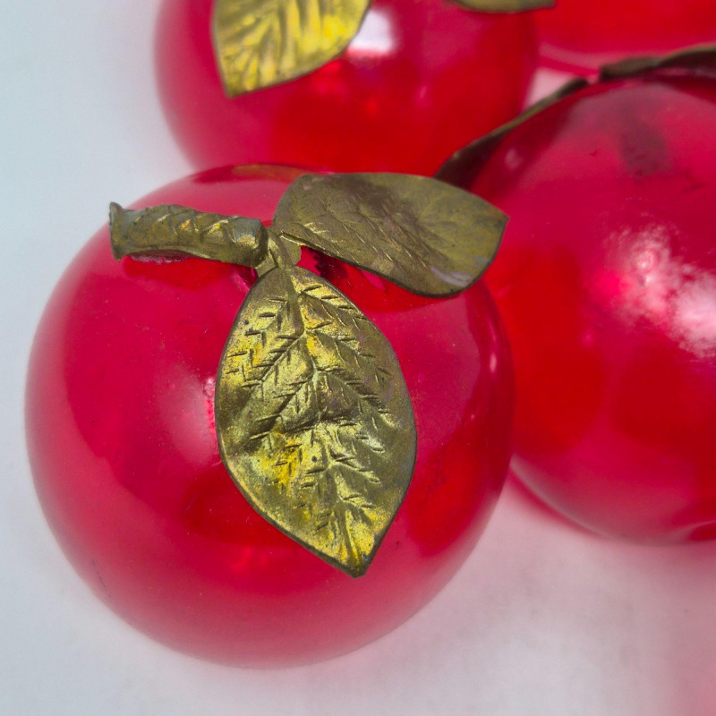 A charming set of 1960s Hong Horizons decorative glass apples, each hand-crafted with delicate artistry and finished with gold gilt leaves and stems. Measuring approximately 2.75", these petite glass fruits shimmer with vintage elegance.