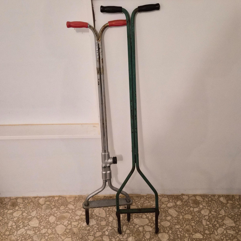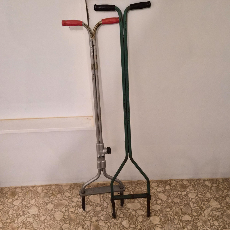 A practical duo of manual lawn coring aerators—essential tools for maintaining healthy, vibrant turf. Each aerator is designed to remove small plugs of soil, reducing compaction and allowing water, air, and nutrients to reach grass roots more effectively. Ideal for home gardeners, landscapers, or anyone looking to revitalize their lawn naturally. These tools offer a low-tech, high-impact solution for soil care and grass growth.