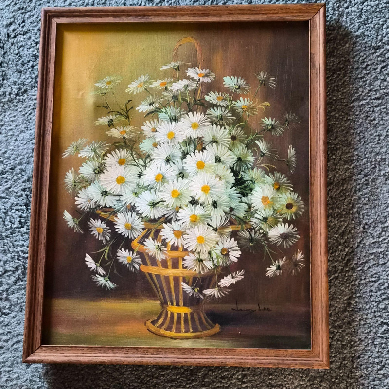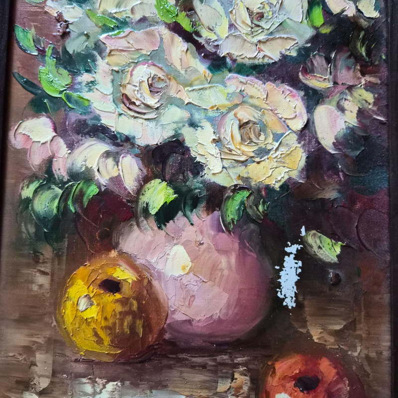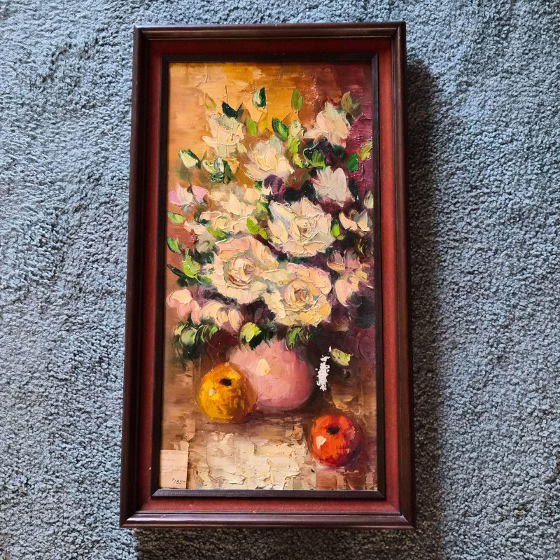A vibrant trio of original oil paintings, each celebrating florals through distinct artistic lenses. This lot includes: Together, these works offer a range of floral interpretations—from realism to abstraction—ideal for gallery walls, home décor, or collectors seeking original mid-century and contemporary oil works.