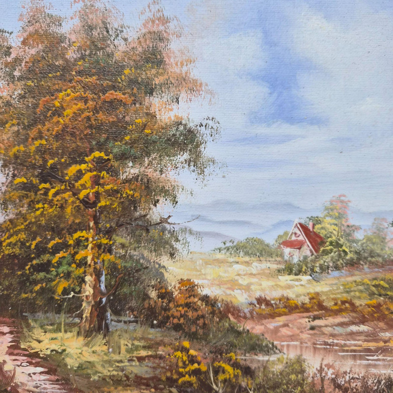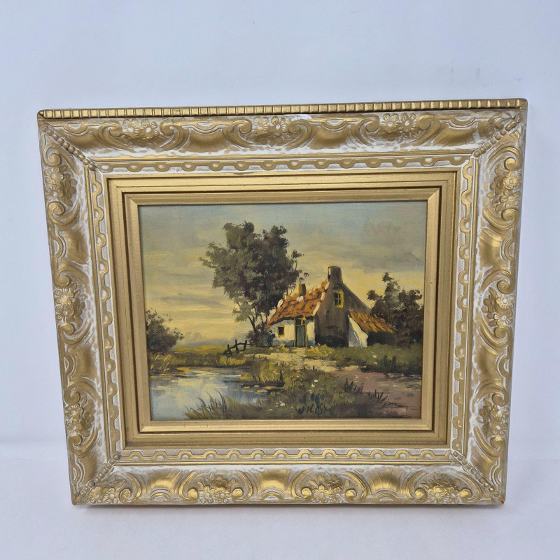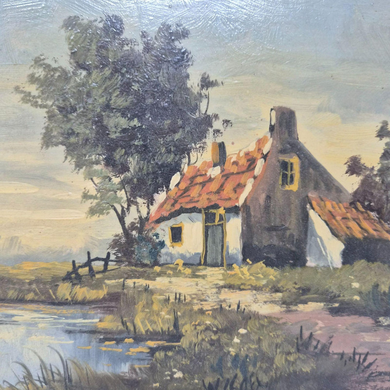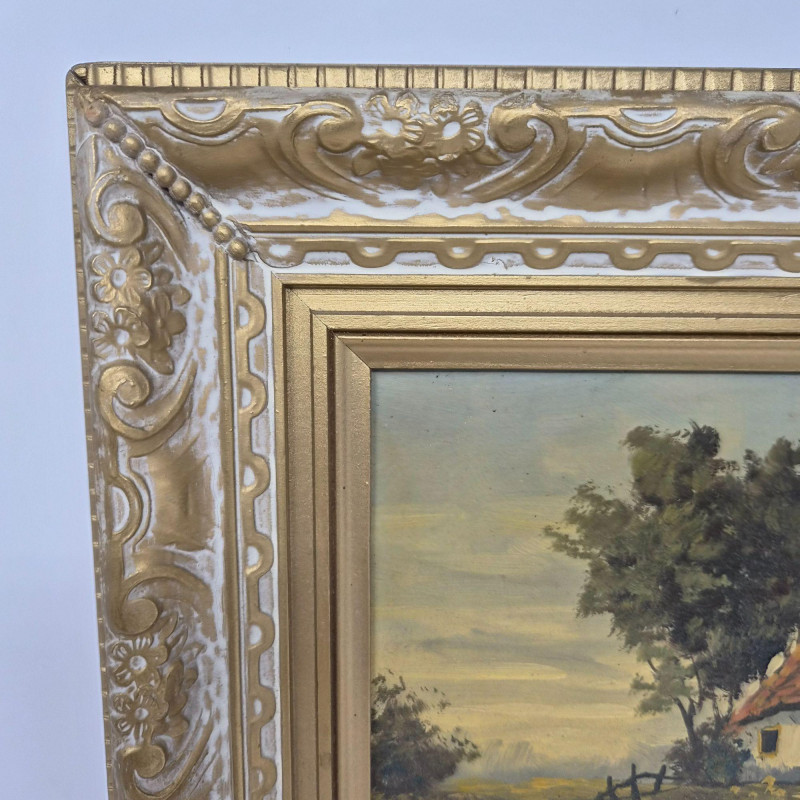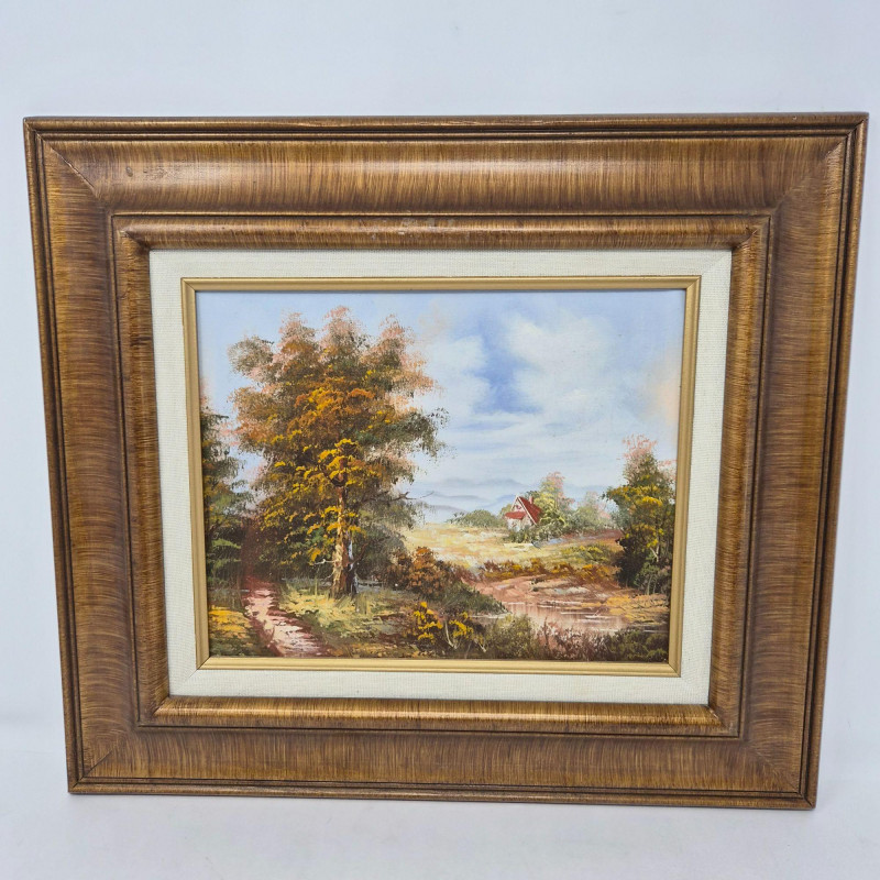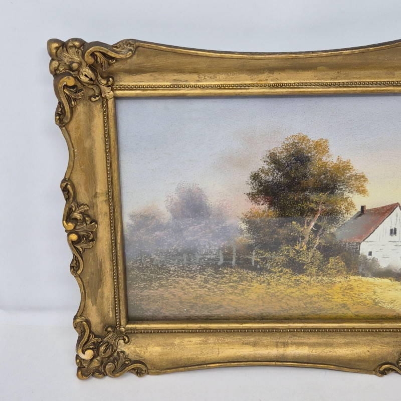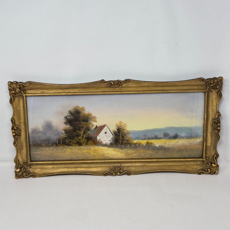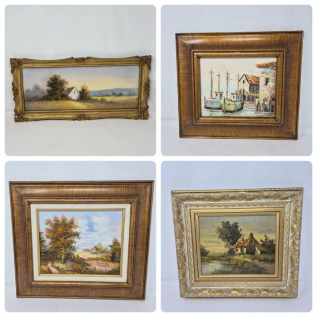 A serene quartet of framed countryside paintings, each evoking quiet beauty and rustic nostalgia: Together, these pieces offer a harmonious blend of farmhouse charm, European influence, and decorative versatility—ideal for gallery walls, cottage interiors, or collectors of vintage landscape art.