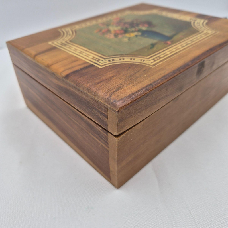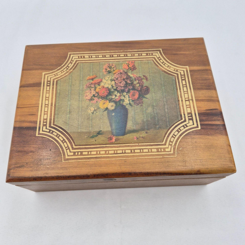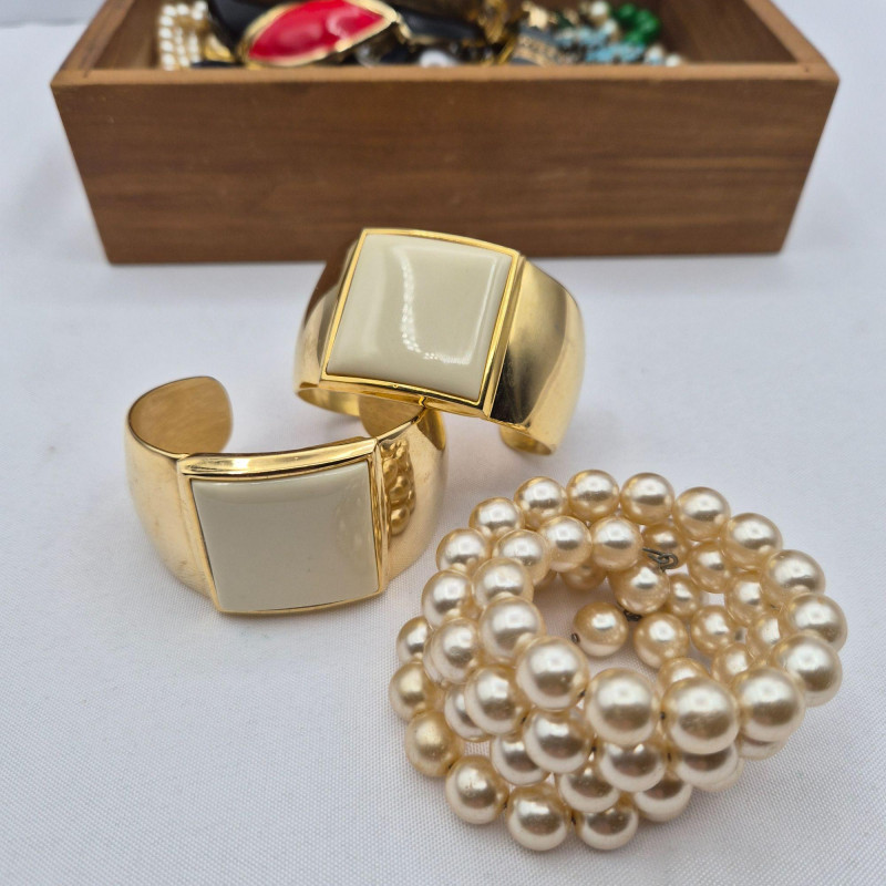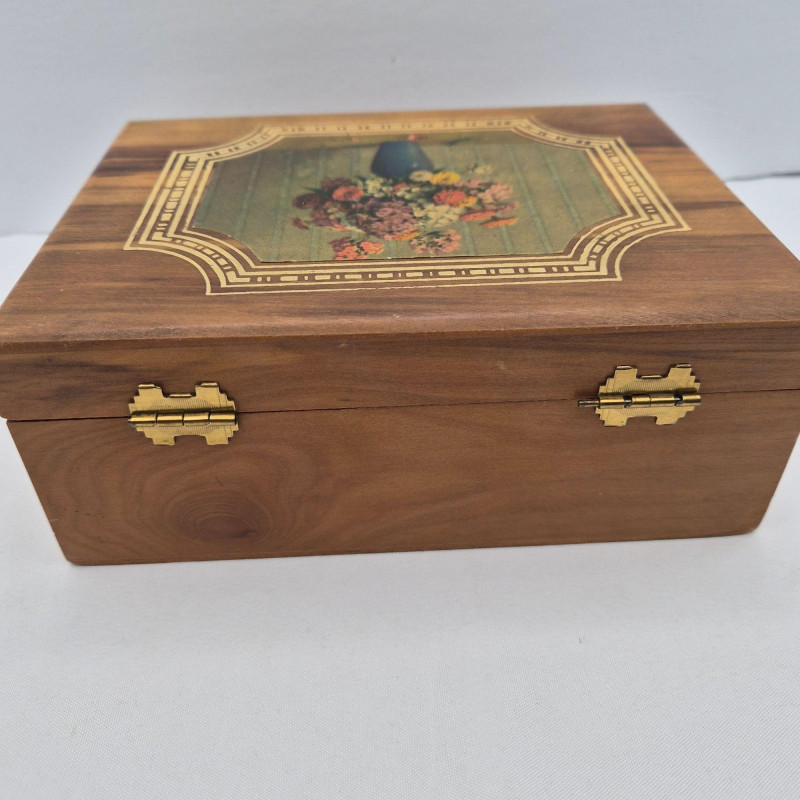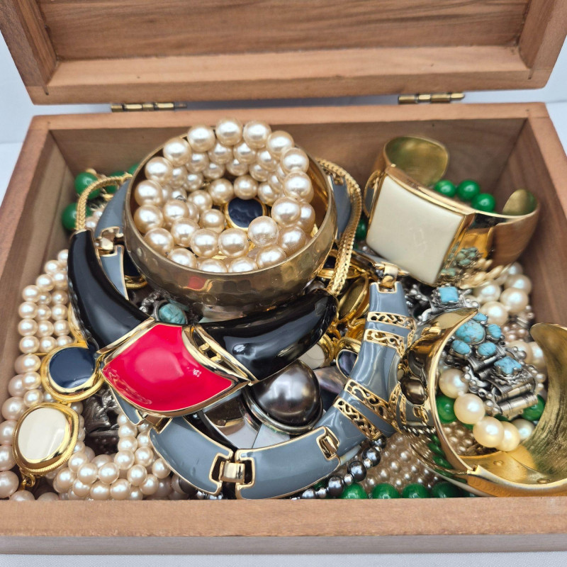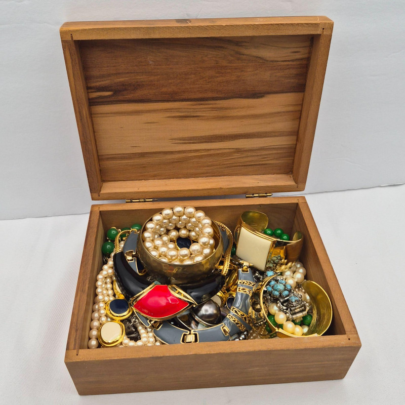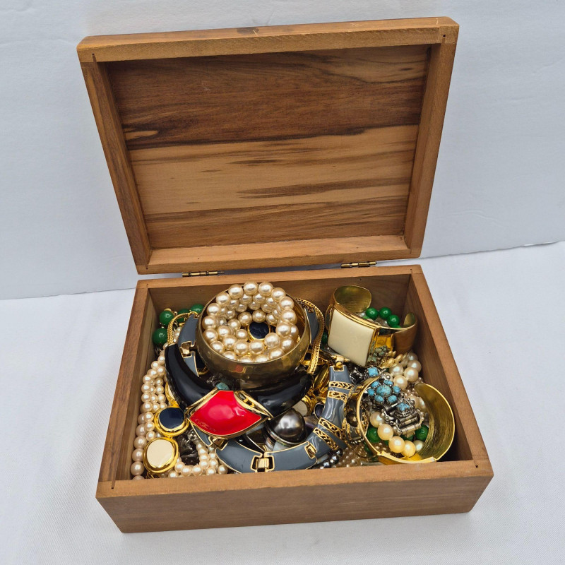 Wood jewelry box packed with vintage statement jewelry, rich in color, texture, and personality. Measuring 8" wide x 6.25" deep x 3" tall, this treasure chest includes: