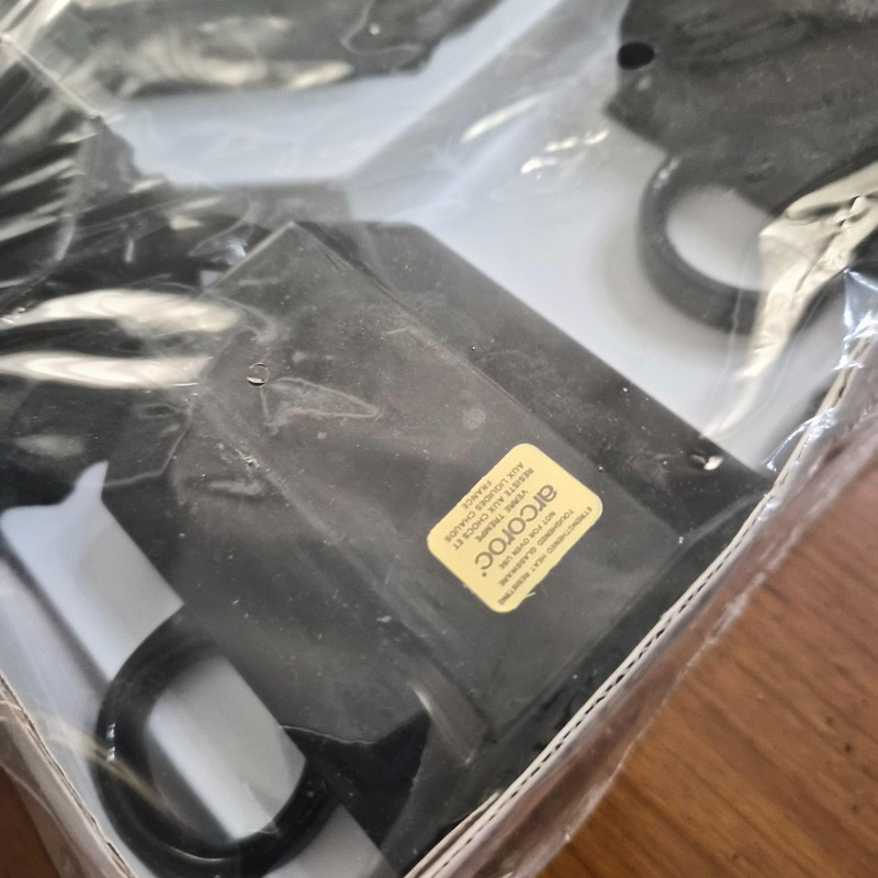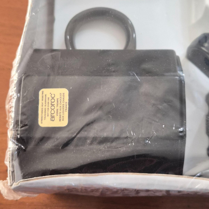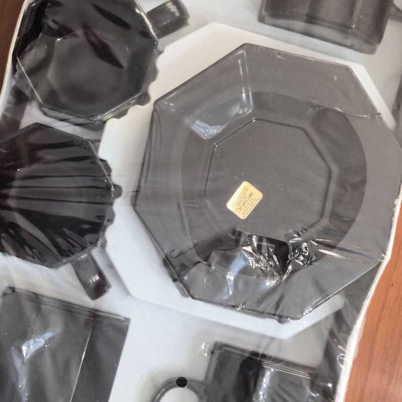 A striking set of six black Arcoroc glass cups and saucers, octagon shape, still housed in their original packaging. Known for their sleek, minimalist design and durable tempered glass, these pieces offer: Perfect for fans of retro French glassware, minimalist aesthetics, or anyone seeking a bold accent for their coffee or tea service