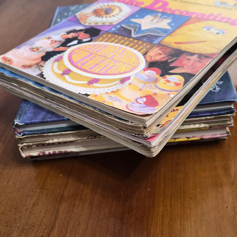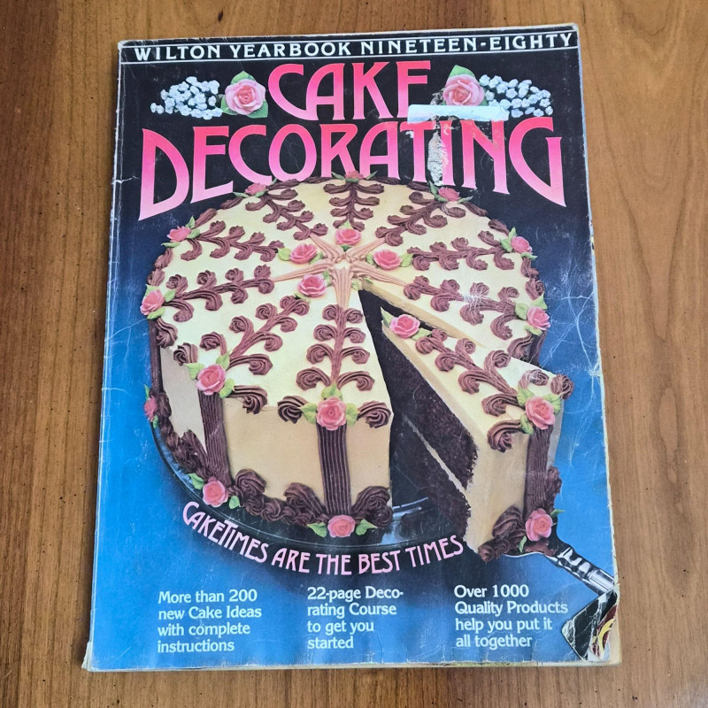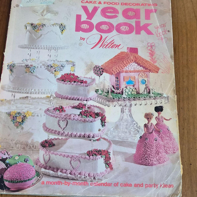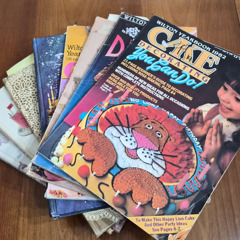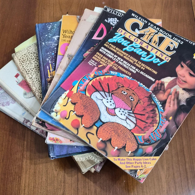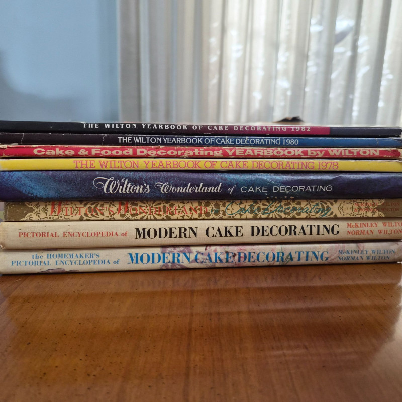 A delightful collection of Wilton cake baking and decorating cookbooks from the 1970s and 1980s, featuring both hardback and paperback editions. These vintage volumes include: