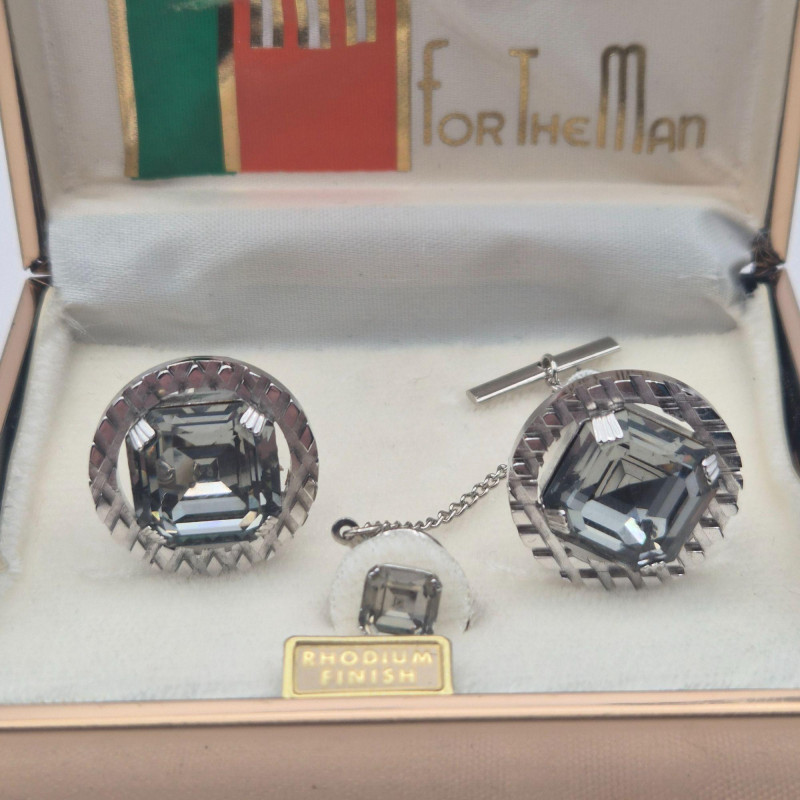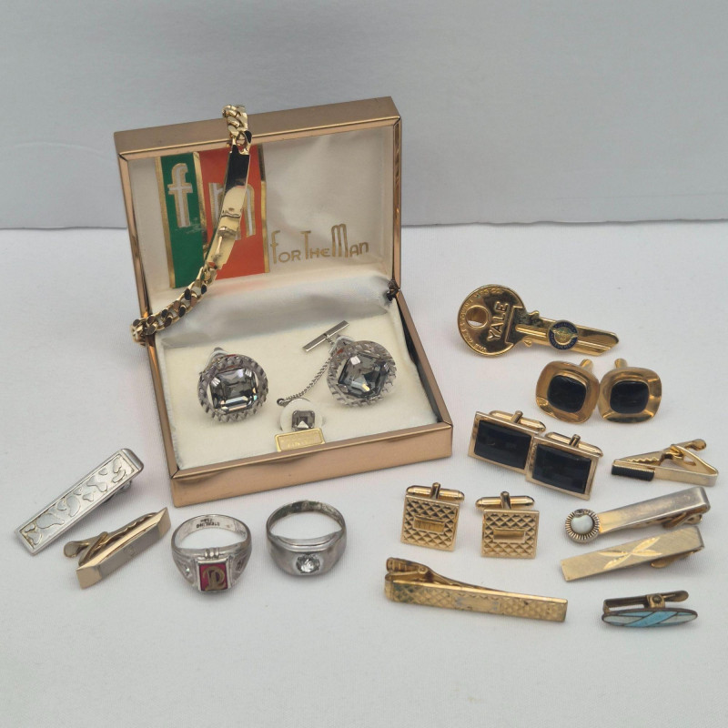 Lot # 188 - Men’s Jewelry Mix – Sterling Rings, Crystal Cufflinks & Tie Tac Set