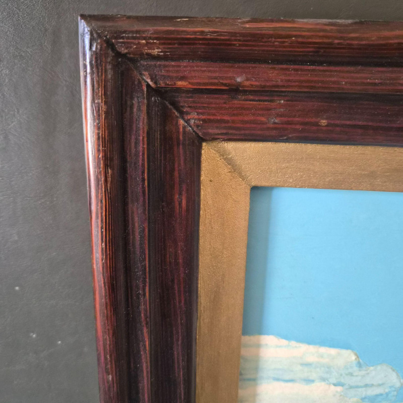 A richly textured 3-D relief oil painting on board, depicting a rustic cabin nestled in nature, framed and ready to hang. This sculptural artwork features: