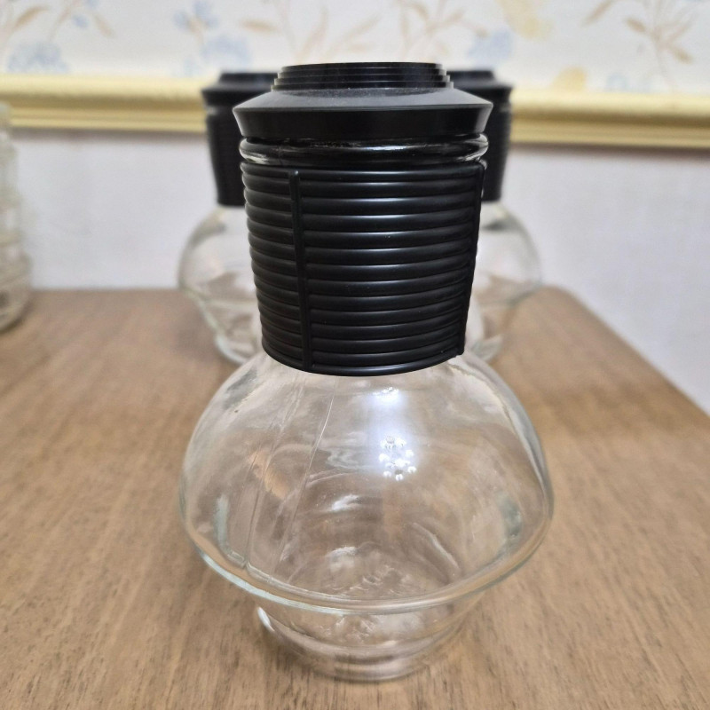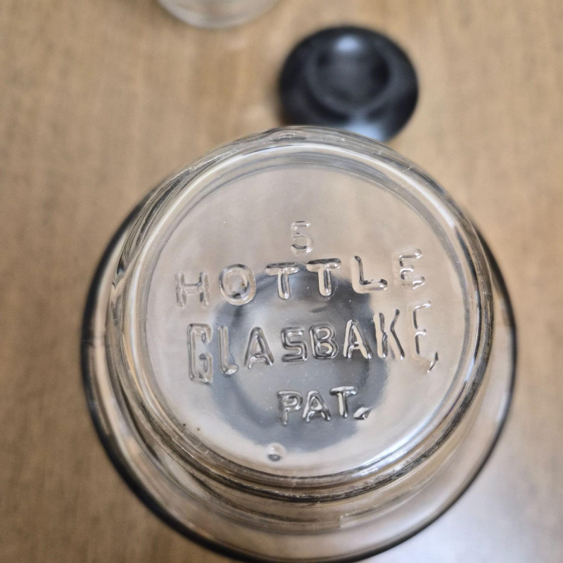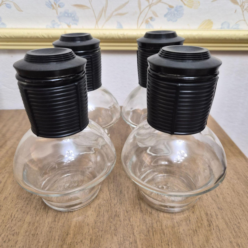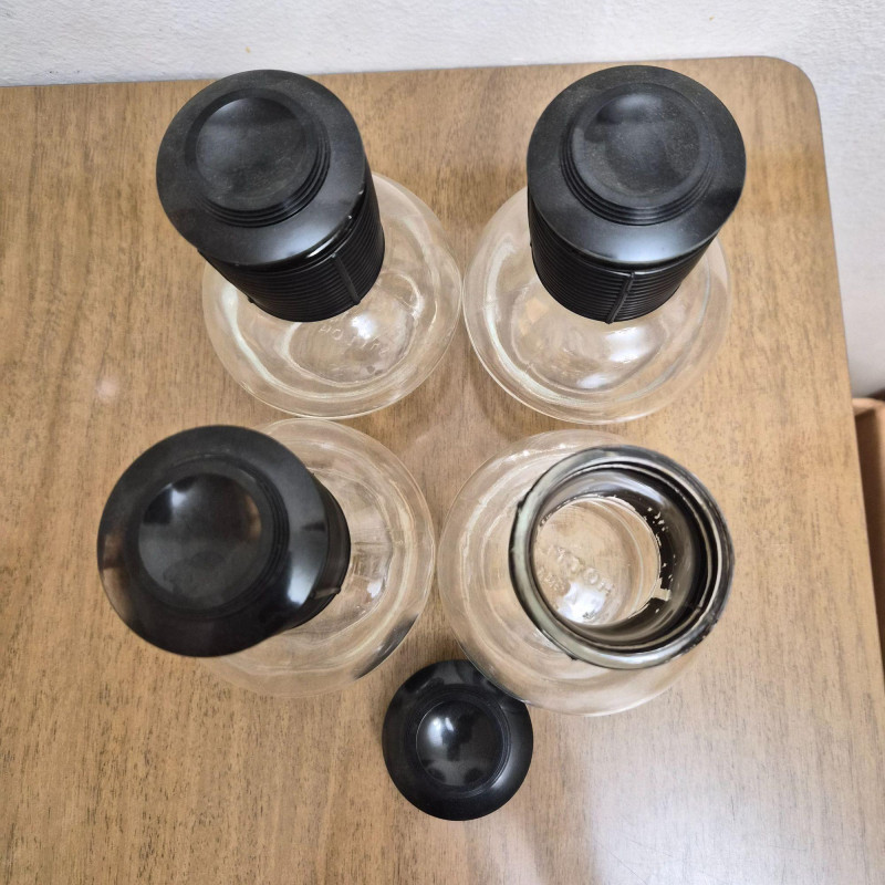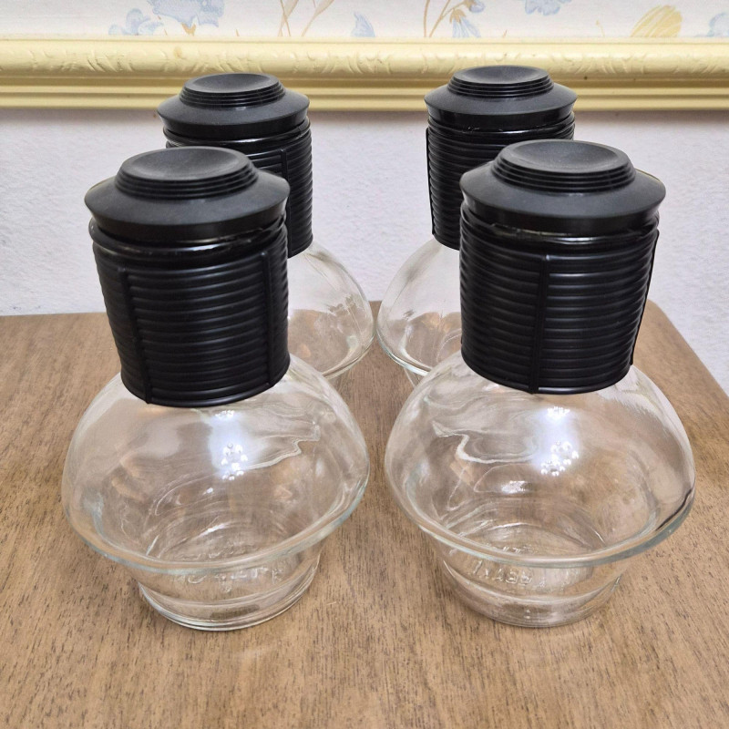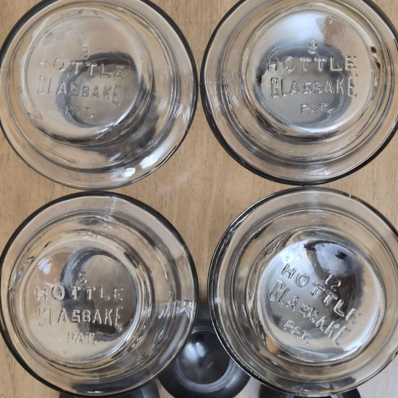 quartet of 1950s Glasbake hot water Hottles, each designed to hold approximately 12oz of warm beverage or water. These glass servers feature classic black stopper lids and molded handles, with embossed numbers on the base—3, 5, 9, and 12—adding a touch of mystery and production history. Originally used in hospitals, hotels, and home kitchens, these Hottles now serve as nostalgic collectibles or charming vessels for display. Durable, functional, and steeped in mid-century utility.