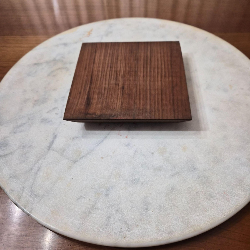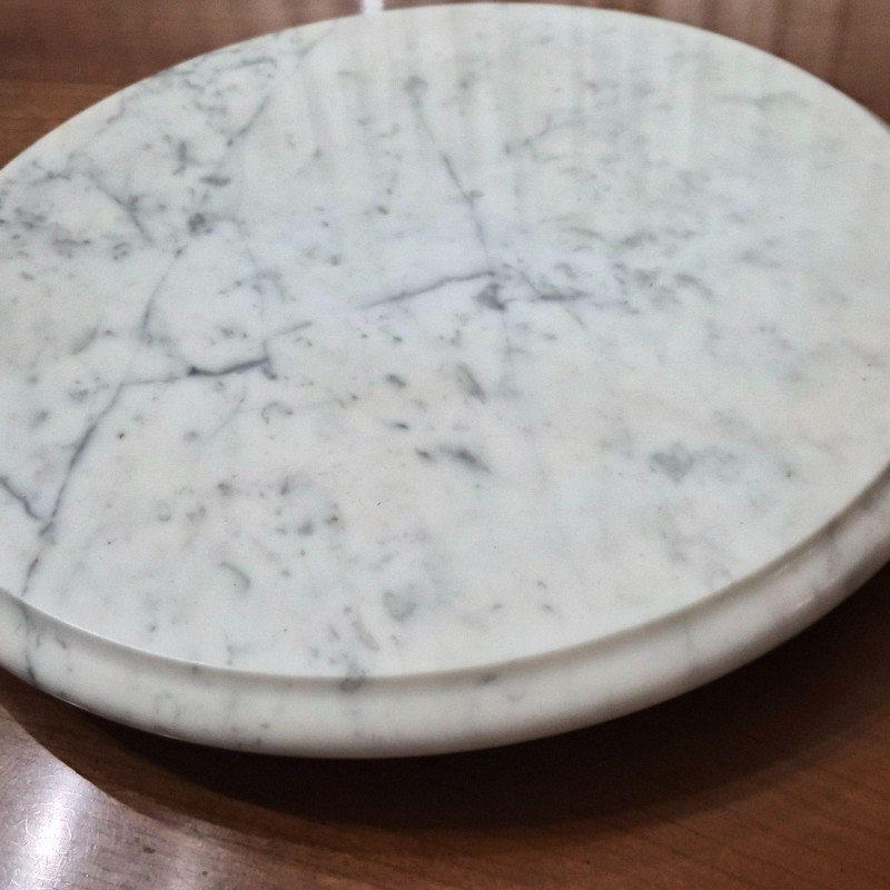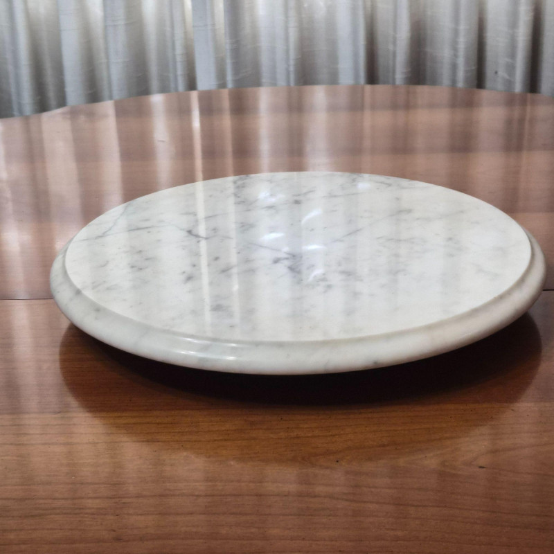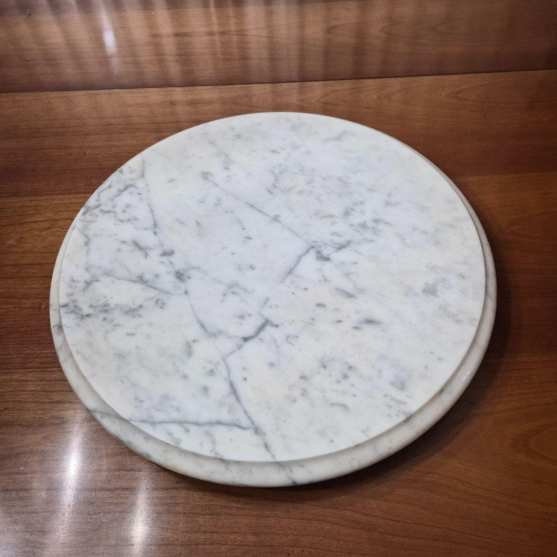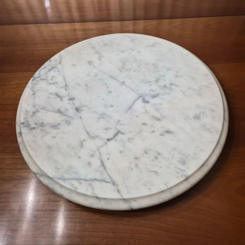 15" round, heavy marbled wood base lazy Susan. White with dark grey marbling & beveled edge. Perfect for table centerpiece, condiment holder or display platter.