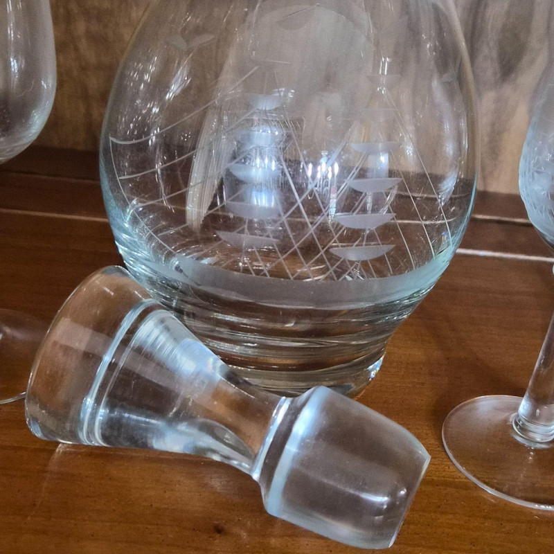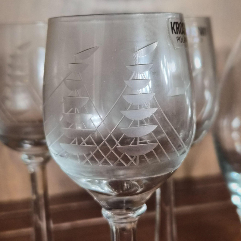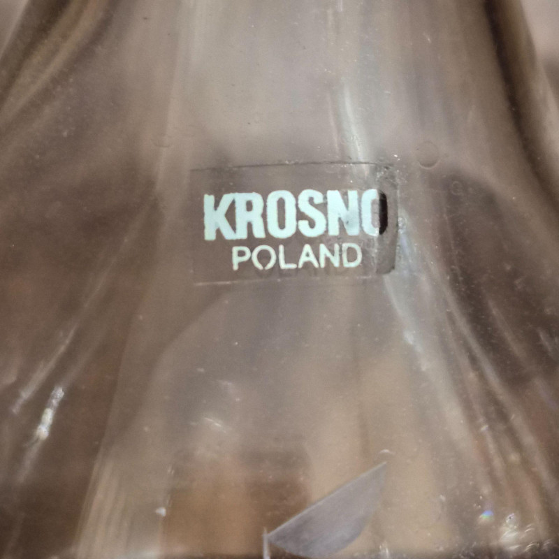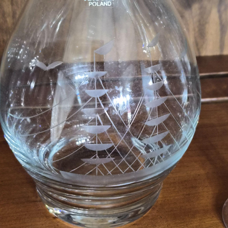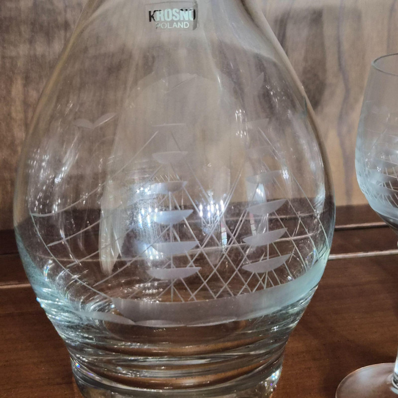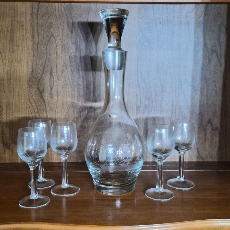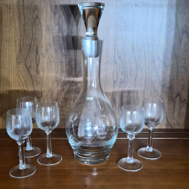 12" tall etched crystal decanter with five matching brandy glasses. All have Krosno Poland sticker still attached.
